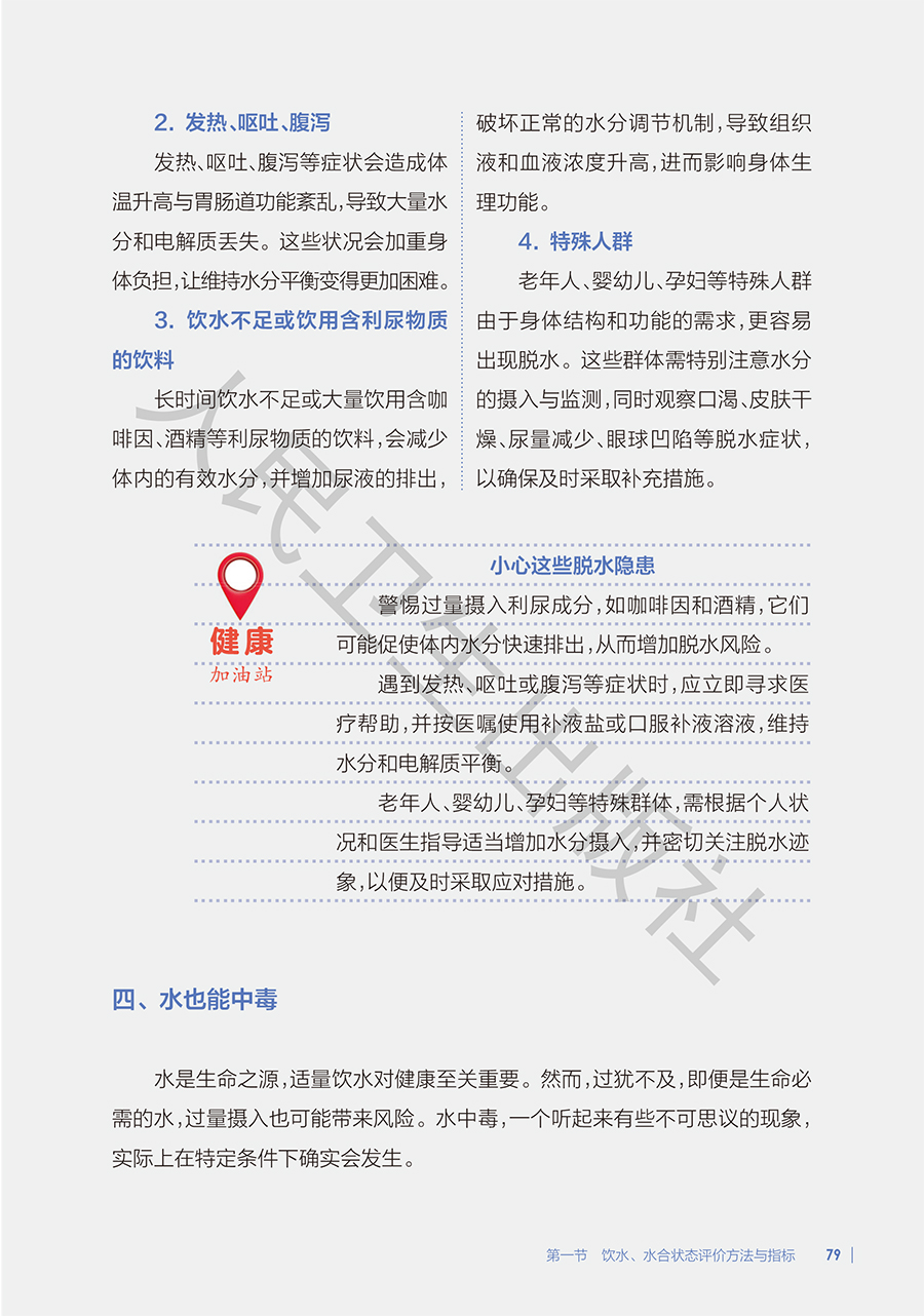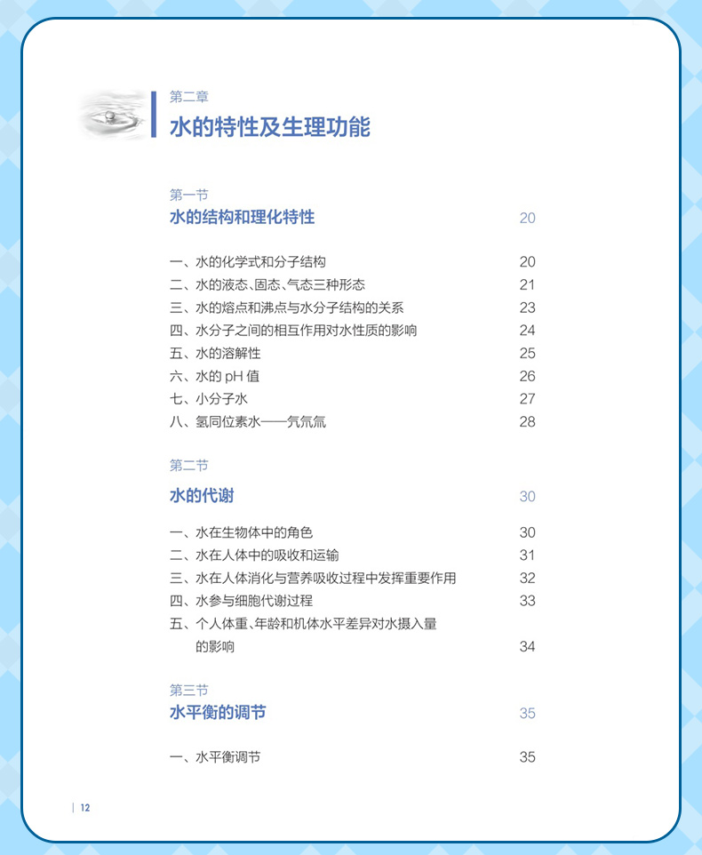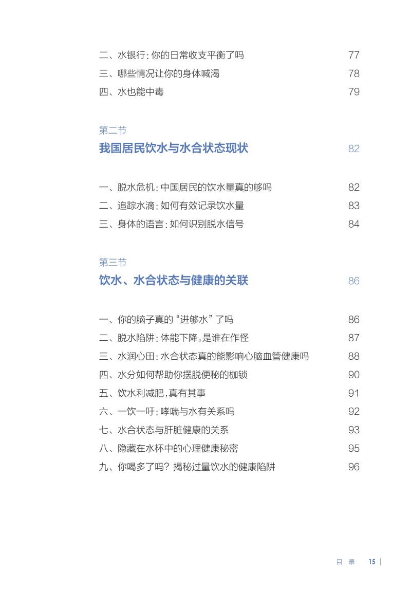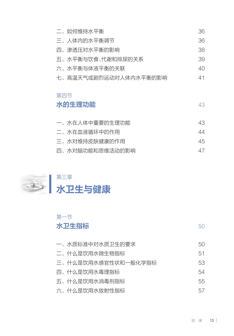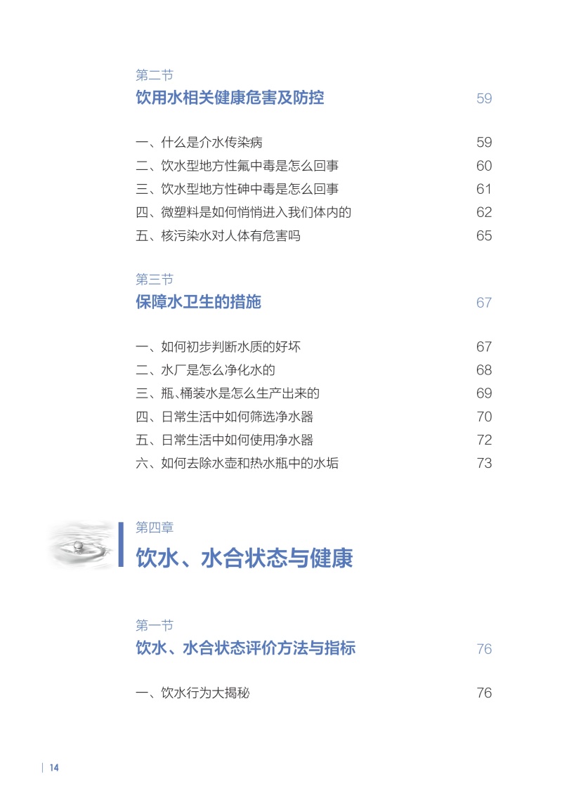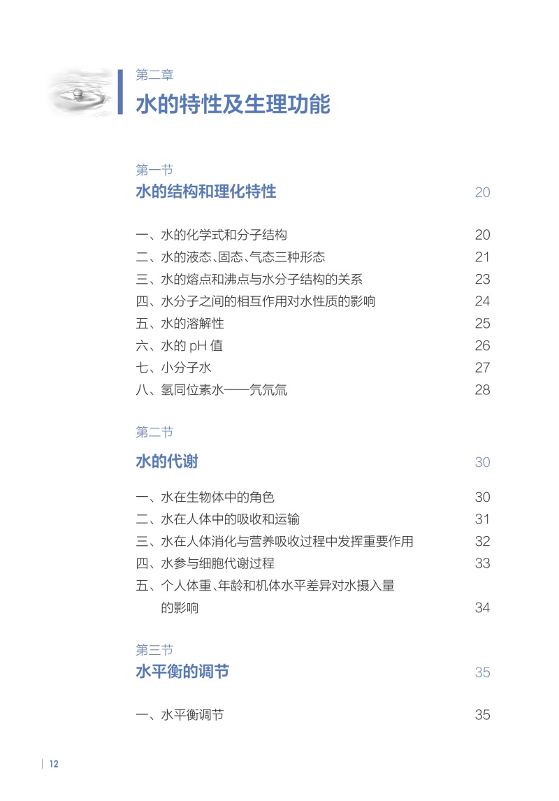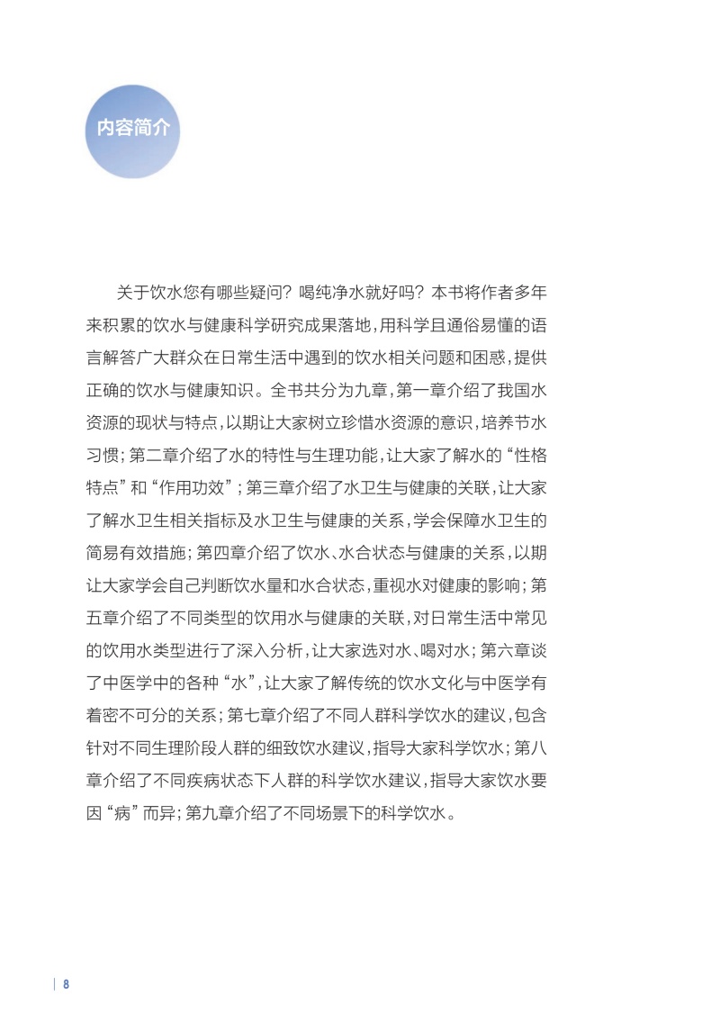 第一章水资源 第一节神奇的水世界/2 一、水为什么是生命之源/2 二、地球上到底有多少水/3 三、什么是水循环/5 第二节我国水资源状况/7 一、我国降水有什么特点/7 二、我国有多少河流/8 三、我国缺水吗/9 四、气候变化对水资源有什么影响/11 第三节我国供水安全状况/13 一、我国供水保障能力处于什么水平/13 二、为什么要保护水源地/14 第四节节水在行动/16 一、什么是节水型社会/16 二、如何培养良好的节水习惯/18 第二章水的特性及生理功能 第一节水的结构和理化特性/20 一、水的化学式和分子结构/20 二、水的液态、固态、气态三种形态/21 三、水的熔点和沸点与水分子结构的关系/23 四、水分子之间的相互作用对水性质的影响/24 五、水的溶解性/25 六、水的pH值/26 七、小分子水/27 八、氢同位素水——氕氘氚/28 第二节水的代谢/30 一、水在生物体中的角色/30 二、水在人体中的吸收和运输/31 三、水在人体消化与营养吸收过程中发挥重要作用/32 四、水参与细胞代谢过程/33 五、个人体重、年龄和机体水平差异对水摄入量的影响/34 第三节水平衡的调节/35 一、水平衡调节/35 二、如何维持水平衡/36 三、人体内的水平衡调节/36 四、渗透压对水平衡的影响/38 五、水平衡与饮食、代谢和排尿的关系/39 六、水平衡与体液平衡的关联/40 七、高温天气或剧烈运动对人体内水平衡的影响/41 第四节水的生理功能/43 一、水在人体中重要的生理功能/43 二、水在血液循环中的作用/44 三、水对维持皮肤健康的作用/45 四、水对脑功能和思维活动的影响/47 第三章水卫生与健康 第一节水卫生指标/50 一、水质标准中对水质卫生的要求/50 二、什么是饮用水微生物指标/51 三、什么是饮用水感官性状和一般化学指标/53 四、什么是饮用水毒理指标/54 五、什么是饮用水消毒剂指标/55 六、什么是饮用水放射性指标/57 第二节饮用水相关健康危害及防控/59 一、什么是介水传染病/59 二、饮水型地方性氟中毒是怎么回事/60 三、饮水型地方性砷中毒是怎么回事/61 四、微塑料是如何悄悄进入我们体内的/62 五、核污染水对人体有危害吗/65 第三节保障水卫生的措施/67 一、如何初步判断水质的好坏/67 二、水厂是怎么净化水的/68 三、瓶、桶装水是怎么生产出来的/69 四、日常生活中如何筛选净水器/70 五、日常生活中如何使用净水器/72 六、如何去除水壶和热水瓶中的水垢/73 第四章饮水、水合状态与健康 第一节饮水、水合状态评价方法与指标/76 一、饮水行为大揭秘/76 二、水银行:你的日常收支平衡了吗/77 三、哪些情况让你的身体喊渴/78 四、水也能中毒/79 第二节我国居民饮水与水合状态现状/82 一、脱水危机:中国居民的饮水量真的够吗/82 二、追踪水滴:如何有效记录饮水量/83 三、身体的语言:如何识别脱水信号/84 第三节饮水、水合状态与健康的关联/86 一、你的脑子真的“进够水”了吗/86 二、脱水陷阱:体能下降,是谁在作怪/87 三、水润心田:水合状态真的能影响心脑血管健康吗/88 四、水分如何帮助你摆脱便秘的枷锁/90 五、饮水利减肥,真有其事/91 六、一饮一吁:哮喘与水有关系吗/92 七、水合状态与肝脏健康的关系/93 八、隐藏在水杯中的心理健康秘密/95 九、你喝多了吗?揭秘过量饮水的健康陷阱/96 第五章不同类型的饮用水与健康/ 第一节不同类型水的划分标准/100 一、饮用水类型划分有哪些权威标准/100 二、包装饮用水的种类及区别/101 三、含糖饮料包括哪些/102 四、什么是无糖饮料?什么是低糖饮料/104 五、鲜榨果汁和果蔬汁及果蔬饮料是一类吗/105 六、蛋白饮料都有哪些?你真的了解吗/107 七、乳饮料是乳制品吗/108 八、特殊用途饮料有哪些?适合哪些人/109 九、自泡茶和茶饮料是一回事吗/111 十、咖啡类饮料有哪些/112 第二节不同类型水与健康/114 一、纯净水和矿泉水应该如何选择/114 二、碱性水真的对健康有益吗/115 三、熟水是生活中常说的白开水吗/117 四、富氢水有益健康吗/118 五、营养素强化饮料有益健康吗/118 六、茶水有益健康吗/120 七、咖啡能不能喝?对健康是好还是坏/122 第六章谈谈中医学中的各种“水” 第一节中医学中的各种“水”/126 一、中医学中的“水”有哪些来源/126 二、中医学中的“水”有哪些功效/127 三、中药煎煮中如何用好“水”/129 四、水与茶、酒有关系吗/131 第二节身体中的水/132 一、身体中的水有特殊的名称吗/132 二、身体中的水液是怎样生成的/133 三、身体中的水液是怎样输布的/134 四、身体中的水液是怎样排泄的/136 五、“五液”是什么/137 第三节水与痰湿体质/139 一、水液代谢障碍的产物是什么/139 二、痰饮的形成与哪些因素有关/140 三、自然界的水湿会影响人体健康吗/142 四、如何判断痰湿体质/143 五、痰湿体质是怎样形成的/145 六、赤小豆、薏苡仁真的能利水吗/146 第四节水与消渴/148 一、什么是消渴/148 二、消渴与哪些脏腑有关/149 三、消渴如何治疗/151 第七章不同人群科学饮水 第一节婴幼儿科学饮水/154 一、0~6月龄婴儿需要喝水吗/154 二、0~6月龄婴儿水喝多了对健康有影响吗/155 三、7~12月龄婴儿需要多少水分/157 四、1岁以内婴儿可以喝蜂蜜水吗/158 五、1~3岁幼儿需要多少水分/159 第二节学龄前儿童科学饮水/161 一、4~6岁儿童需要多少水分/161 二、4~6岁儿童吃饭时可以喝水吗/162 三、4~6岁儿童可以喝含乳饮
