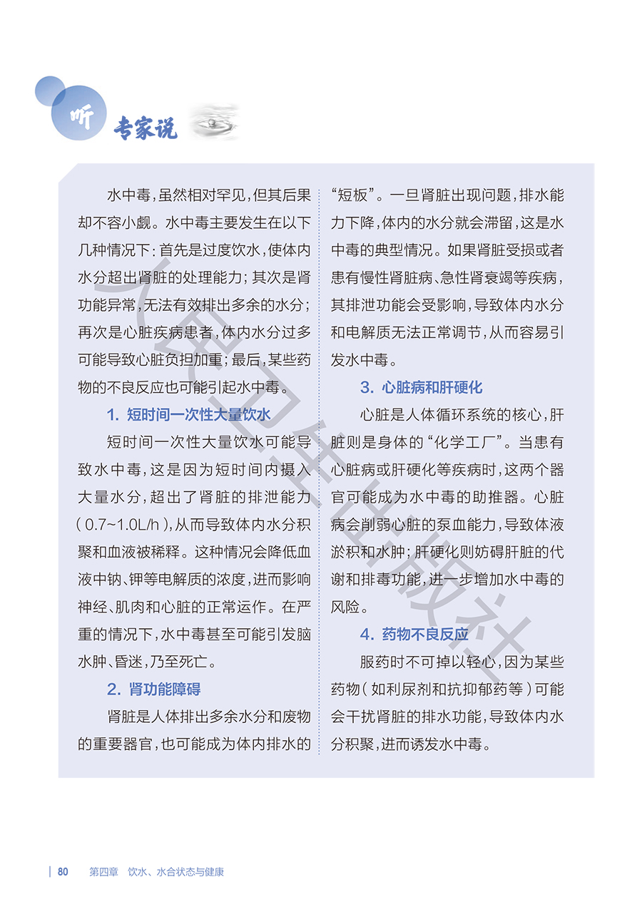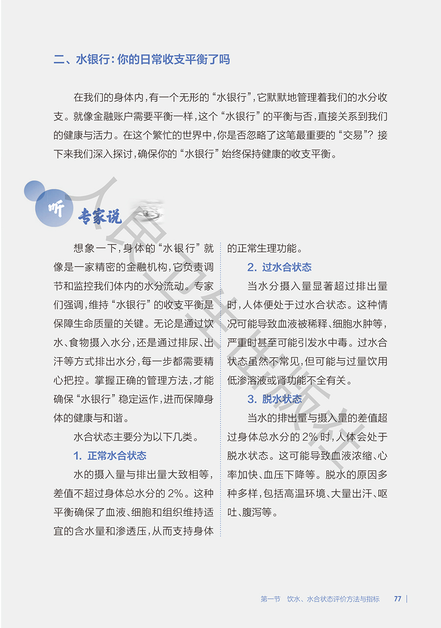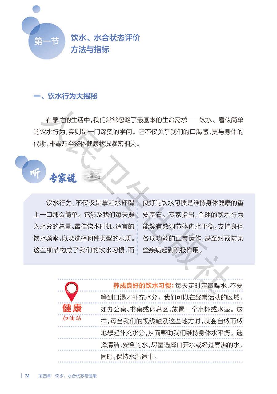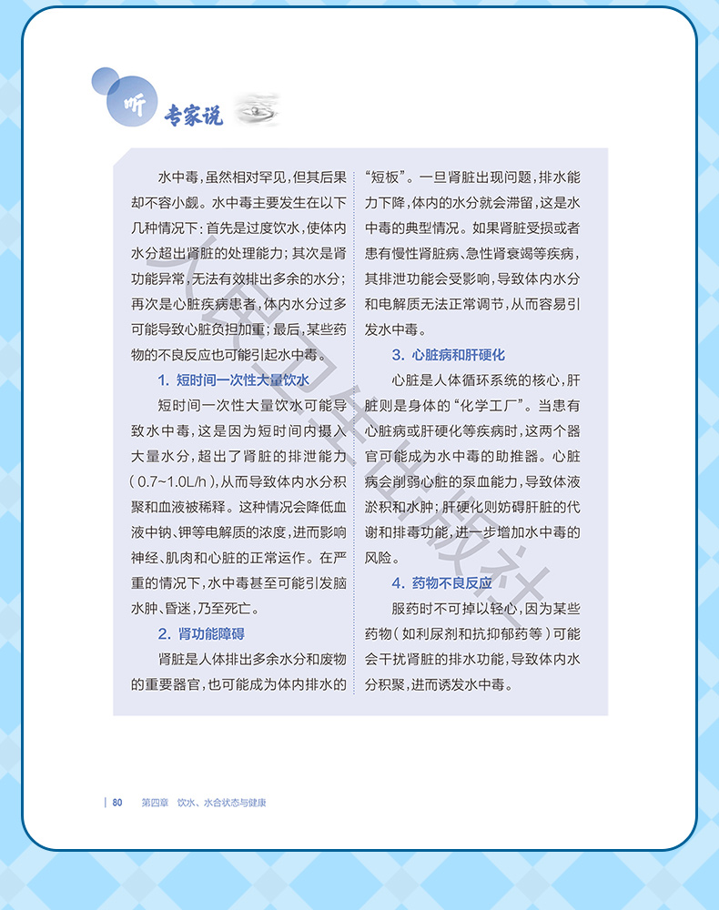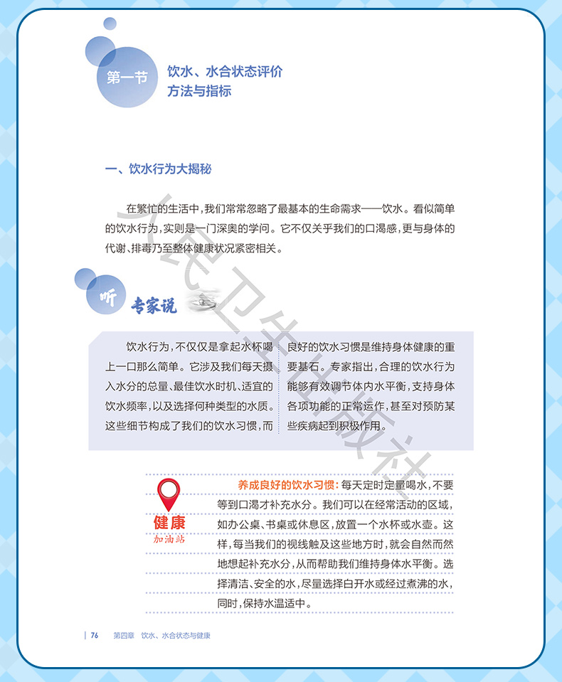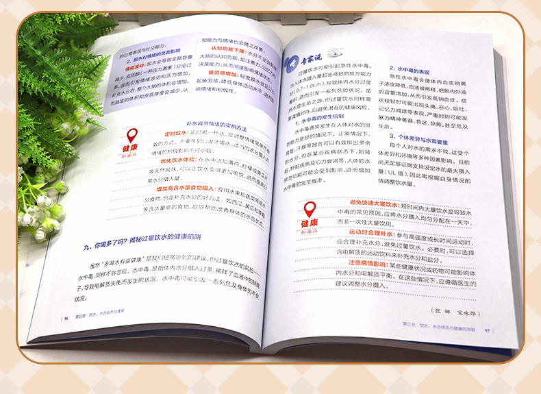 第一章水资源 第一节神奇的水世界/2 一、水为什么是生命之源/2 二、地球上到底有多少水/3 三、什么是水循环/5 第二节我国水资源状况/7 一、我国降水有什么特点/7 二、我国有多少河流/8 三、我国缺水吗/9 四、气候变化对水资源有什么影响/11 第三节我国供水安全状况/13 一、我国供水保障能力处于什么水平/13 二、为什么要保护水源地/14 第四节节水在行动/16 一、什么是节水型社会/16 二、如何培养良好的节水习惯/18 第二章水的特性及生理功能 第一节水的结构和理化特性/20 一、水的化学式和分子结构/20 二、水的液态、固态、气态三种形态/21 三、水的熔点和沸点与水分子结构的关系/23 四、水分子之间的相互作用对水性质的影响/24 五、水的溶解性/25 六、水的pH值/26 七、小分子水/27 八、氢同位素水——氕氘氚/28 第二节水的代谢/30 一、水在生物体中的角色/30 二、水在人体中的吸收和运输/31 三、水在人体消化与营养吸收过程中发挥重要作用/32 四、水参与细胞代谢过程/33 五、个人体重、年龄和机体水平差异对水摄入量的影响/34 第三节水平衡的调节/35 一、水平衡调节/35 二、如何维持水平衡/36 三、人体内的水平衡调节/36 四、渗透压对水平衡的影响/38 五、水平衡与饮食、代谢和排尿的关系/39 六、水平衡与体液平衡的关联/40 七、高温天气或剧烈运动对人体内水平衡的影响/41 第四节水的生理功能/43 一、水在人体中重要的生理功能/43 二、水在血液循环中的作用/44 三、水对维持皮肤健康的作用/45 四、水对脑功能和思维活动的影响/47 第三章水卫生与健康 第一节水卫生指标/50 一、水质标准中对水质卫生的要求/50 二、什么是饮用水微生物指标/51 三、什么是饮用水感官性状和一般化学指标/53 四、什么是饮用水毒理指标/54 五、什么是饮用水消毒剂指标/55 六、什么是饮用水放射性指标/57 第二节饮用水相关健康危害及防控/59 一、什么是介水传染病/59 二、饮水型地方性氟中毒是怎么回事/60 三、饮水型地方性砷中毒是怎么回事/61 四、微塑料是如何悄悄进入我们体内的/62 五、核污染水对人体有危害吗/65 第三节保障水卫生的措施/67 一、如何初步判断水质的好坏/67 二、水厂是怎么净化水的/68 三、瓶、桶装水是怎么生产出来的/69 四、日常生活中如何筛选净水器/70 五、日常生活中如何使用净水器/72 六、如何去除水壶和热水瓶中的水垢/73 第四章饮水、水合状态与健康 第一节饮水、水合状态评价方法与指标/76 一、饮水行为大揭秘/76 二、水银行:你的日常收支平衡了吗/77 三、哪些情况让你的身体喊渴/78 四、水也能中毒/79 第二节我国居民饮水与水合状态现状/82 一、脱水危机:中国居民的饮水量真的够吗/82 二、追踪水滴:如何有效记录饮水量/83 三、身体的语言:如何识别脱水信号/84 第三节饮水、水合状态与健康的关联/86 一、你的脑子真的“进够水”了吗/86 二、脱水陷阱:体能下降,是谁在作怪/87 三、水润心田:水合状态真的能影响心脑血管健康吗/88 四、水分如何帮助你摆脱便秘的枷锁/90 五、饮水利减肥,真有其事/91 六、一饮一吁:哮喘与水有关系吗/92 七、水合状态与肝脏健康的关系/93 八、隐藏在水杯中的心理健康秘密/95 九、你喝多了吗?揭秘过量饮水的健康陷阱/96 第五章不同类型的饮用水与健康/ 第一节不同类型水的划分标准/100 一、饮用水类型划分有哪些权威标准/100 二、包装饮用水的种类及区别/101 三、含糖饮料包括哪些/102 四、什么是无糖饮料?什么是低糖饮料/104 五、鲜榨果汁和果蔬汁及果蔬饮料是一类吗/105 六、蛋白饮料都有哪些?你真的了解吗/107 七、乳饮料是乳制品吗/108 八、特殊用途饮料有哪些?适合哪些人/109 九、自泡茶和茶饮料是一回事吗/111 十、咖啡类饮料有哪些/112 第二节不同类型水与健康/114 一、纯净水和矿泉水应该如何选择/114 二、碱性水真的对健康有益吗/115 三、熟水是生活中常说的白开水吗/117 四、富氢水有益健康吗/118 五、营养素强化饮料有益健康吗/118 六、茶水有益健康吗/120 七、咖啡能不能喝?对健康是好还是坏/122 第六章谈谈中医学中的各种“水” 第一节中医学中的各种“水”/126 一、中医学中的“水”有哪些来源/126 二、中医学中的“水”有哪些功效/127 三、中药煎煮中如何用好“水”/129 四、水与茶、酒有关系吗/131 第二节身体中的水/132 一、身体中的水有特殊的名称吗/132 二、身体中的水液是怎样生成的/133 三、身体中的水液是怎样输布的/134 四、身体中的水液是怎样排泄的/136 五、“五液”是什么/137 第三节水与痰湿体质/139 一、水液代谢障碍的产物是什么/139 二、痰饮的形成与哪些因素有关/140 三、自然界的水湿会影响人体健康吗/142 四、如何判断痰湿体质/143 五、痰湿体质是怎样形成的/145 六、赤小豆、薏苡仁真的能利水吗/146 第四节水与消渴/148 一、什么是消渴/148 二、消渴与哪些脏腑有关/149 三、消渴如何治疗/151 第七章不同人群科学饮水 第一节婴幼儿科学饮水/154 一、0~6月龄婴儿需要喝水吗/154 二、0~6月龄婴儿水喝多了对健康有影响吗/155 三、7~12月龄婴儿需要多少水分/157 四、1岁以内婴儿可以喝蜂蜜水吗/158 五、1~3岁幼儿需要多少水分/159 第二节学龄前儿童科学饮水/161 一、4~6岁儿童需要多少水分/161 二、4~6岁儿童吃饭时可以喝水吗/162 三、4~6岁儿童可以喝含乳饮