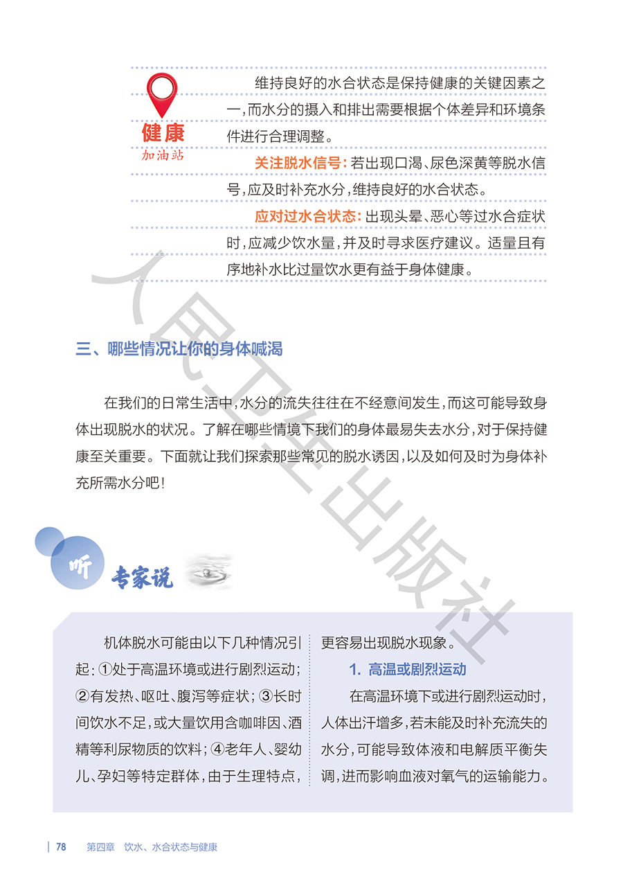 关于饮水您有哪些疑问?喝纯净水就好吗?本书主要包括水的特性以及生理调节机制、水卫生与健康、水合状态与健康、不同饮水类型与健康、水与中医及科学饮水方式等内容。本书将作者多年来积累的饮水与健康科学研究结果落地,用通俗易懂且科学的语言解答广大群众在日常生活中遇到的实际饮水相关问题和困惑,提供正确的饮水与健康知识,教会大家将饮水与健康知识融入和应用到实际生活中,指导自己更好地提高饮水与健康素养,改善饮水行为,改善水合状态,进而达到促进身体健康的最终目的。本书内容丰富、全面,语言通俗易懂,配有精美插图,使得内容更加生动形象,便于读者理解。