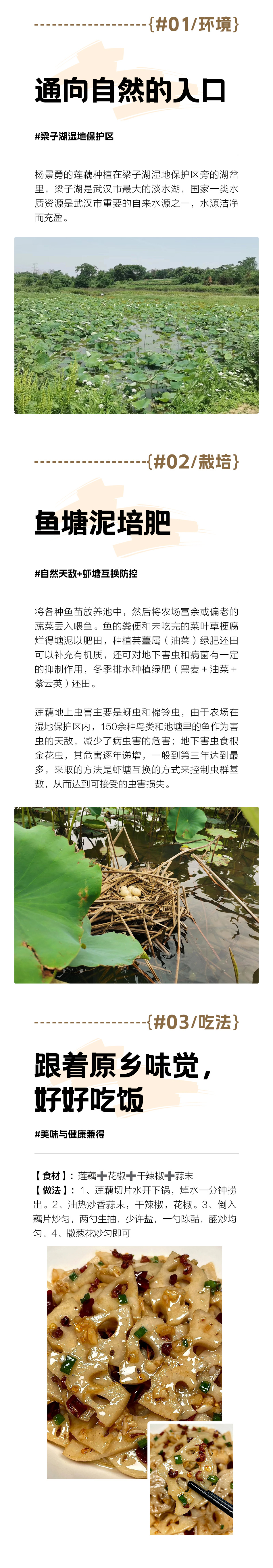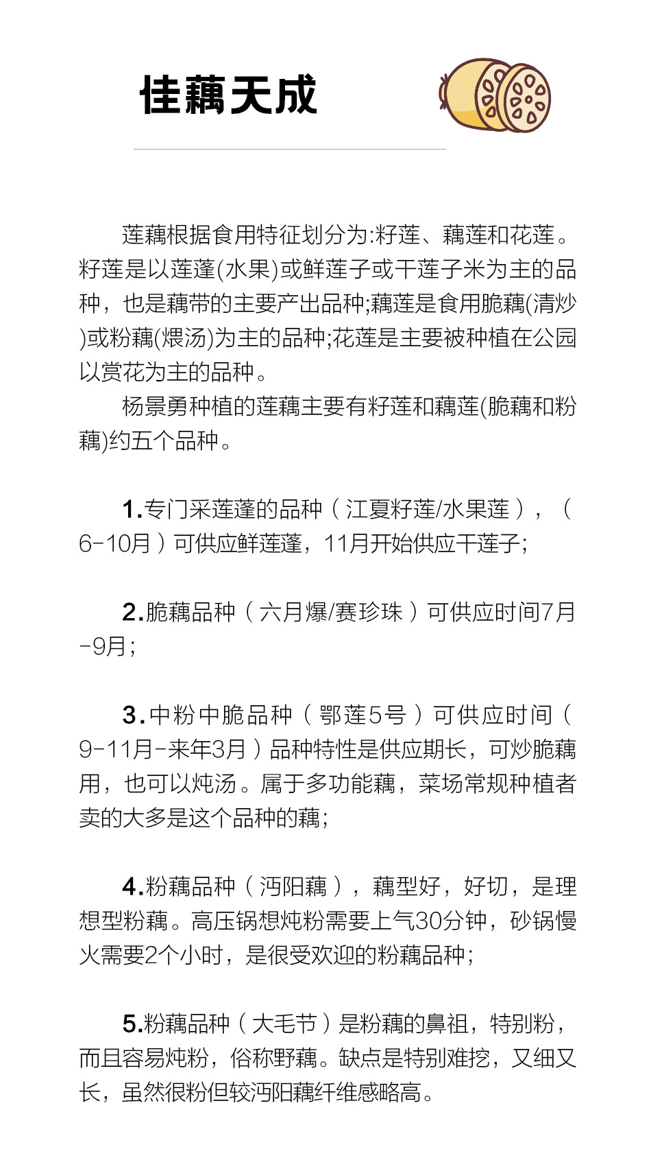 【负责人】:杨景勇 【规格】:3斤 【品种】:农场一共种有5个品种的莲藕,分别是: 【发货方式】:保鲜膜包裹,加冰用泡沫箱包装,新鲜采摘当日顺丰发货。沔阳藕带泥发货 【储存方式】:冷藏 【食用建议】:请尽快食用,一周内吃完 【产地】:湖北省武汉市江夏区乌龙泉街沿湖村