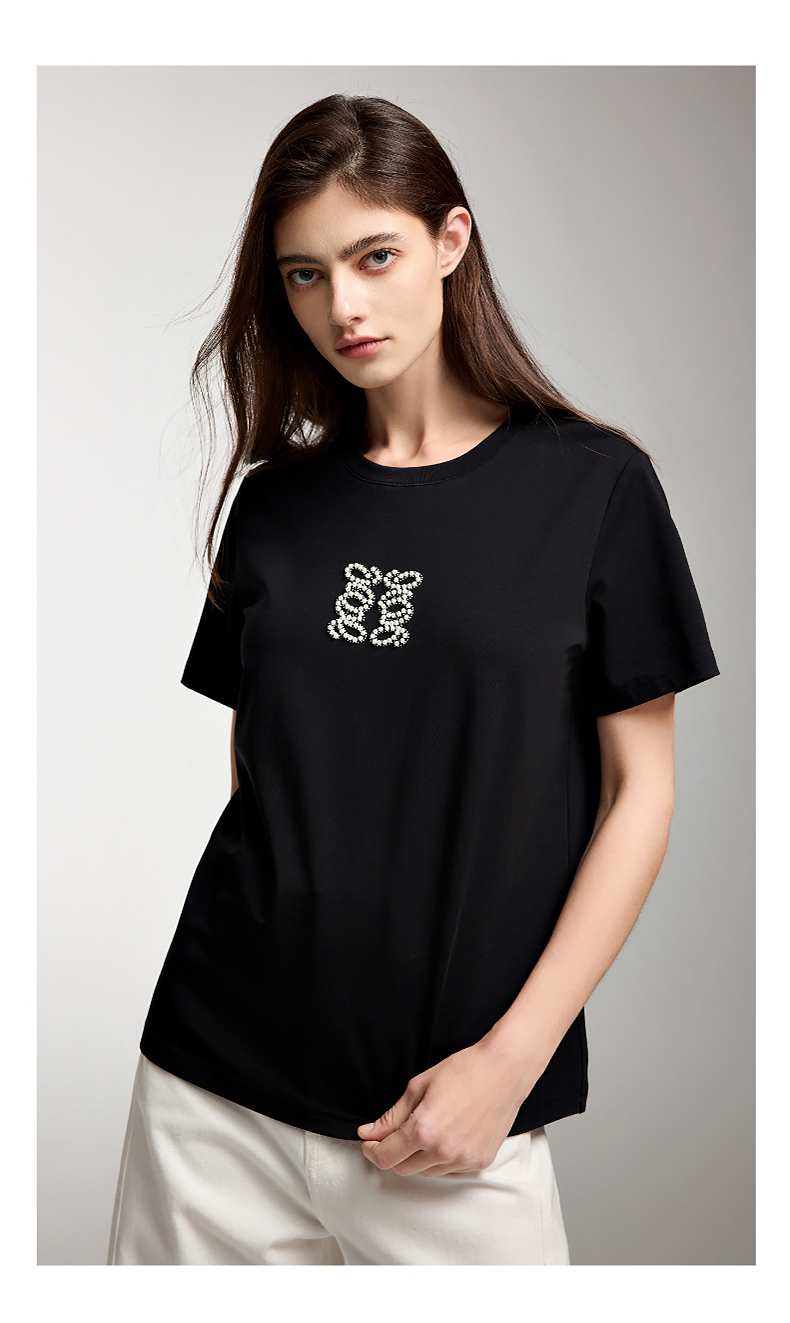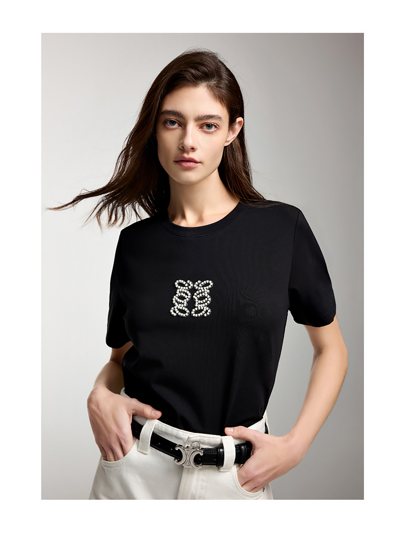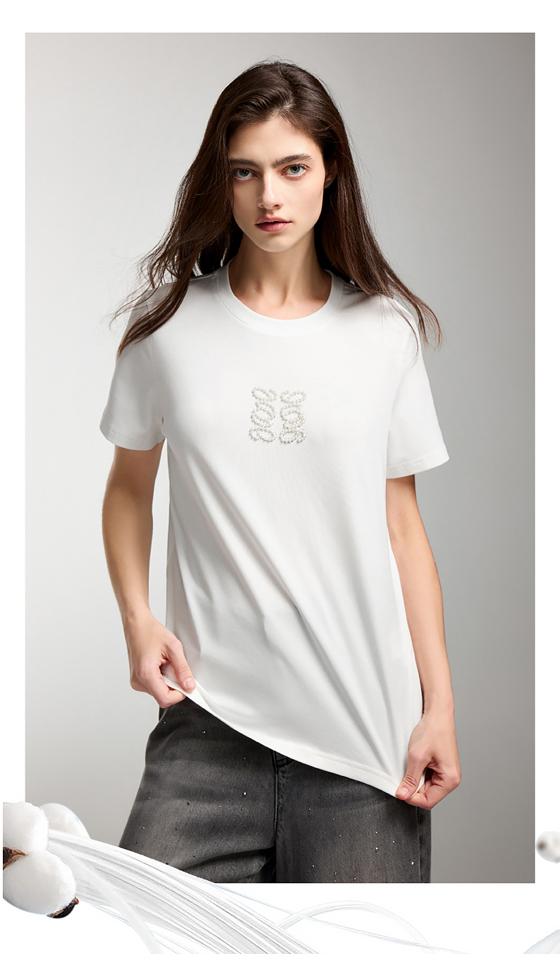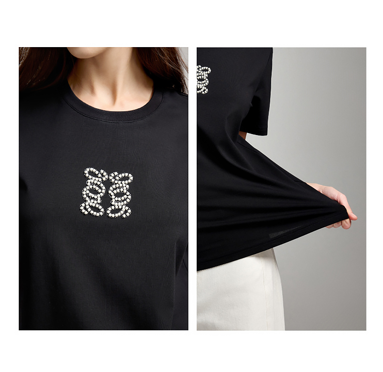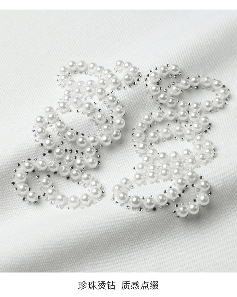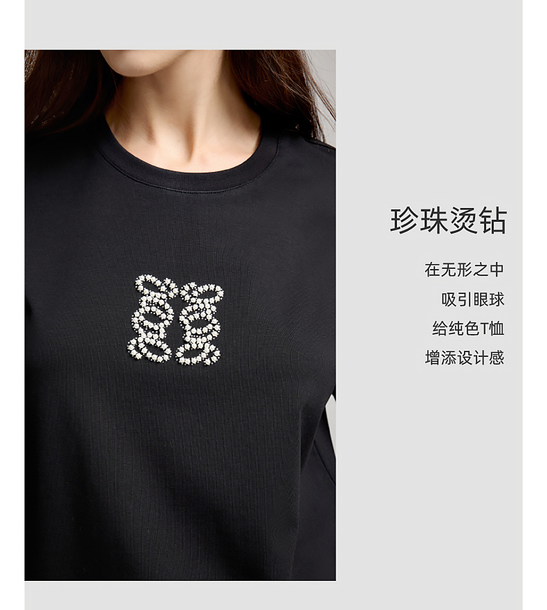 【莱赛尔棉正肩T恤】逸阳珍珠烫钻修身显瘦圆领抑菌上衣5112