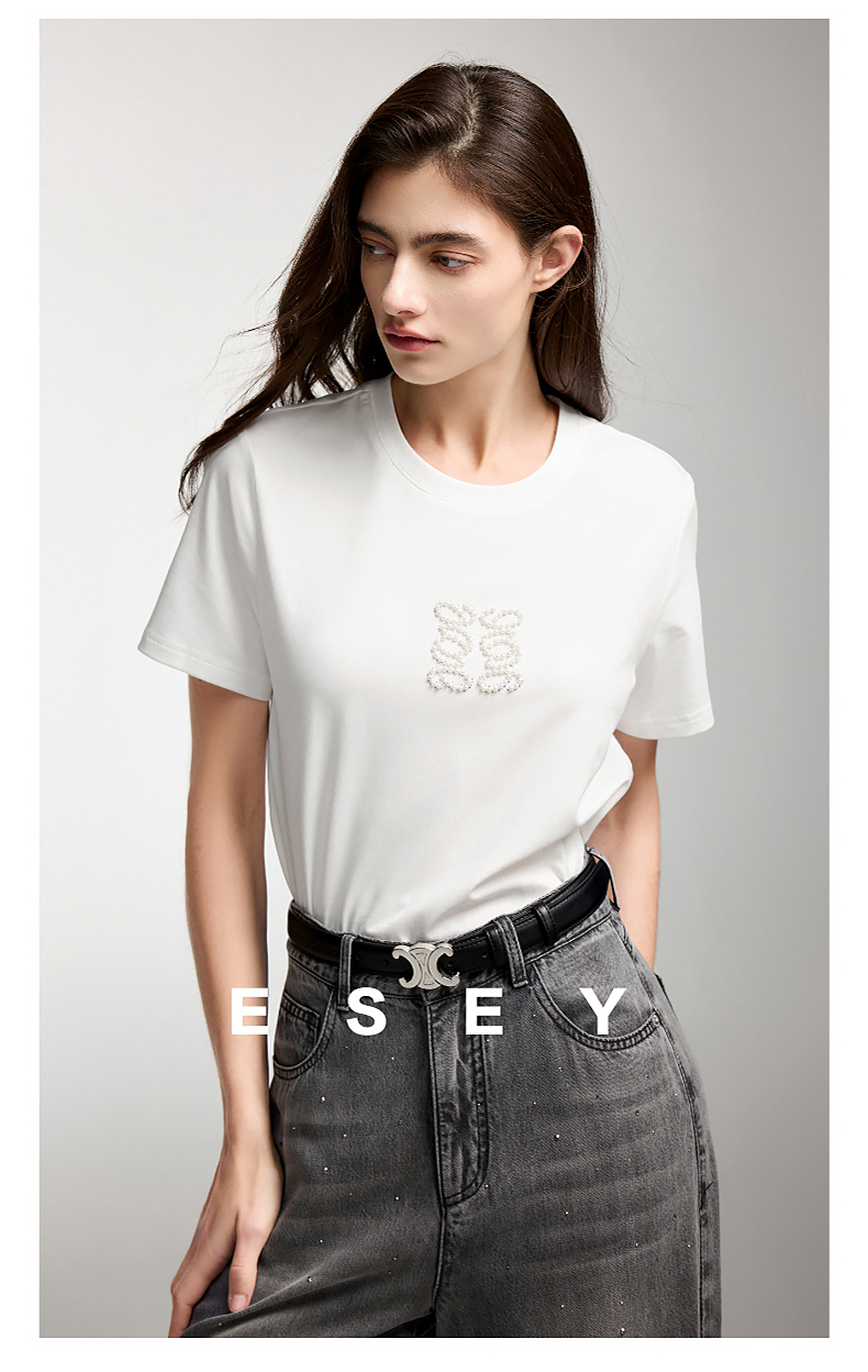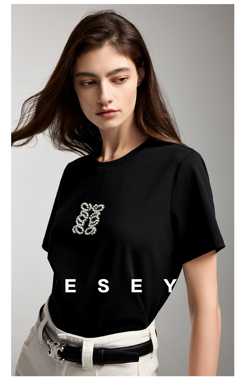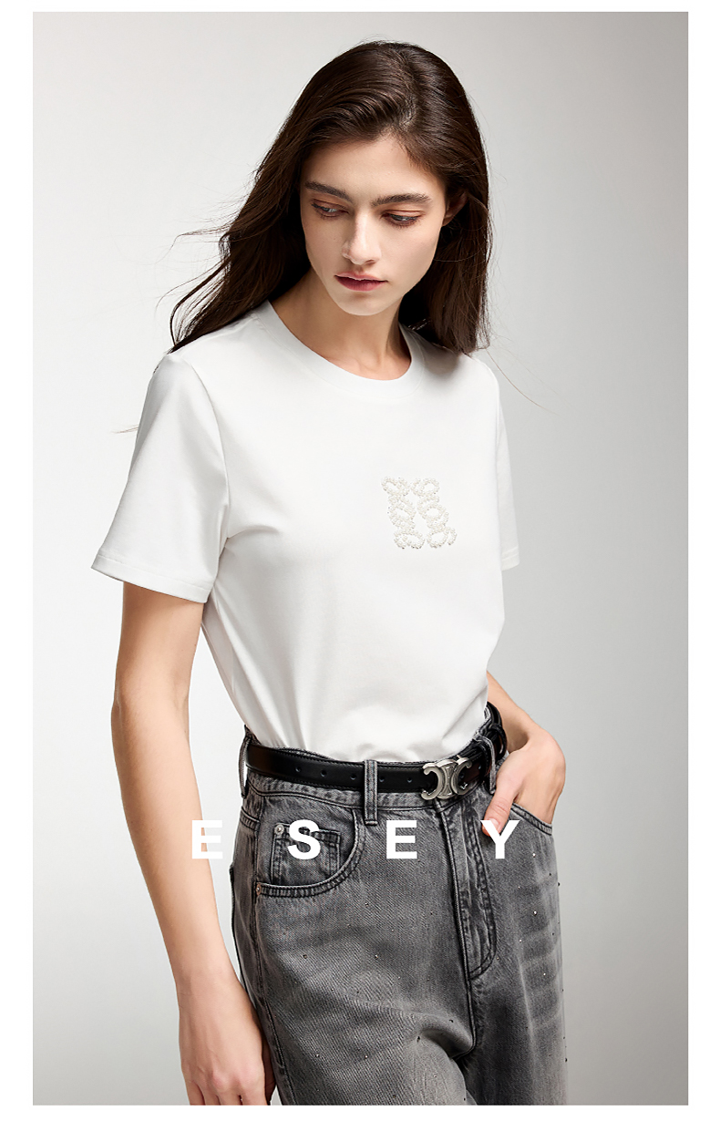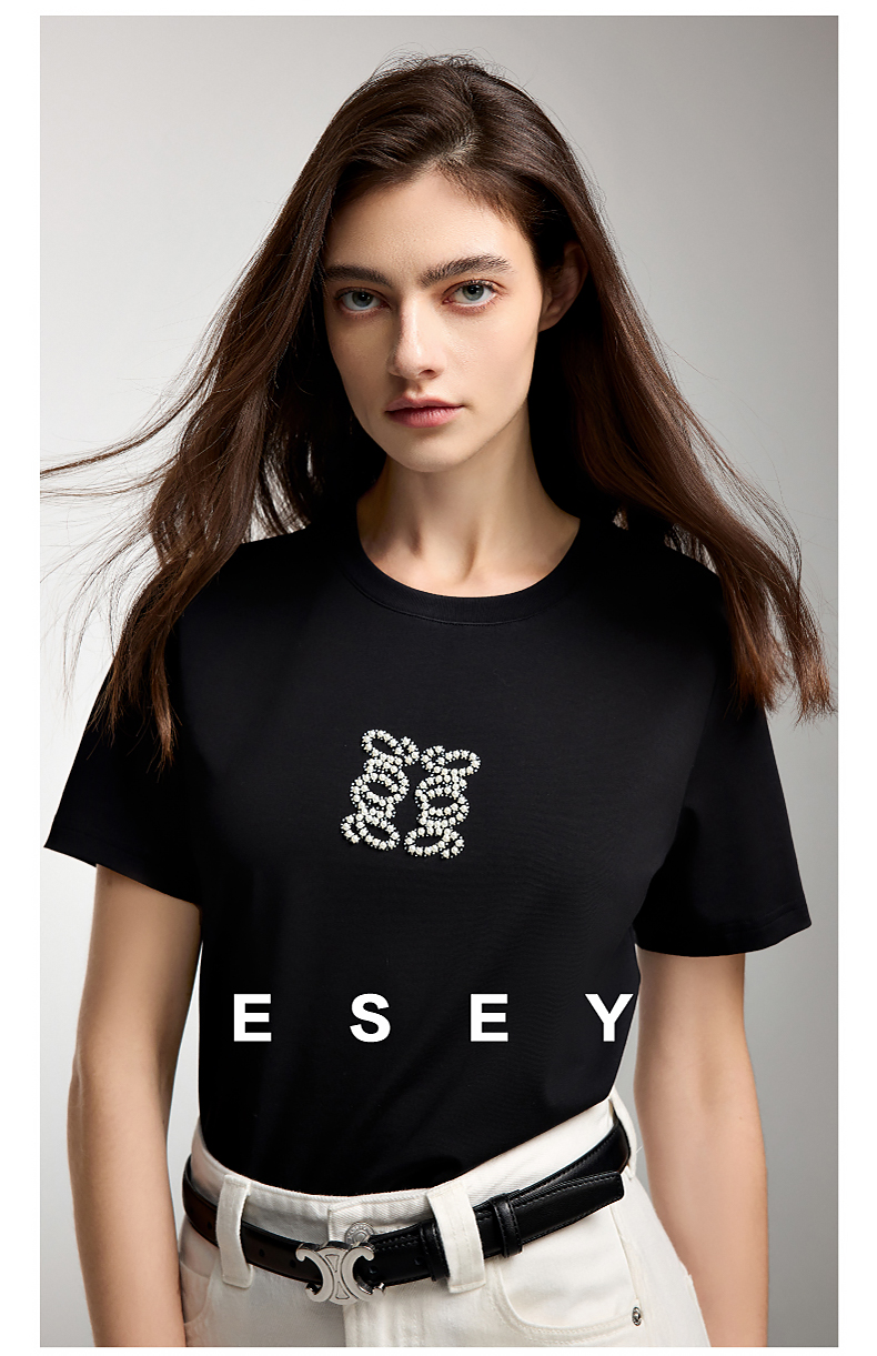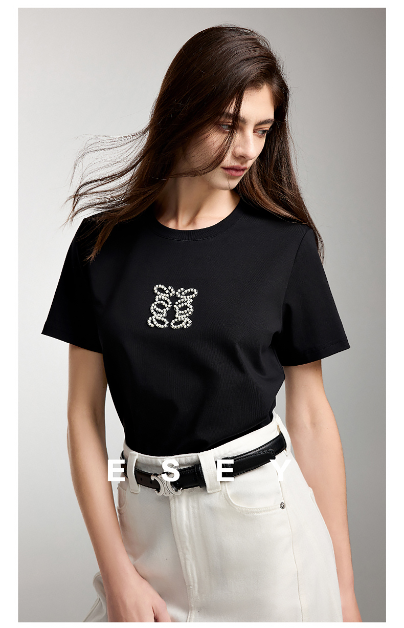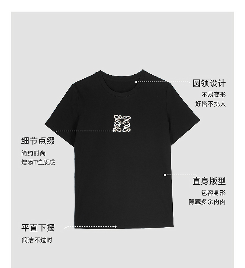 【莱赛尔棉正肩T恤】逸阳珍珠烫钻修身显瘦圆领抑菌上衣5112
