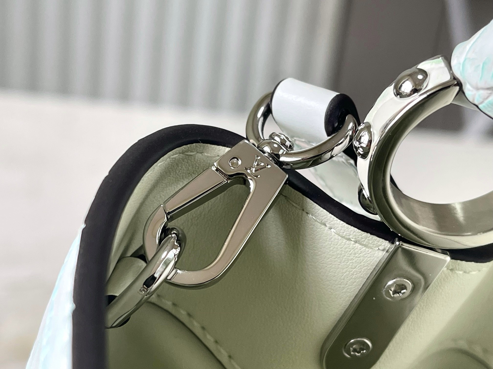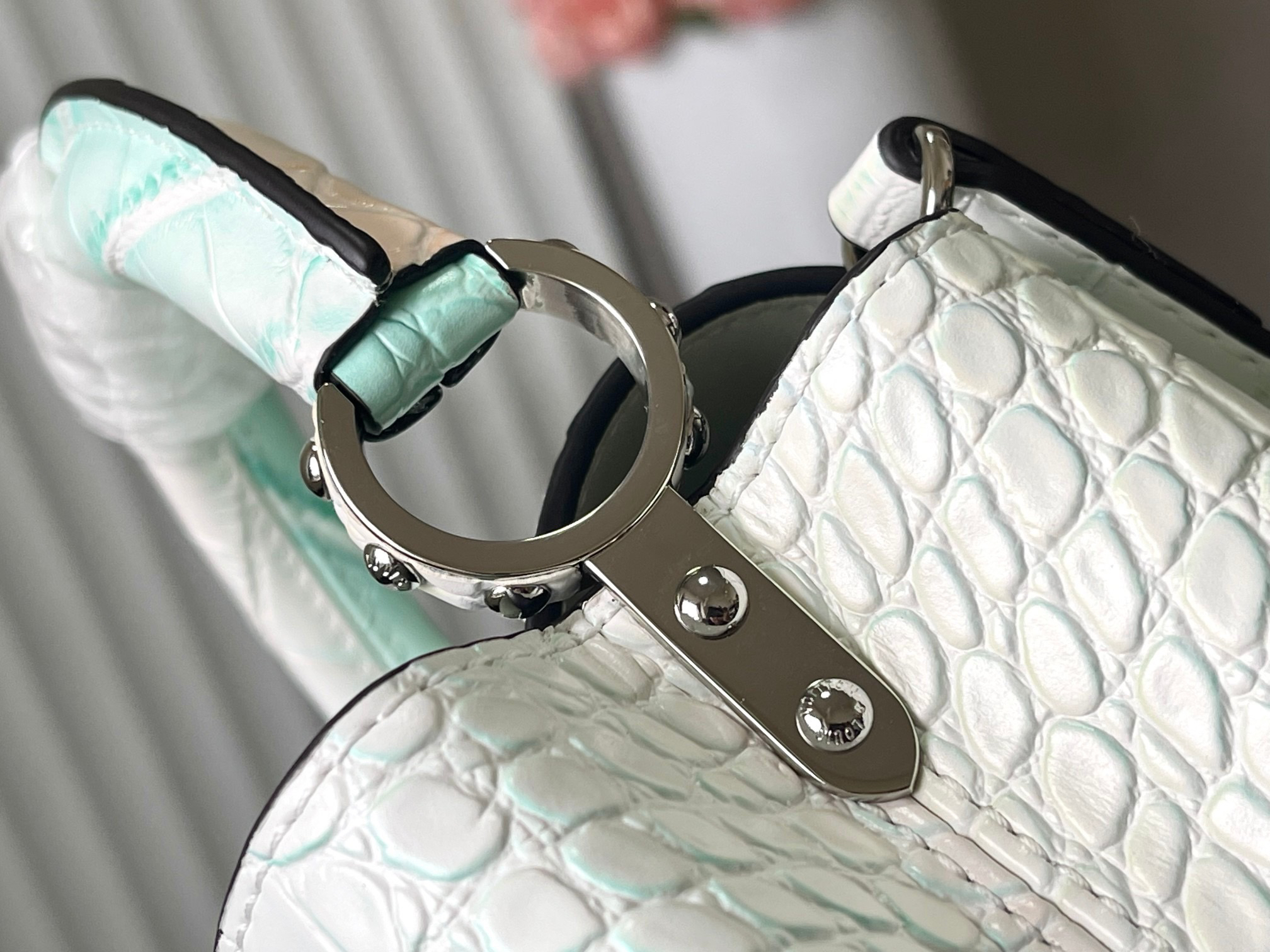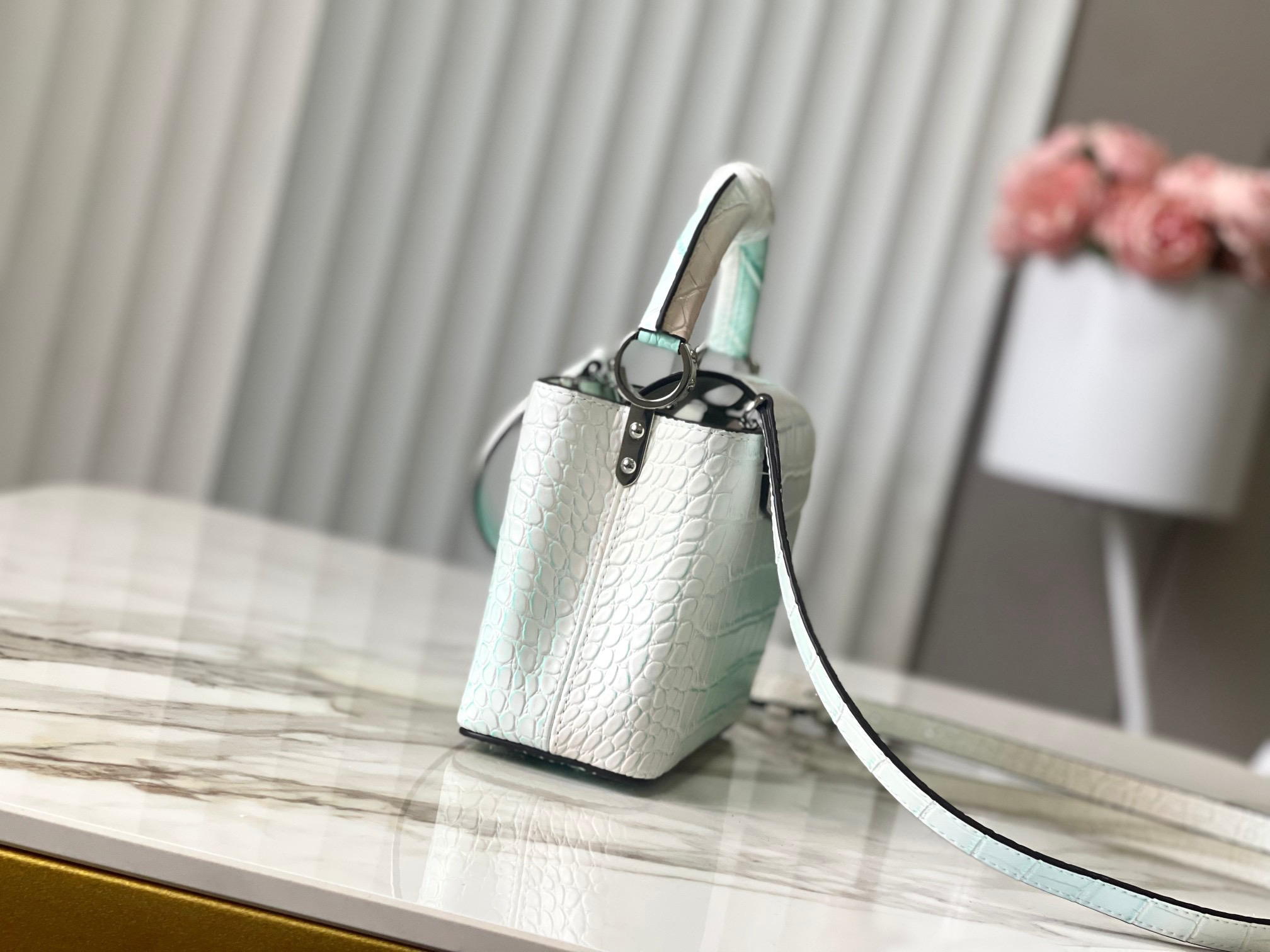 秋冬特惠💰1430 渠道级LV 新品🔸te级LV精品🔸N93163/M48865白拼绿鳄鱼纹🌟此款珍贵的Capucines手袋由鳄鱼皮纹 经上高光处理 闪耀迷人 奢华的山羊皮衬里与闪闪发光的金属饰件 特有的Capucines搭盖既可收入包内 展示字母标识 又可外翻 呈现Monogram Flower图案 出行的理想配饰 Size: 21*14*8CM