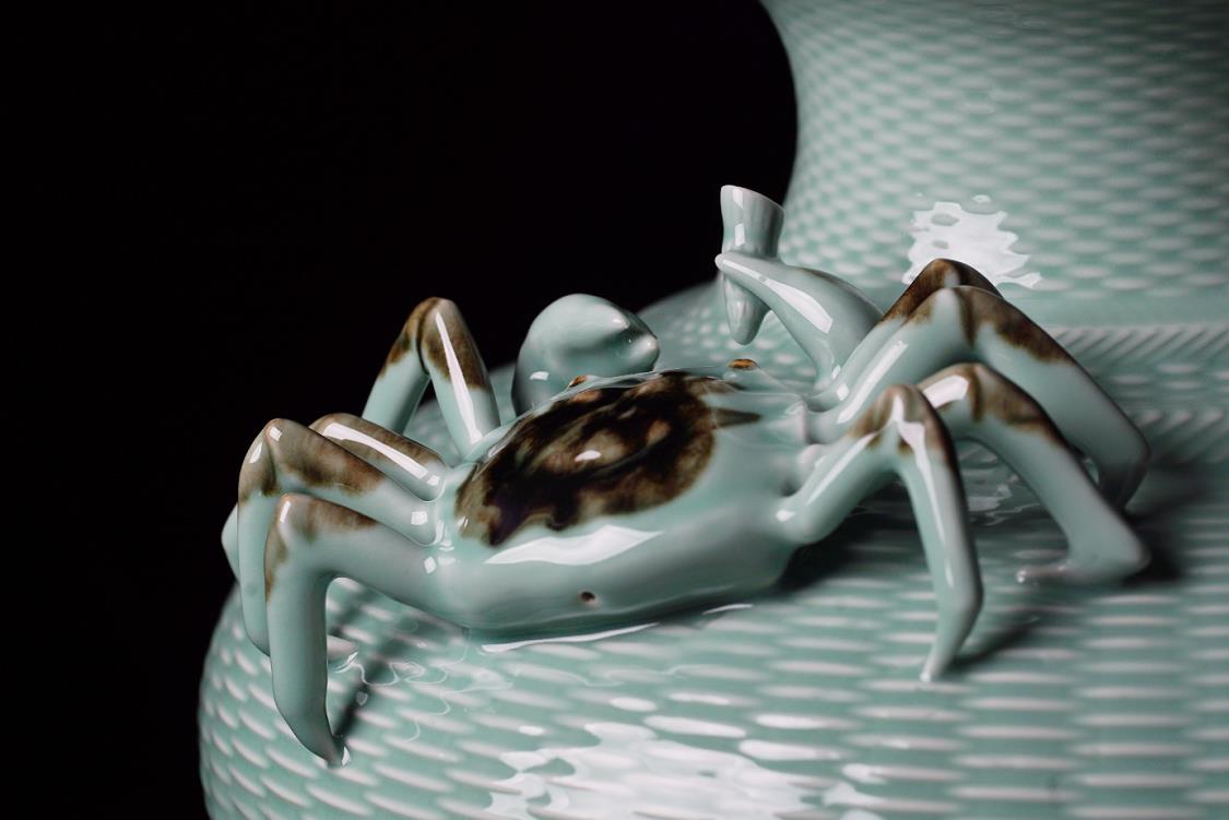 本品为上世纪80年初,宜兴青瓷最具影响力的经典代表作。设计源于故宫博物院的一件历史珍品“鱼篓尊”,加上“鱼米之乡”特有的螃蟹为装饰,更具当地特色。