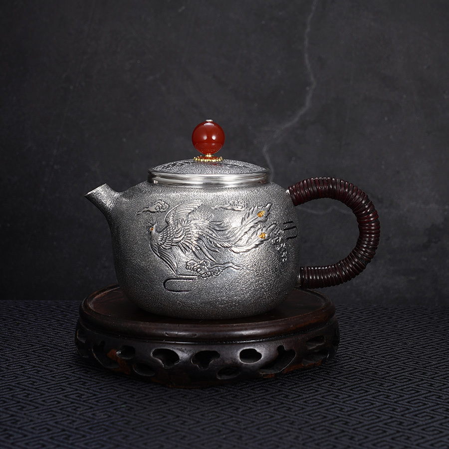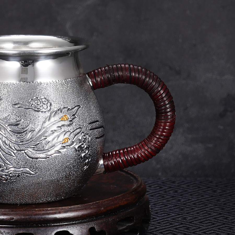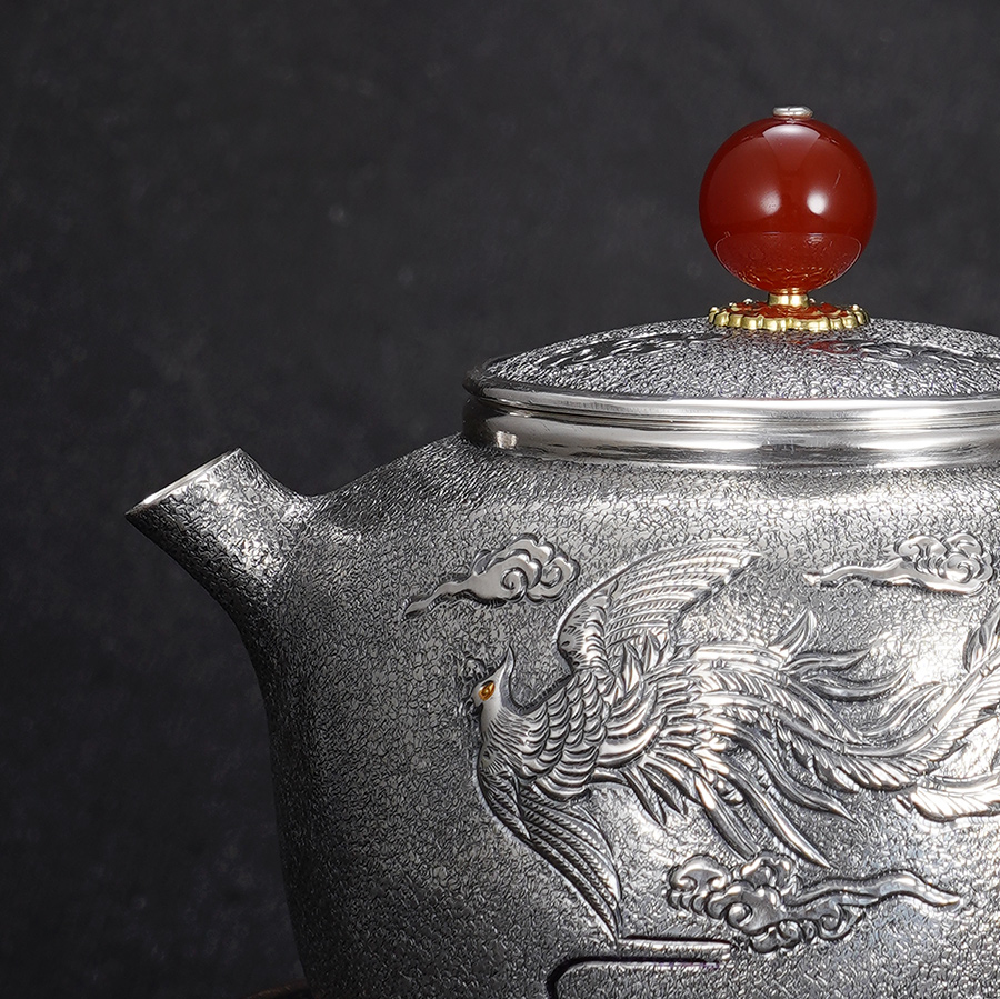 【寓意】:银壶以纯银为骨,錾刻凤凰振翅,祥云相伴之景。凤凰为百鸟之王,象征尊贵与重生;“祥云”为吉兆之纹,寓意福泽绵长。二者结合,象征家业兴隆、人生顺遂。