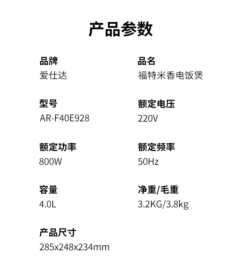 【分仓直发包邮】爱仕达福特米香电饭煲AR-F40E928