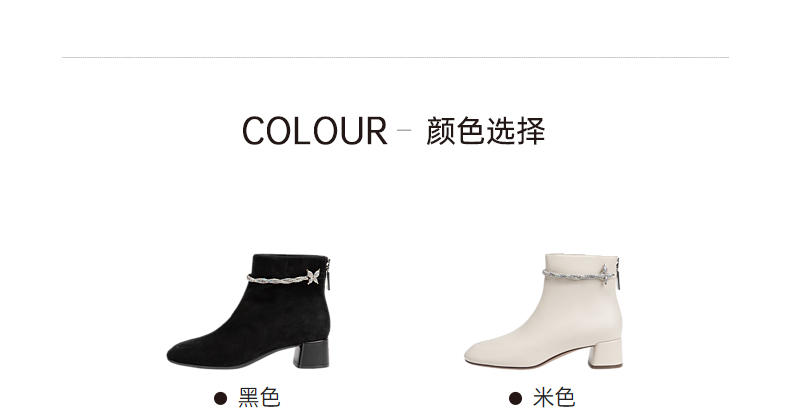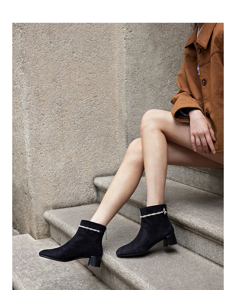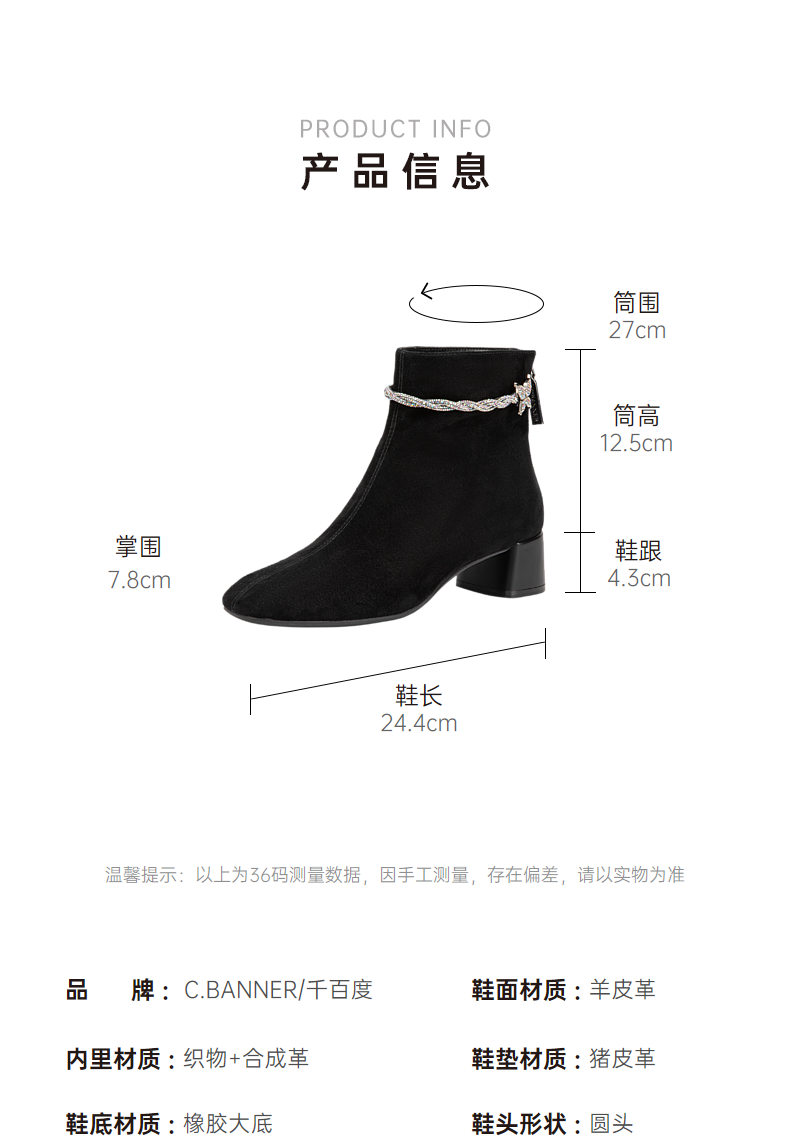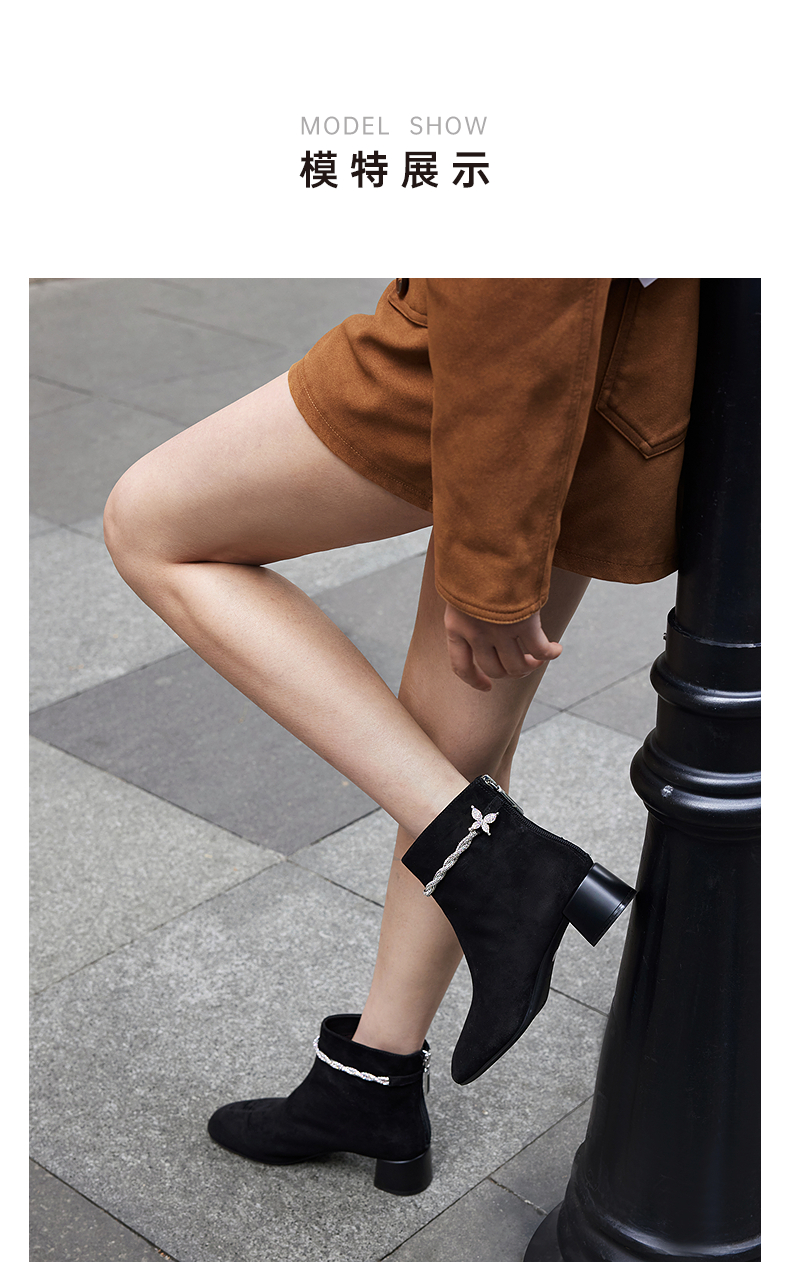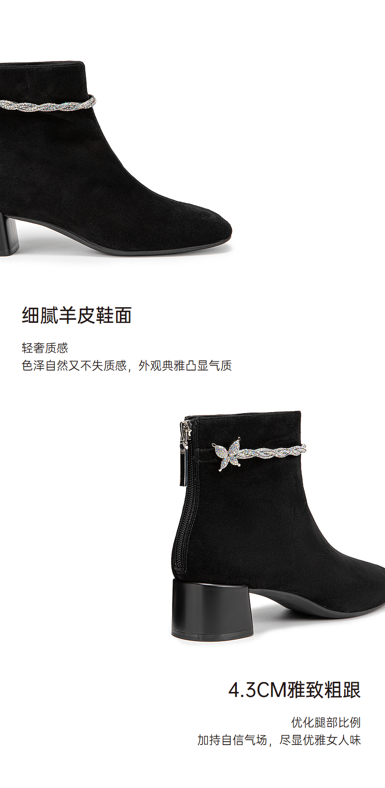 【静音系列】千百度羊皮粗中跟时装靴女冬季显瘦通勤短靴A24584115