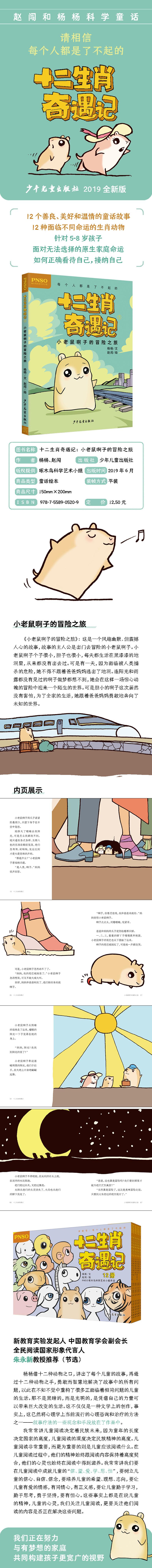 《十二生肖奇遇记》通过12个善良、美好和温情的童话故事,讲述了12种面临不同命运的动物,如何正确地看待自己,看待世界,如何真正的从内心接纳自己,承认自己的优点,也宽容自己的不足。这12个小动物,是每一个孩子的缩影,它们面对的问题,是每一个孩子曾经、正在或者将来要面对的问题,而它们凭借自己的善良、勇敢、智慧最终解决了所有的难题,则给了孩子们巨大的力量。每一个阅读自己生肖故事的孩子,一定都会同自己的生肖伙伴一起,勇敢地面对生活中的并不光亮的时刻,积极快乐地迎接更加光明和幸福的未来。这是一个风趣幽默、但震撼人心的故事,故事的主人公是出门去冒险的小老鼠。当小老鼠啊子的家轰隆轰隆地要倒塌时,啊子害怕极了,她的爸爸说:“没什么,只是在呼唤我们去冒险呢!”当啊子不理解 “他们为什么一直说我们是可恶的?” 妈妈向啊子解释道:“他们是故意那样说的,因为他们想和我们玩捉迷藏,只有把我们惹生气了,他们才能找到我......