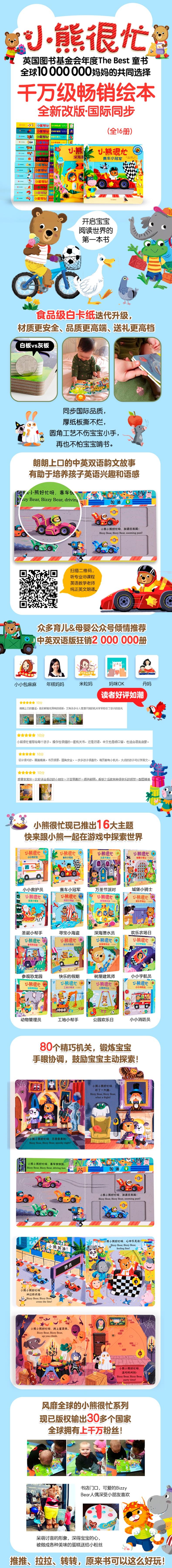 来自英国的小熊很忙系列现已靠前800多万册,一直占据着各大童书排行榜,好评如潮! 《小熊很忙(升级版):小小宇航员》为全新超厚白卡纸升级版,有趣好玩的故事配上丰富的互动机关,宝宝用小手推一推、拉一拉、转一转、滑一滑,就能看到意想不到的惊喜,既锻炼了小手的灵活性,又鼓励宝宝主动探索。扫描封底二维码,即可跟随专业外教磨耳朵、学发音。朗朗上口的中英歌谣,打造浸入式阅读环境,从小培养宝宝的英文语感。这本书让宝宝有机会从“玩”中去探索世界,体验身边不同的生活和职业。 忙碌的小熊准备乘坐火箭去太空旅行,小朋友们可以通过厚纸板操作页,帮助火箭发射到太空;转一转,小熊就能看到窗外蓝色的地球和奇妙的外太空世界;推一推,帮助小熊在月球上蹦蹦跳跳吧!当宇航员真有趣!