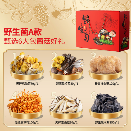 【包装规格】野生耳150克、鸡油菌70克、虫草花100克、猴头菇120克、雪山菇90克、拾菌汤包80克