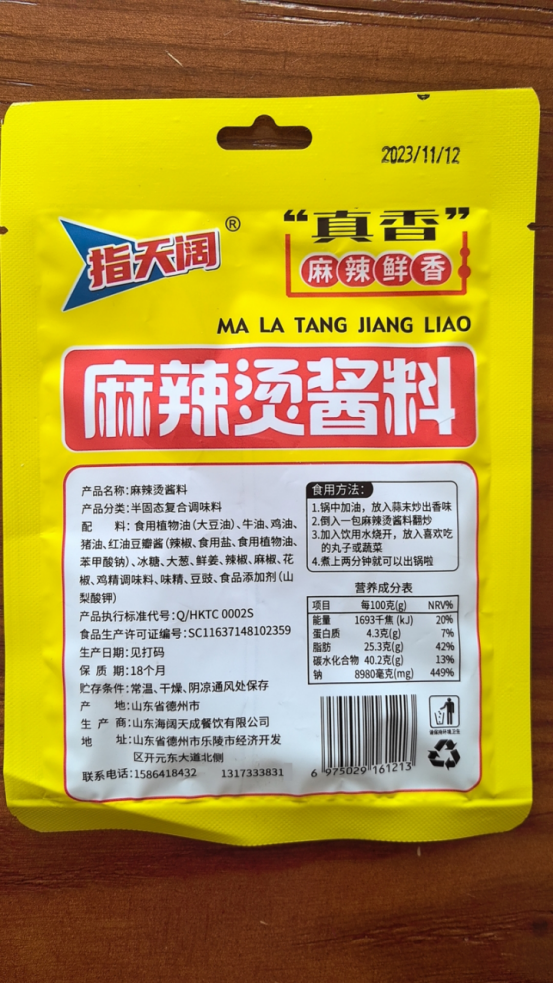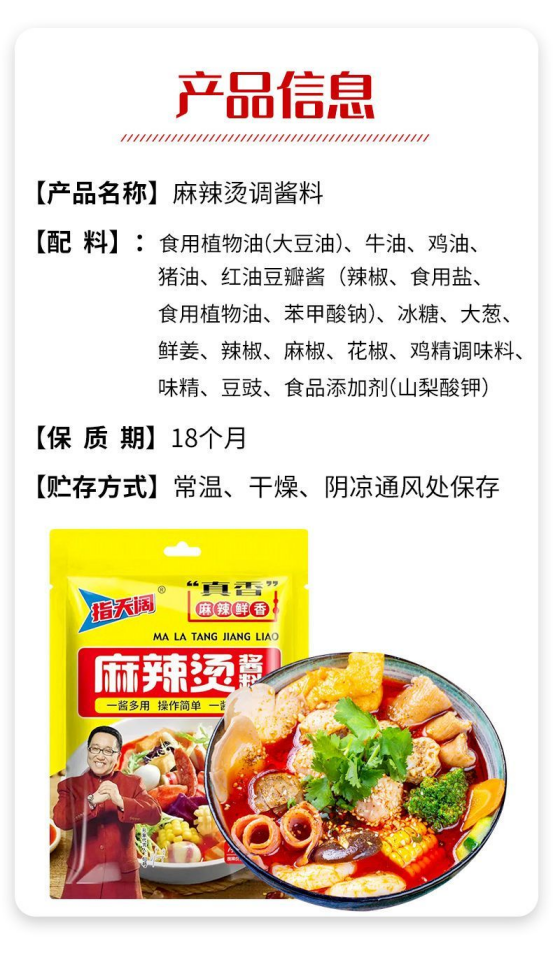 【配料】:食用植物油(大豆油)、牛油、鸡油、.加入饮用水烧开,放入喜欢哕猪油、红油豆瓣酱、冰糖、大葱、鲜姜、辣椒、麻的丸子或蔬菜椒、花椒、等见产品包装
