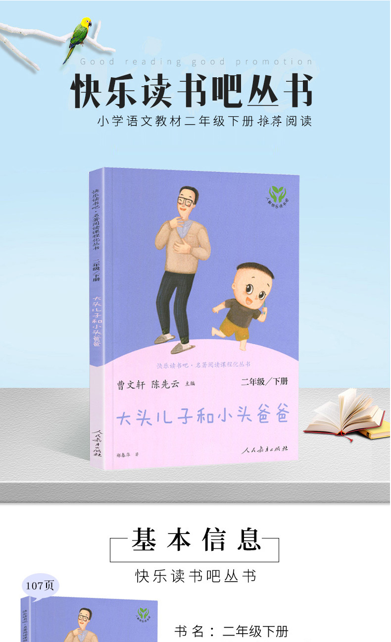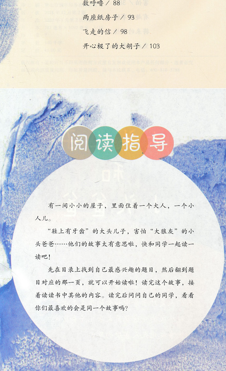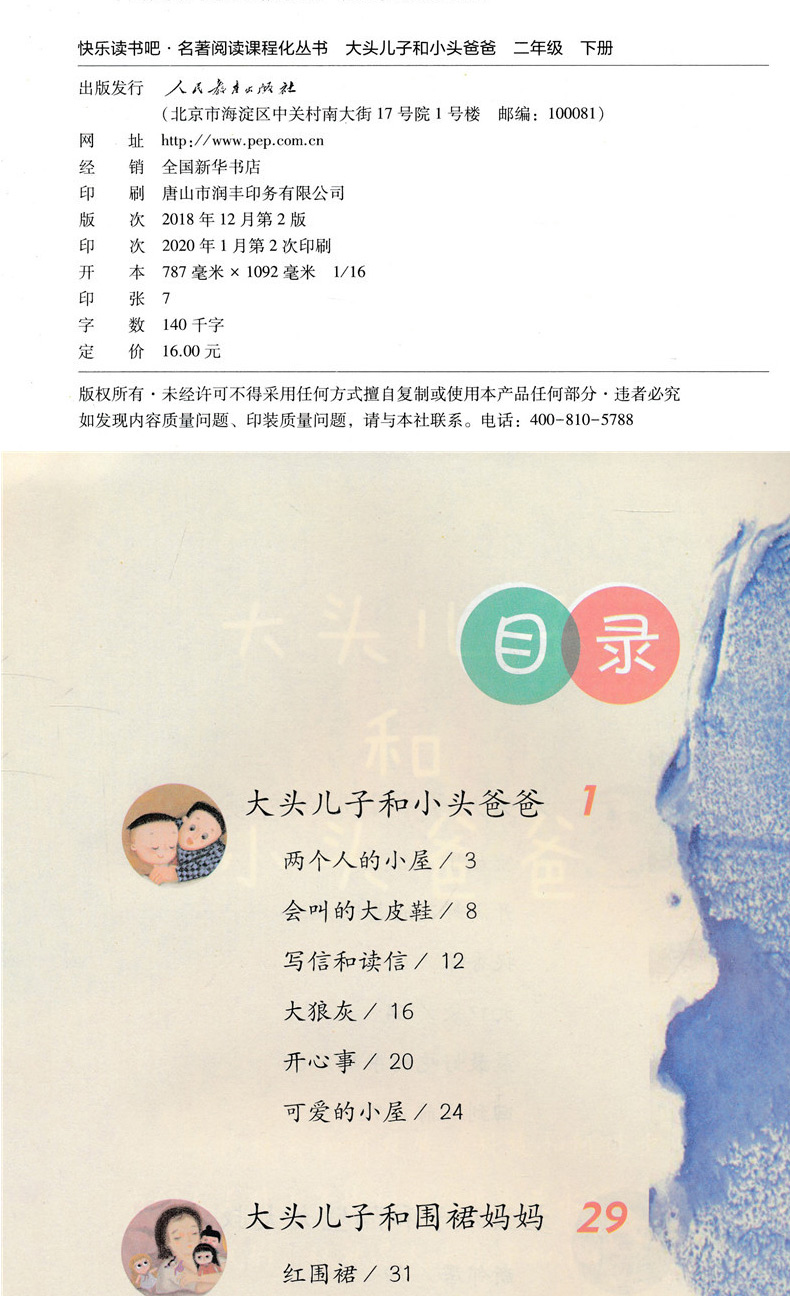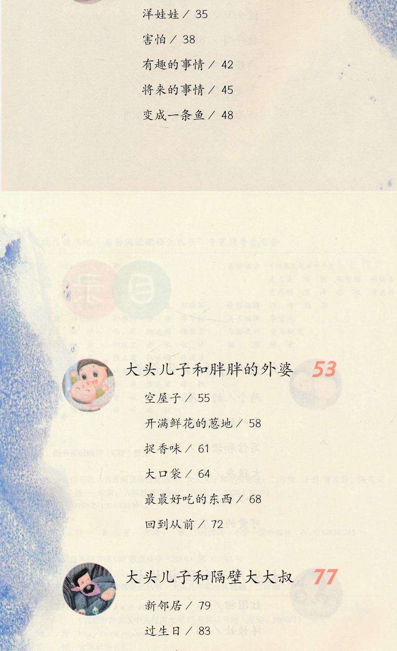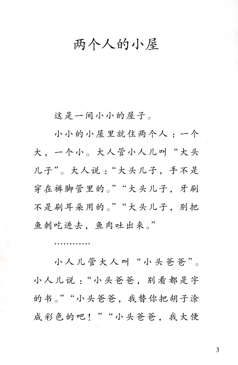 | 大头儿子和小头爸爸有一间小小的屋子,里面住着一个大人,一个小人儿。 “鞋上有牙齿”的大头儿子,害怕“大狼灰”的小头爸爸……他们的故事太有意思啦,快和同学一起读一读吧!先在目录上找到自己 感兴趣的题目,然后翻到题目对应的那一页,就可以开始读啦!读完这个故事,接着读读书中其他的内容。读完后问问自己的同学,看看你们 喜欢的会是同一个故事吗?两个人的小屋这是一间小小的屋子。 小小的小屋里就住两个人:一个大,一个小。大人管小人儿叫“大头儿子”。大人说:“大头儿子,手不是穿在裤脚管里的。”“大头儿子,牙刷不是刷耳朵用的。”“大头儿子,别把鱼刺吃进去,鱼肉吐出来。”……小人儿管大人叫“小头爸爸”。小人儿说:“小头爸爸,别看都是字的书。”“小头爸爸,我替你把胡子涂成彩色的吧!”“小头爸爸,我大便好了!”……大头儿子跟小头爸爸在一张桌子上吃饭,在一张床上睡觉,还在一个脚盆里洗脚呢!有一次,大头儿子差点儿把一枚分币吞进肚子里,小头爸爸很生气,拿出一把木尺,狠狠打他手心,打得大头儿子直喊“痛死了!痛死了!”有一次,小头爸爸打碎一个盘子,大头儿子拿出一根羽毛,狠狠打他的脚心,打得小头爸爸直叫“瘁死了!痒死了!”在一个冬天的晚上,外面下着大雪,风像一百只老虎在吼叫。被窝里,大头儿子和小头爸爸搂抱在一起,像树洞里的两只熊。大头儿子帮小头爸爸焐热一只脚,又焐热一只脚;小头爸爸替大头儿子焐热一只手,又焐热一只手。焐着焐着,大头儿子马上就要睡着了,小头爸爸忽然推推他,问:“你将来长大了想做什么?”“想……做……像……你……一……样……的……小……头……爸……爸。”刚说完,大头儿子就呼呼睡着了。 会叫的大皮鞋小头爸爸躺在长椅上,呼噜噜,呼噜噜睡大觉。大头儿子一个人在公园的草地上玩,太没劲了!他走过去推小头爸爸,可小头爸爸动也不动。 哼!气死我了!大头儿子朝地上看看,忽然拿起一只大皮鞋,走到树下,噗,扔进树下的废物箱里,还有一只也拿来,把它挂到树上。嘻嘻,大头儿子开心了,他回到小头爸爸那儿使劲推,使劲喊,这下终于把小头爸爸弄醒了。 “哈哈,你的皮鞋没有了,你不能走路啦!”小头爸爸一听,赶忙朝椅子底下找:真的没有了。 “好儿子,赶快拿出来,让爸爸穿上,可以跟你玩一.... |