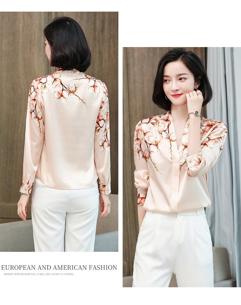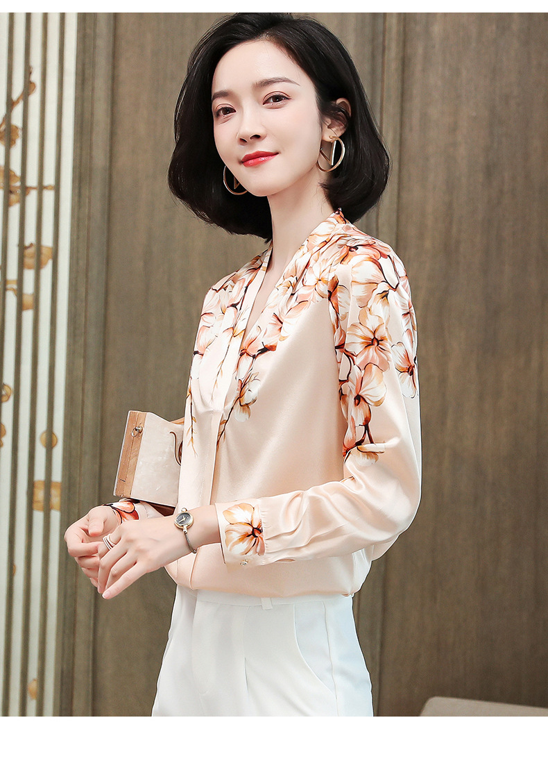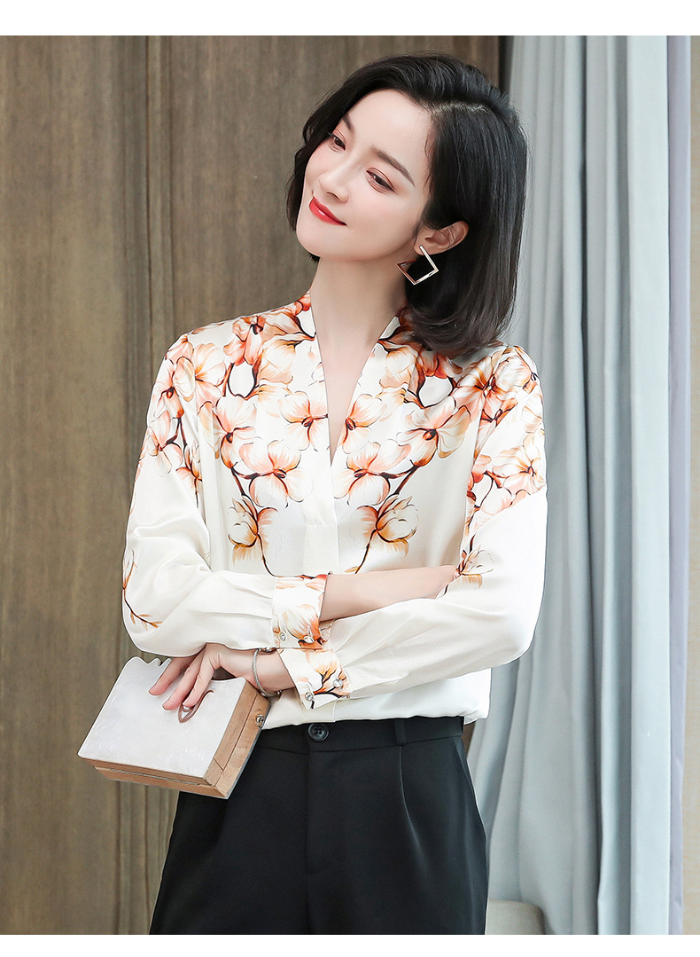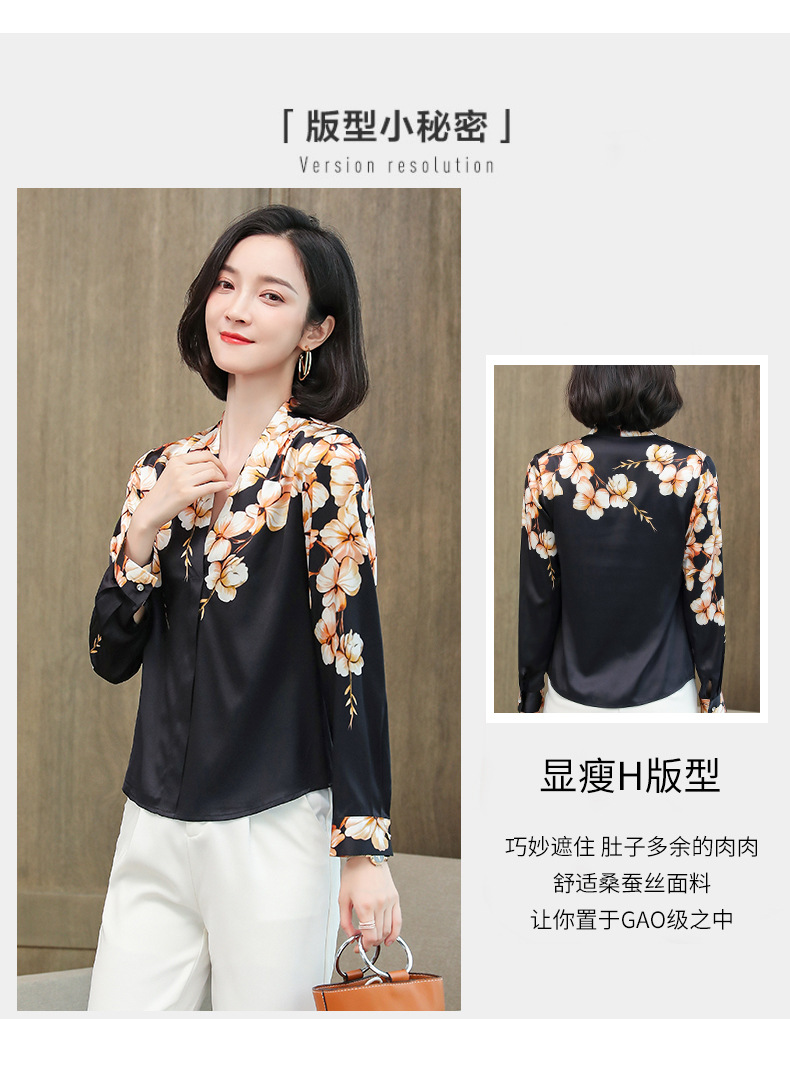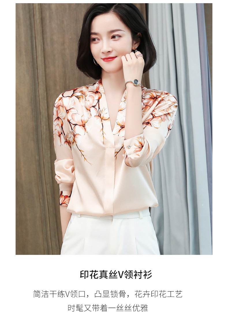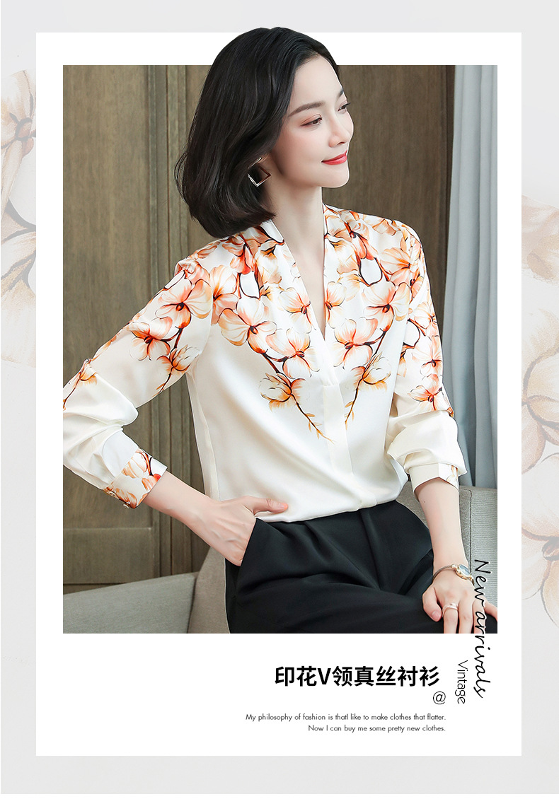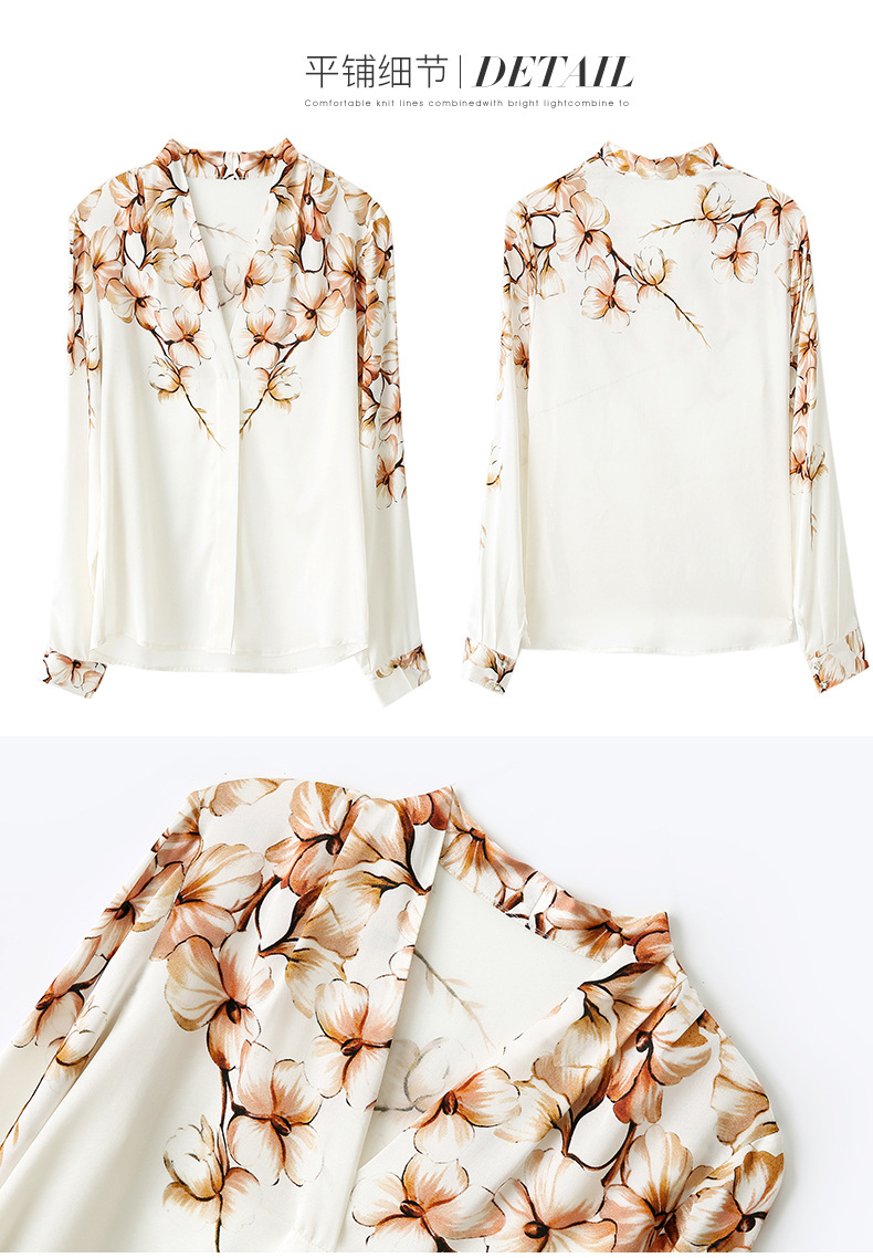 真丝衬衫女长袖年秋装新款V领缎面定位花衬衣桑蚕丝上衣