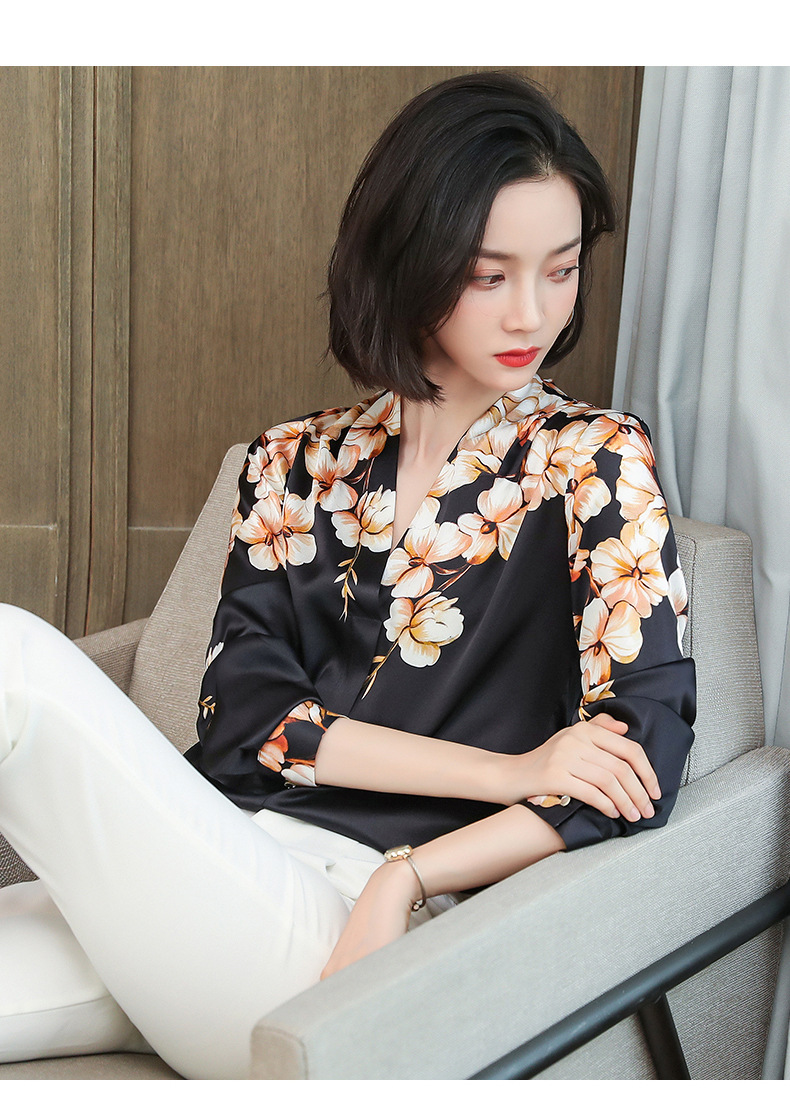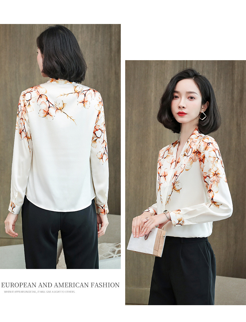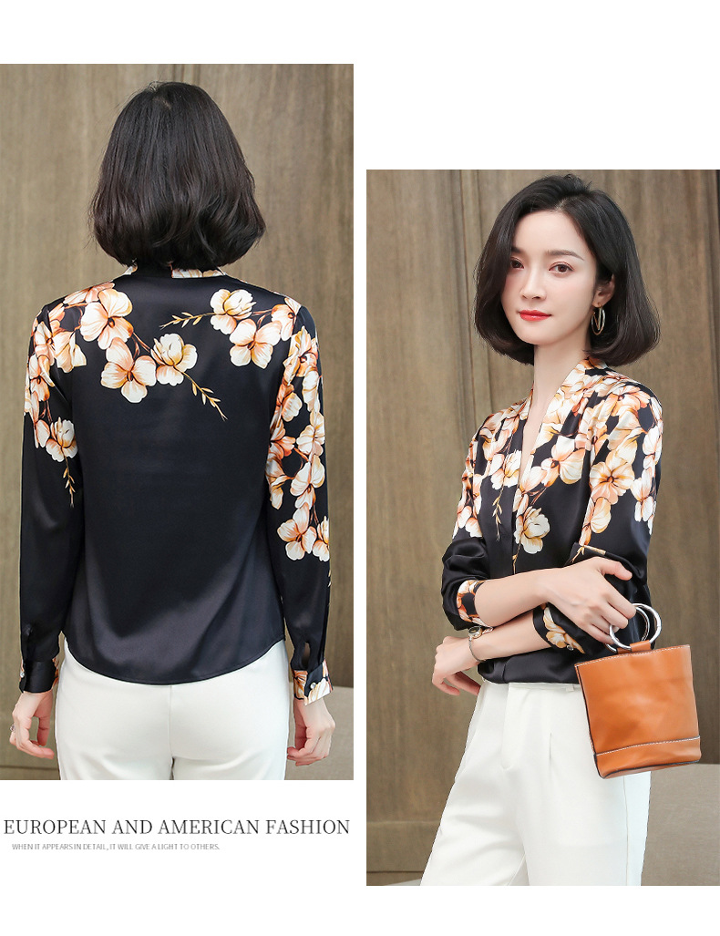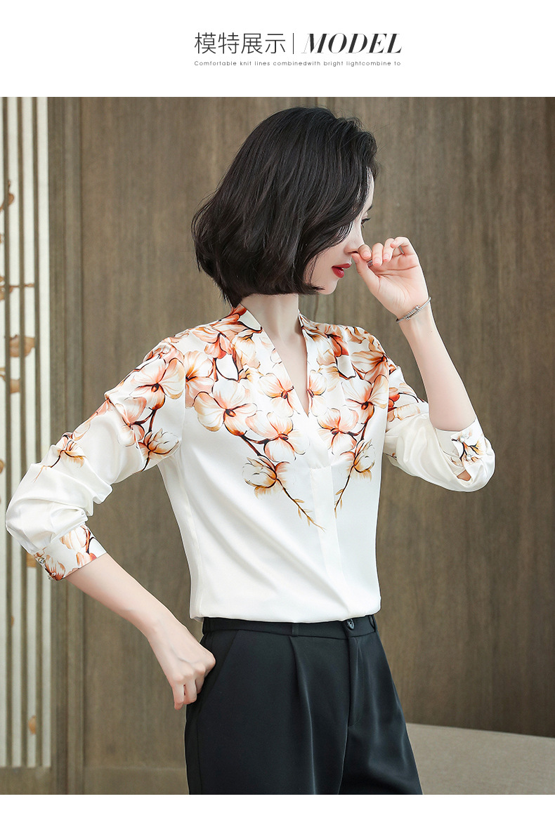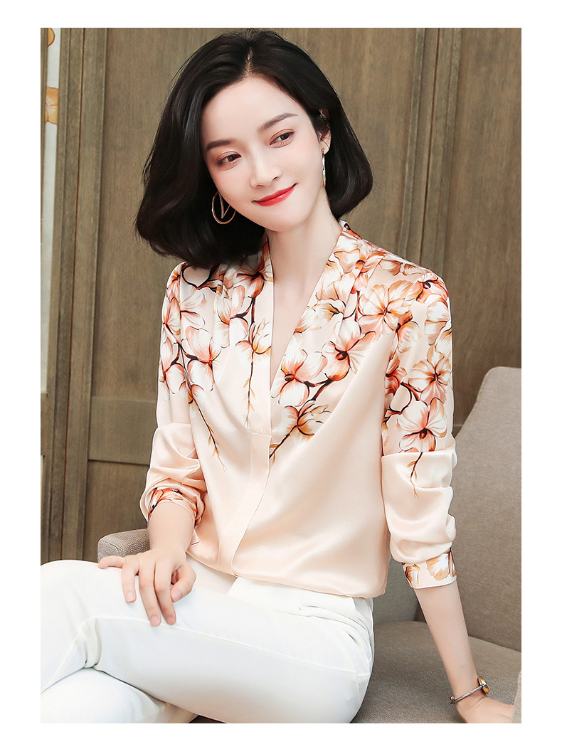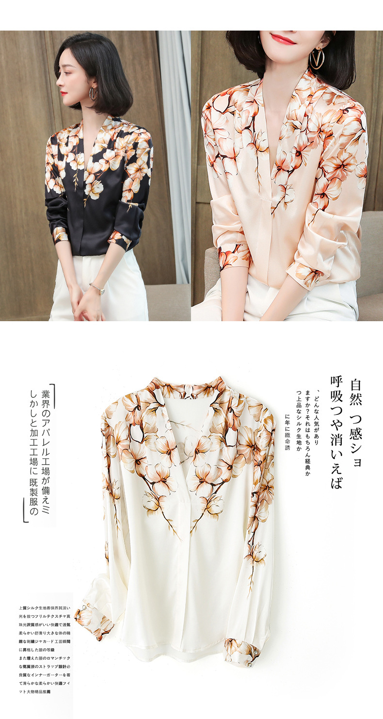 真丝衬衫女长袖年秋装新款V领缎面定位花衬衣桑蚕丝上衣