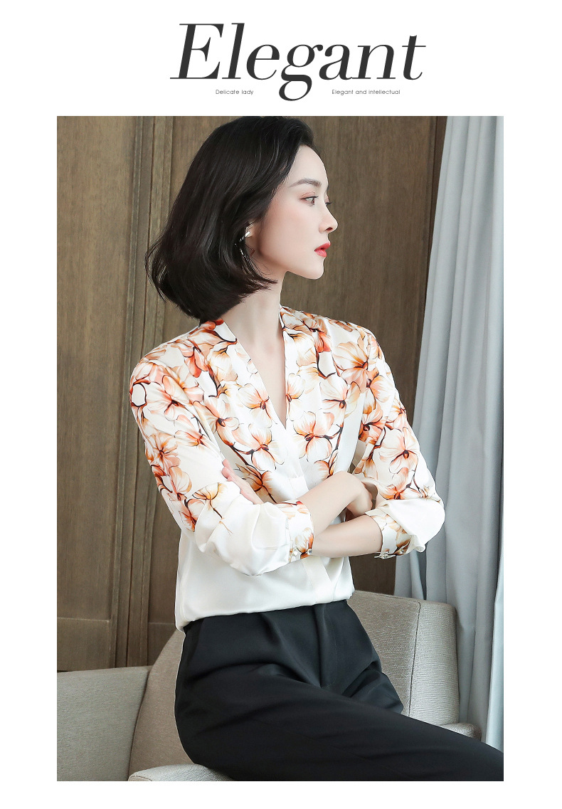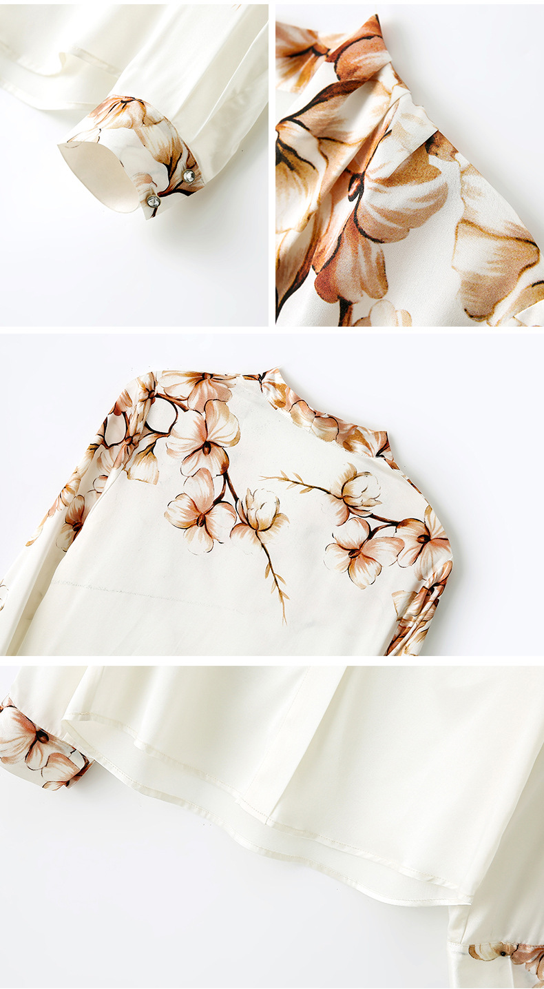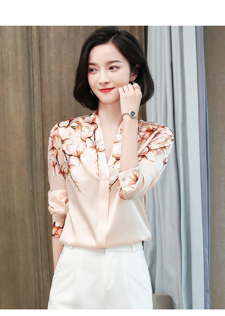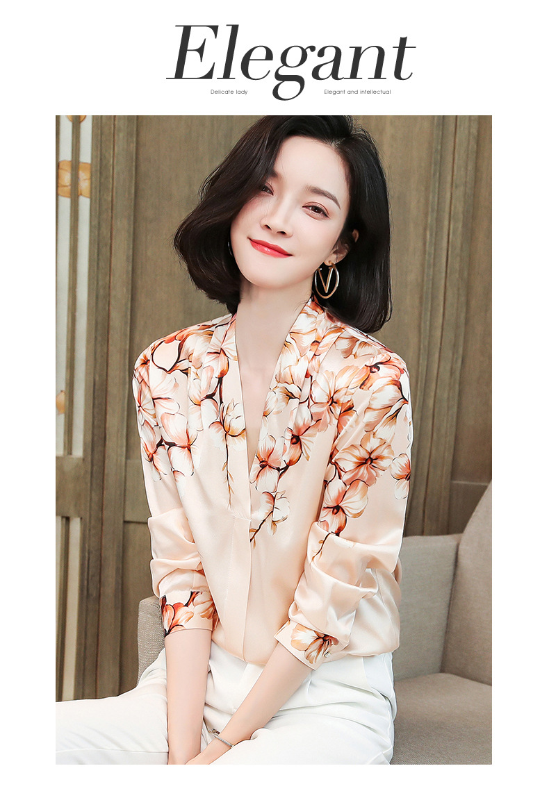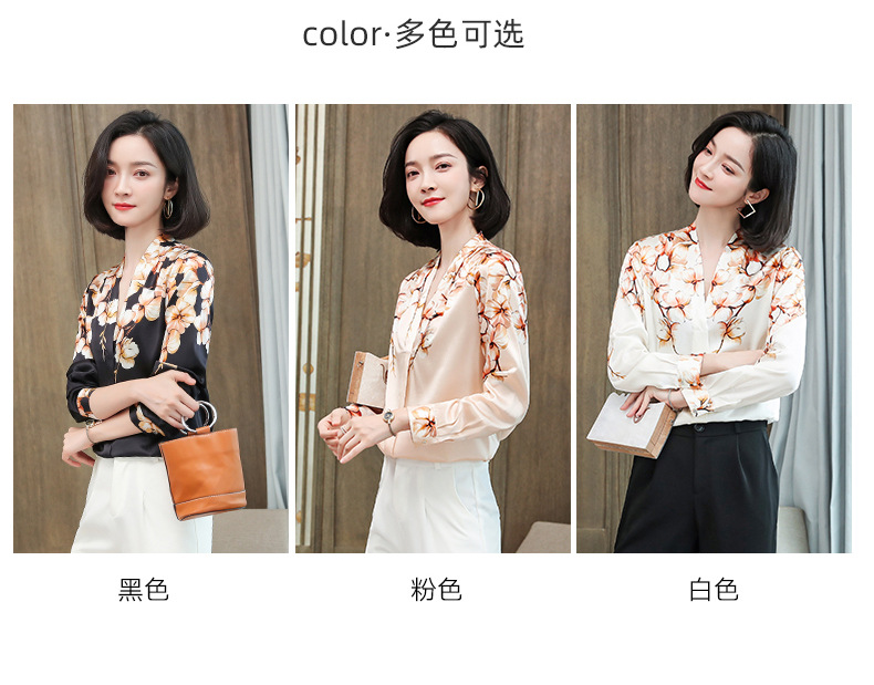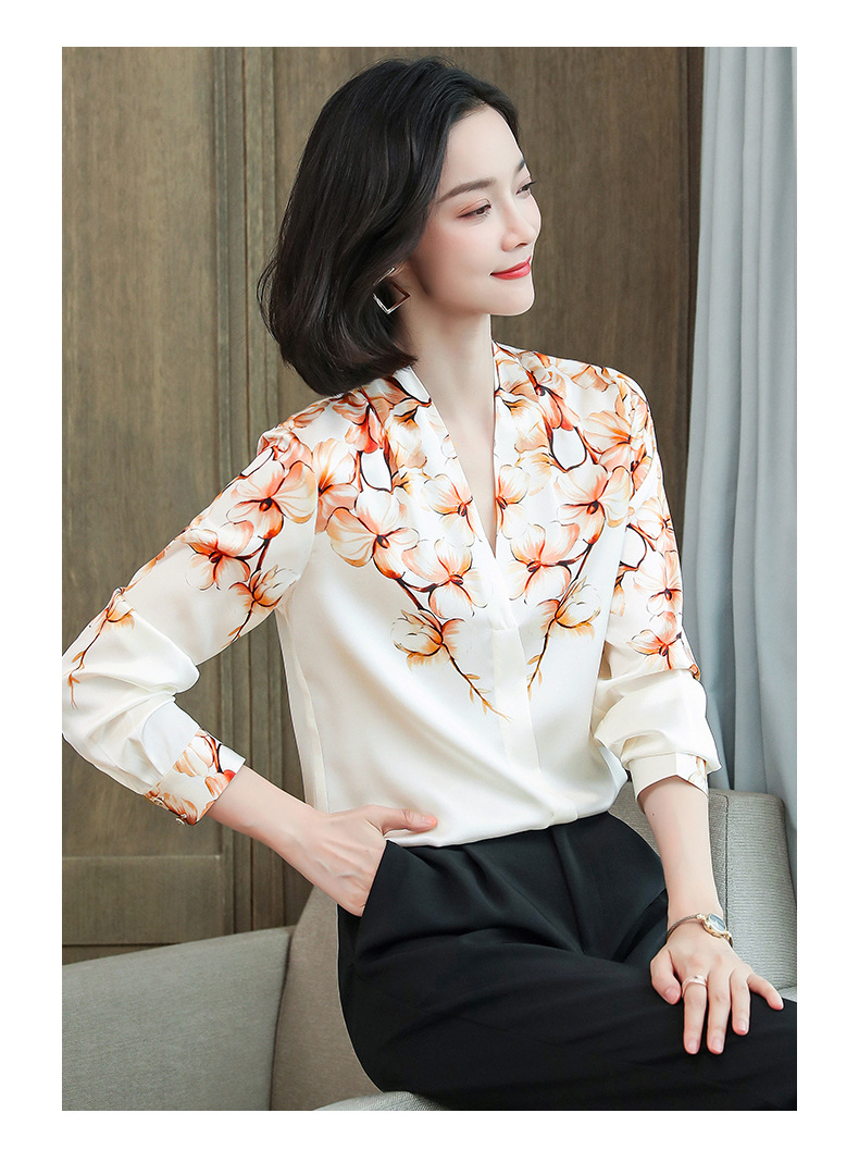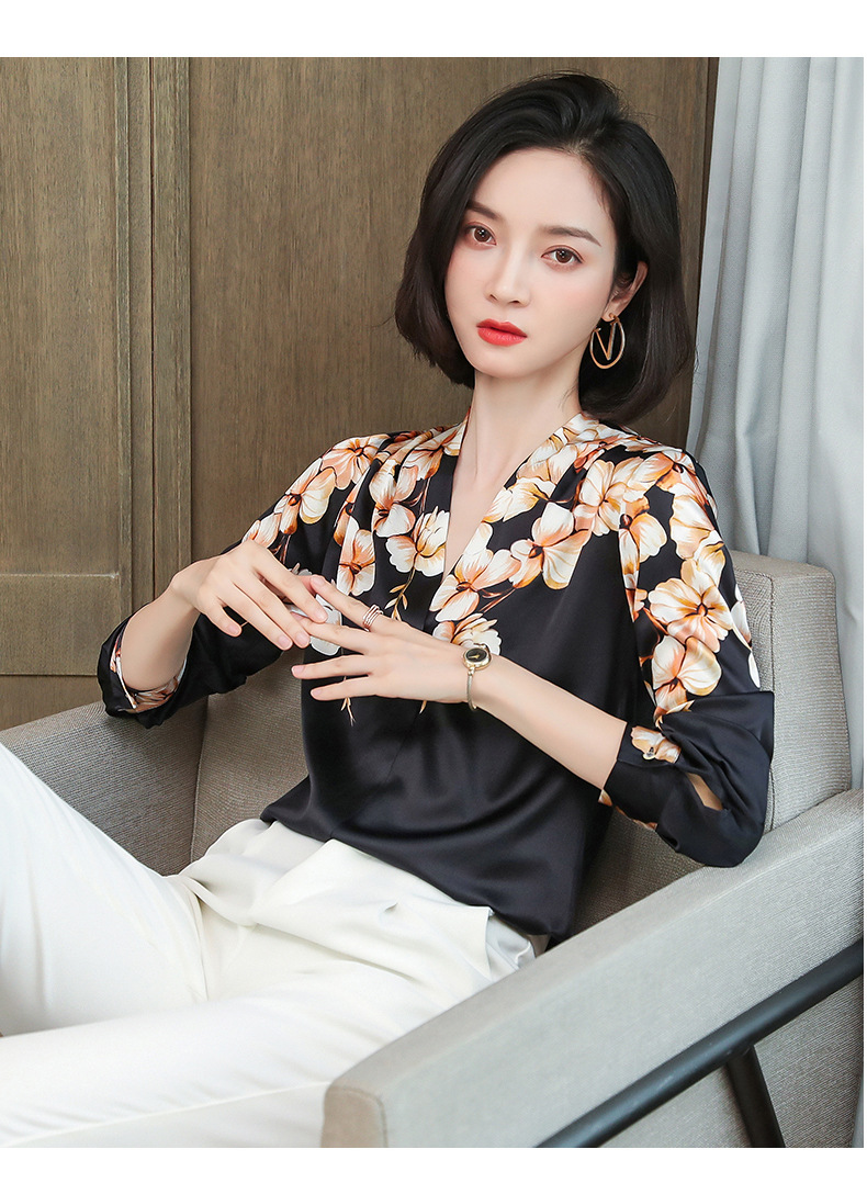 真丝衬衫女长袖年秋装新款V领缎面定位花衬衣桑蚕丝上衣