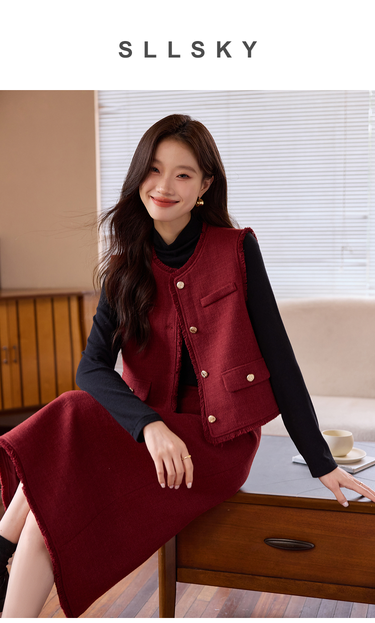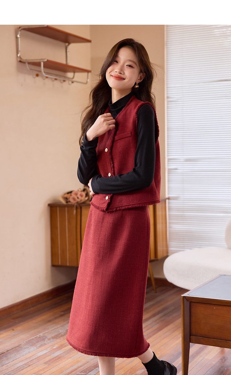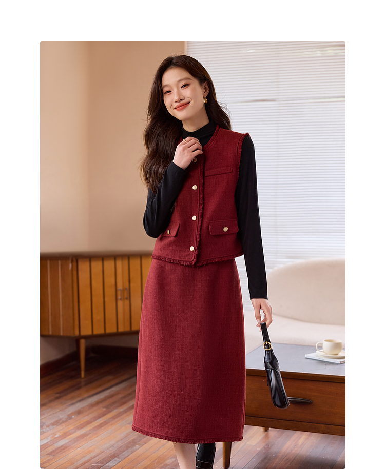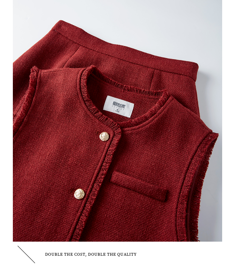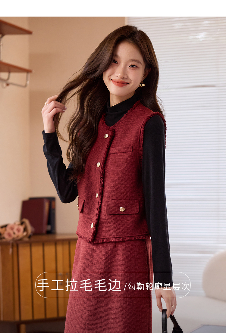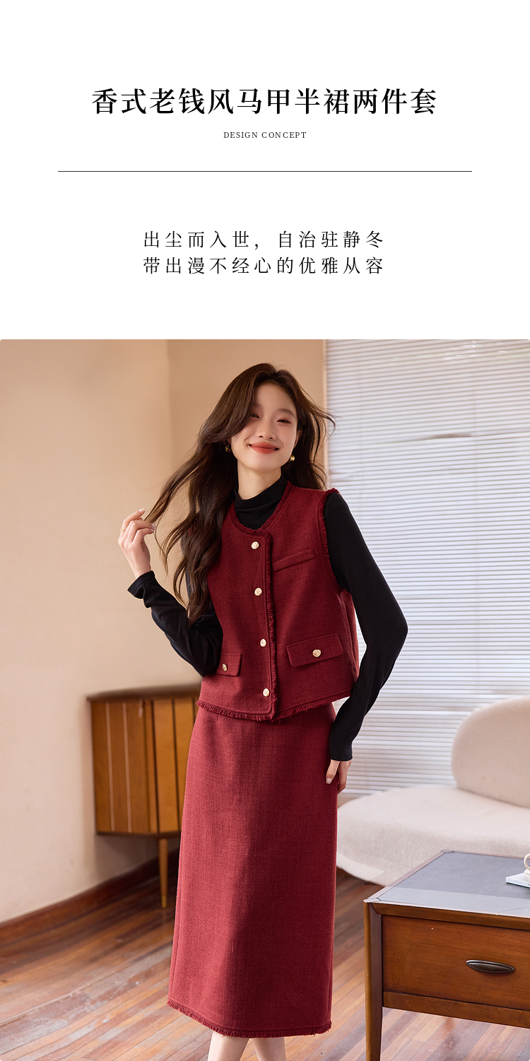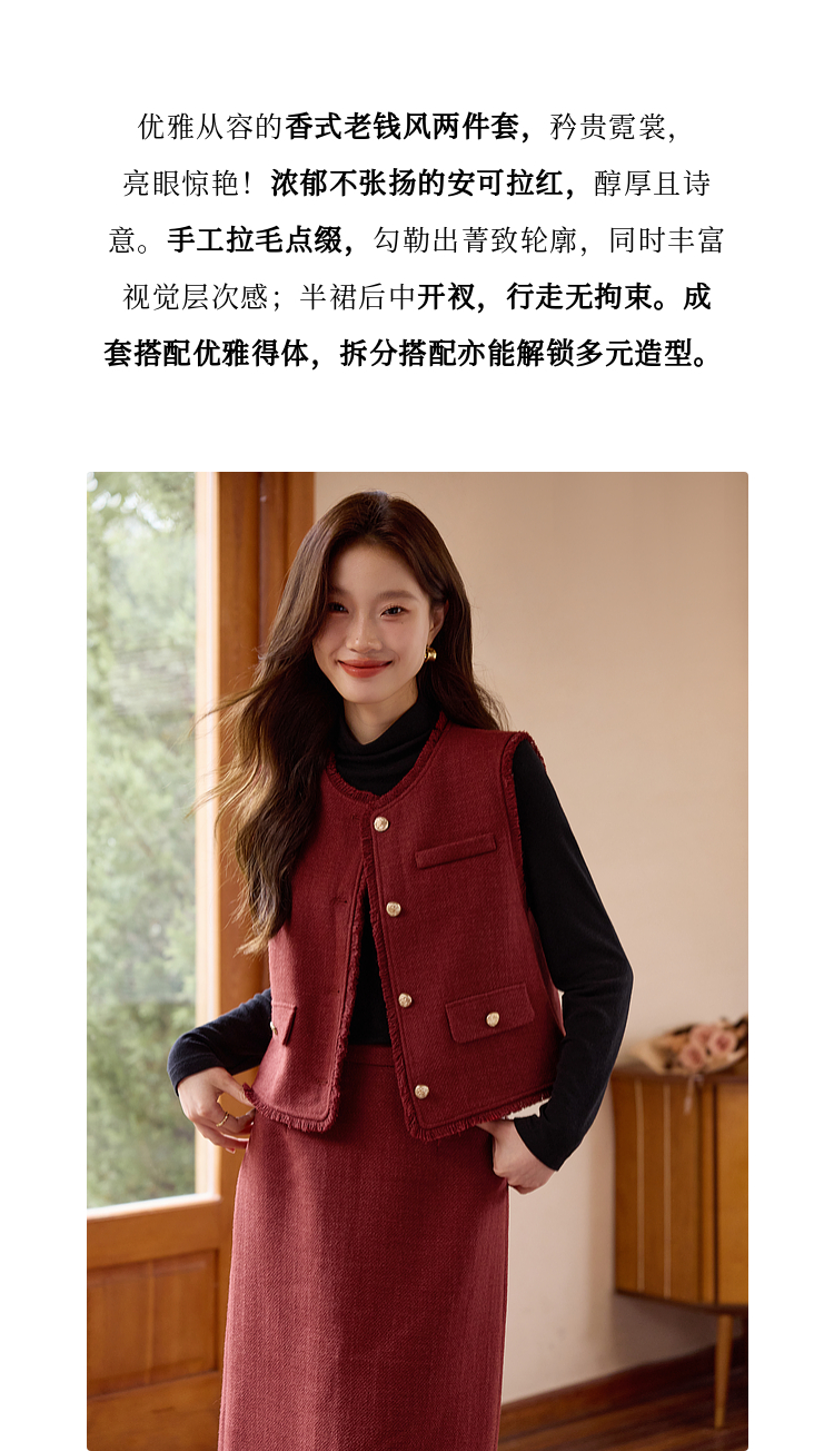 【年终特卖】熙世界小香风套装女安可拉红2025秋冬款粗花呢马甲半身裙两件套