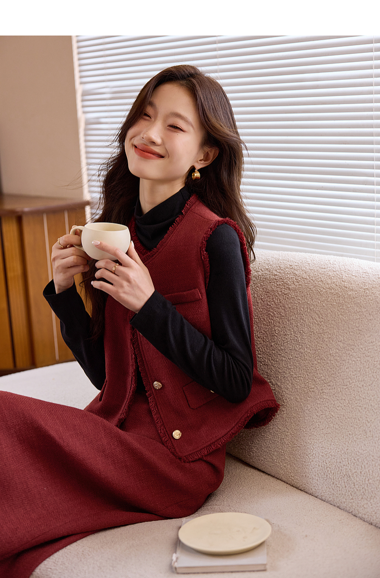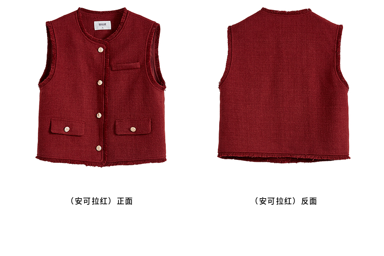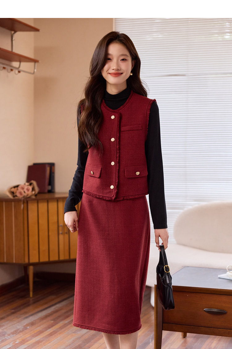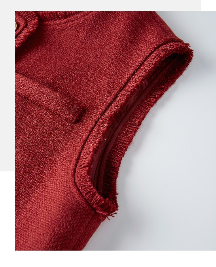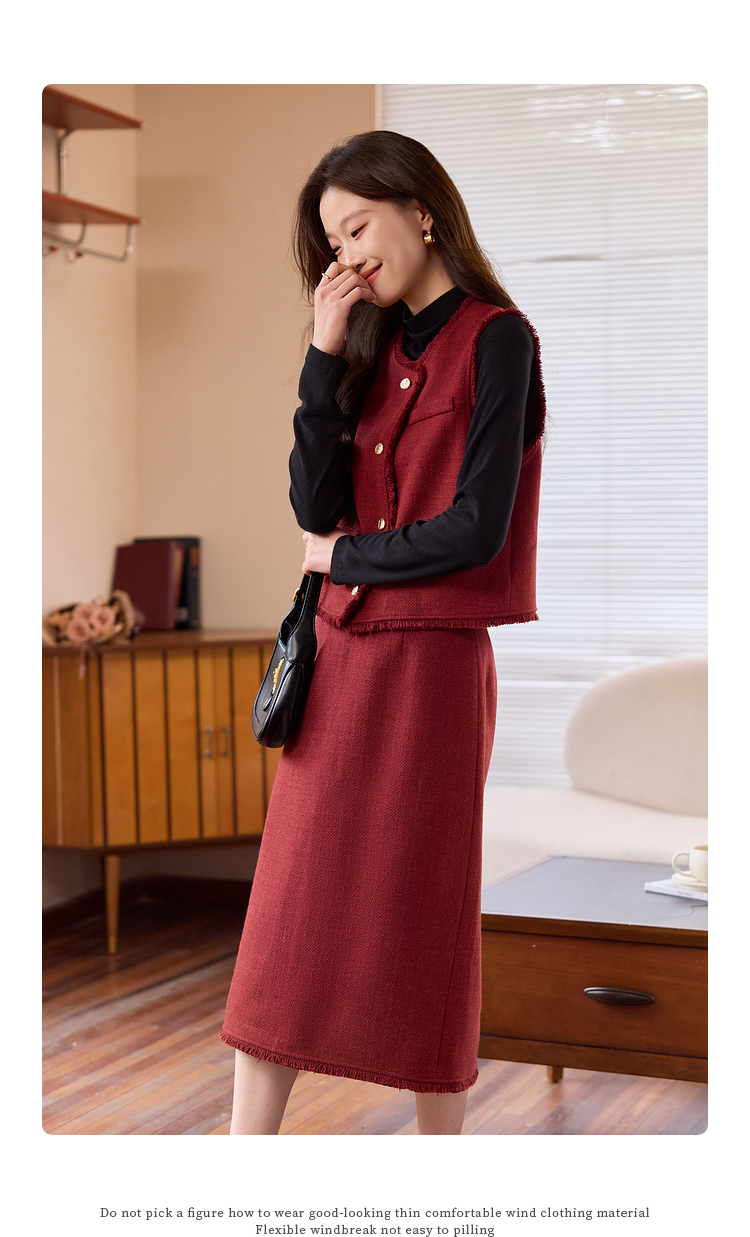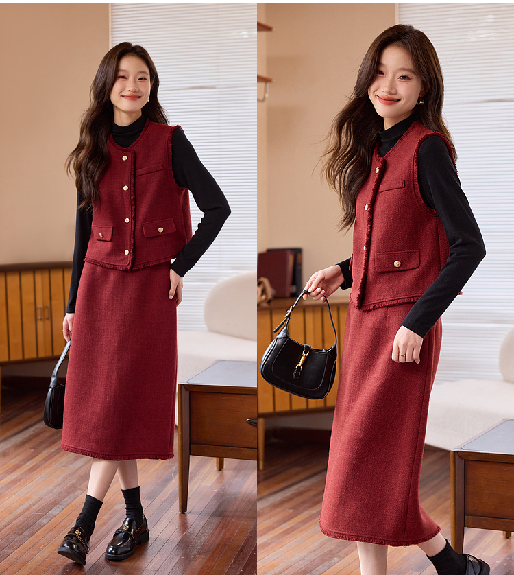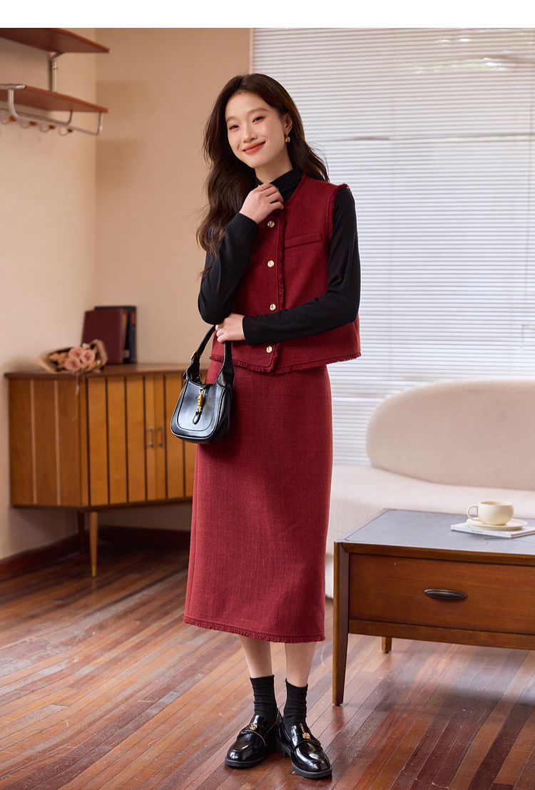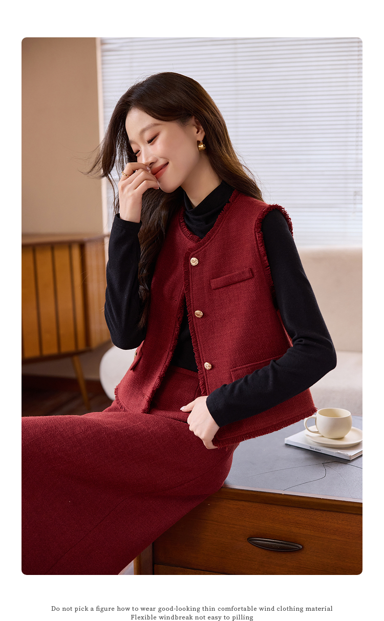 【年终特卖】熙世界小香风套装女安可拉红2025秋冬款粗花呢马甲半身裙两件套