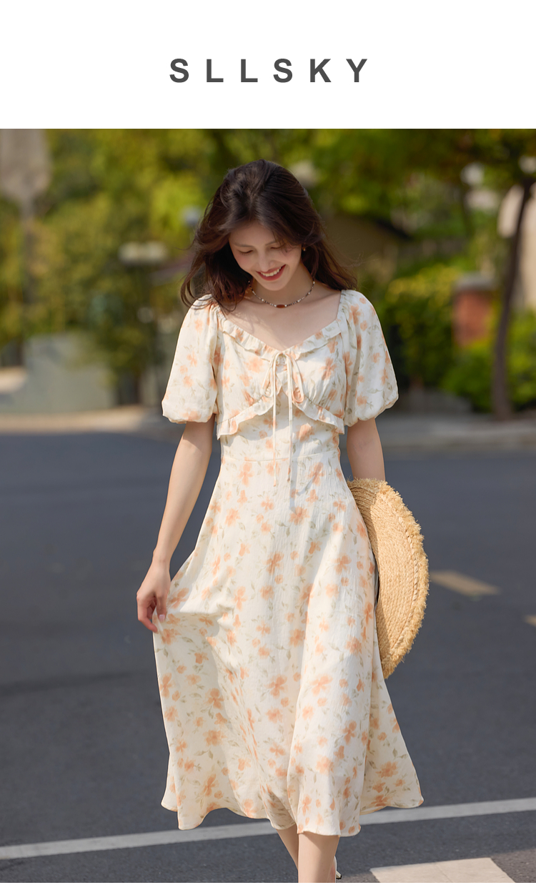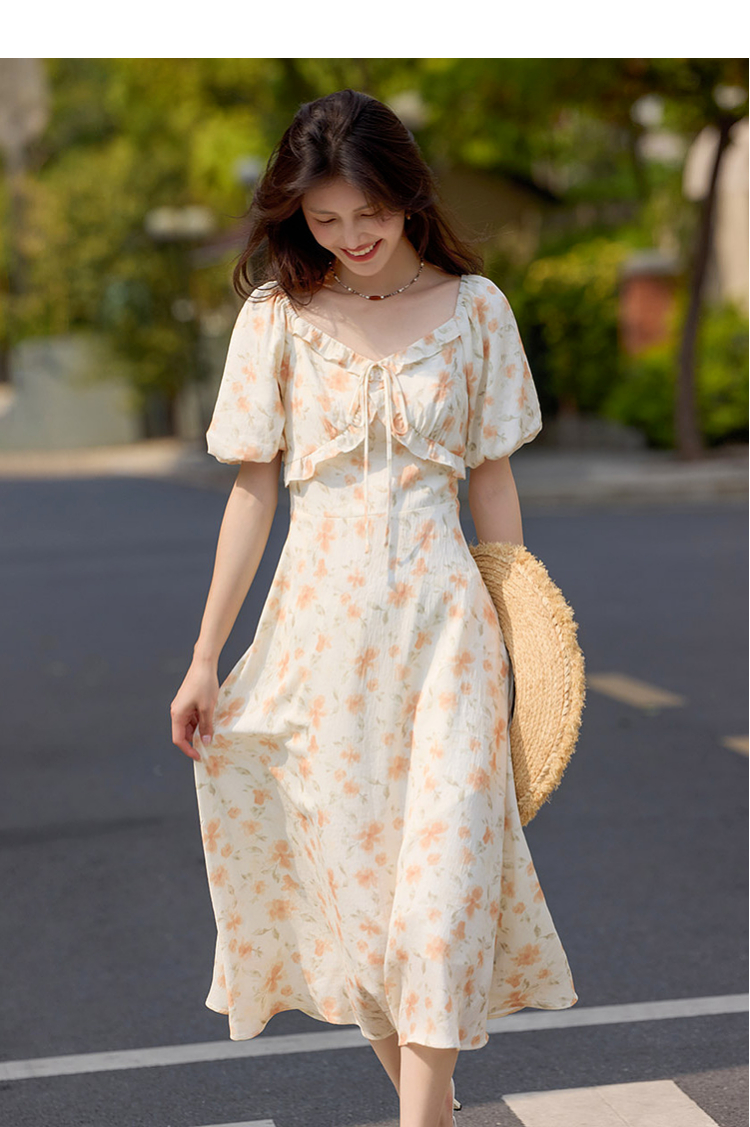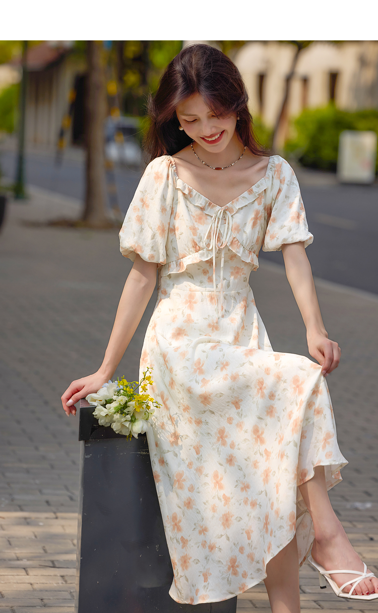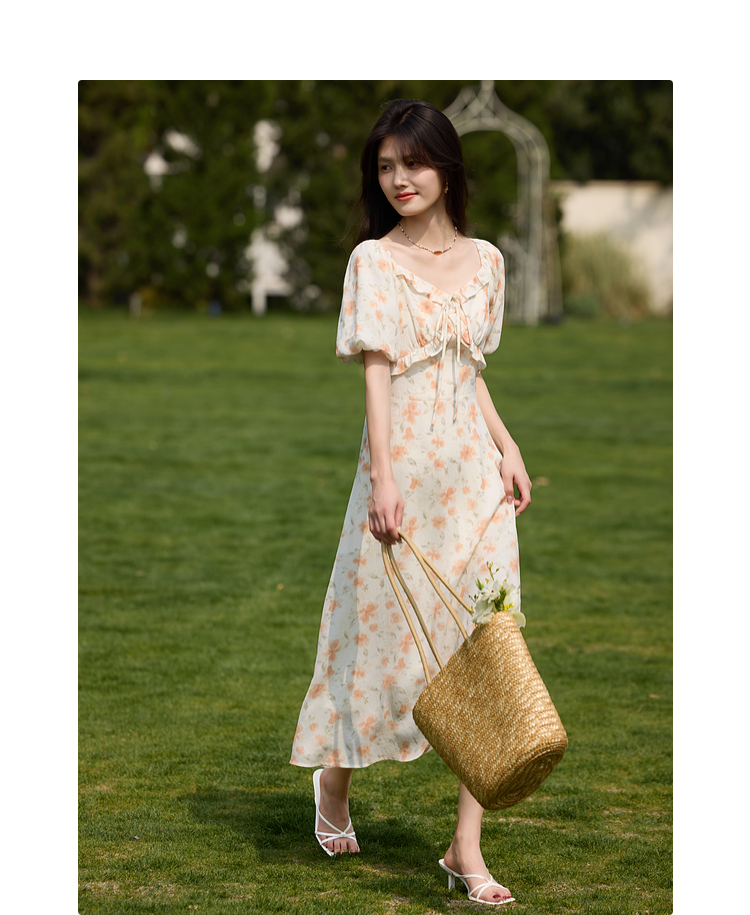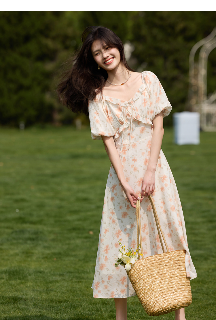 【专属特价】熙世界法式灯笼袖碎花连衣裙女夏日新款浪漫气质收腰显瘦雪纺长裙