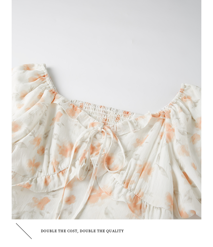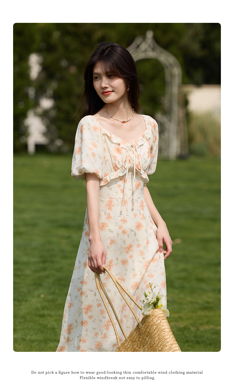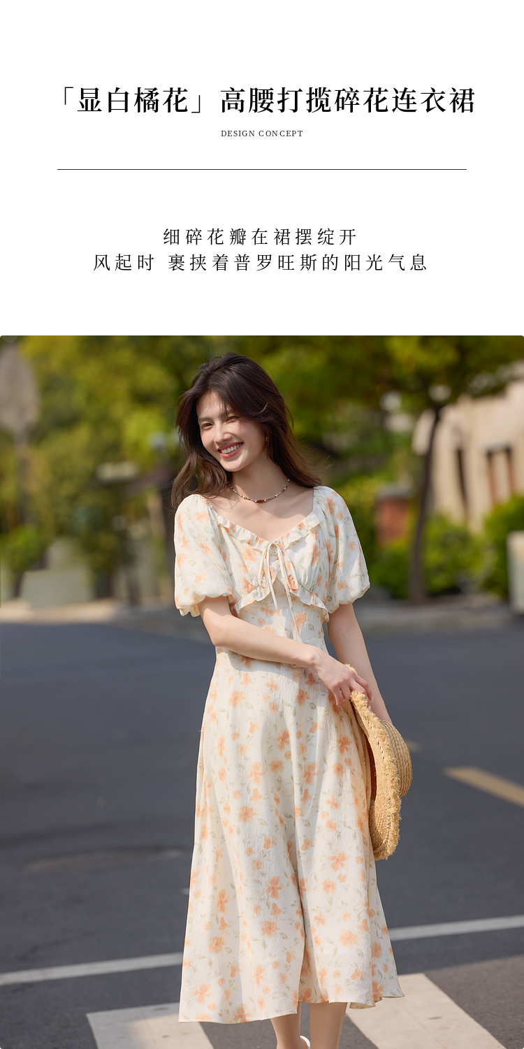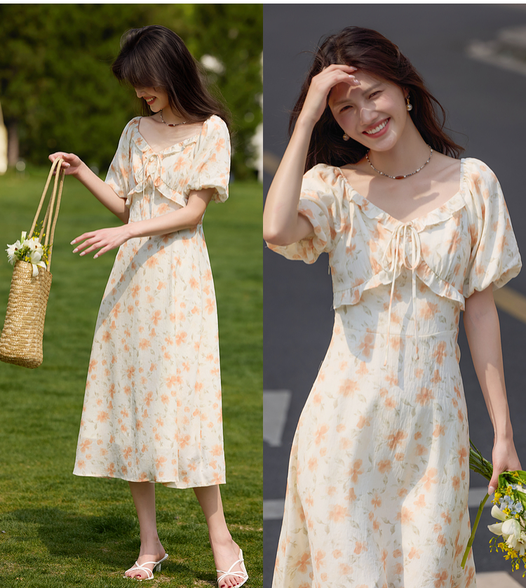 【专属特价】熙世界法式灯笼袖碎花连衣裙女夏日新款浪漫气质收腰显瘦雪纺长裙