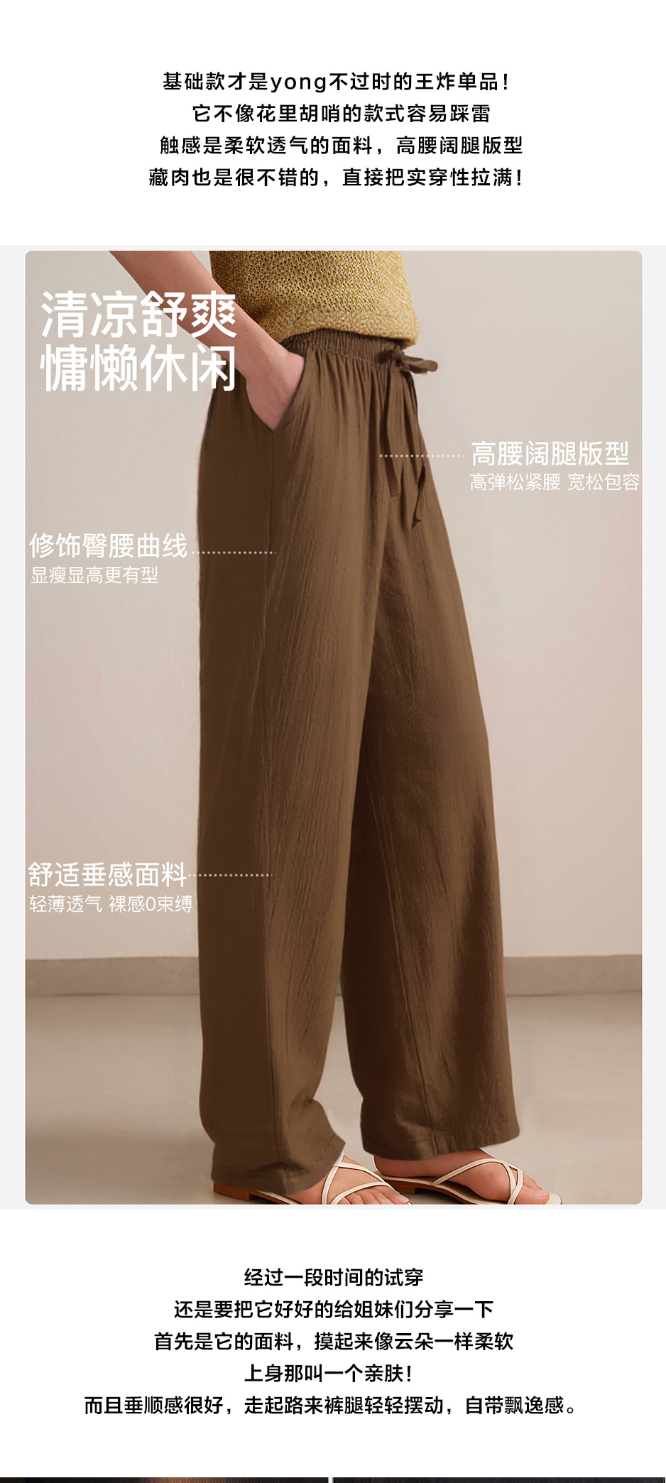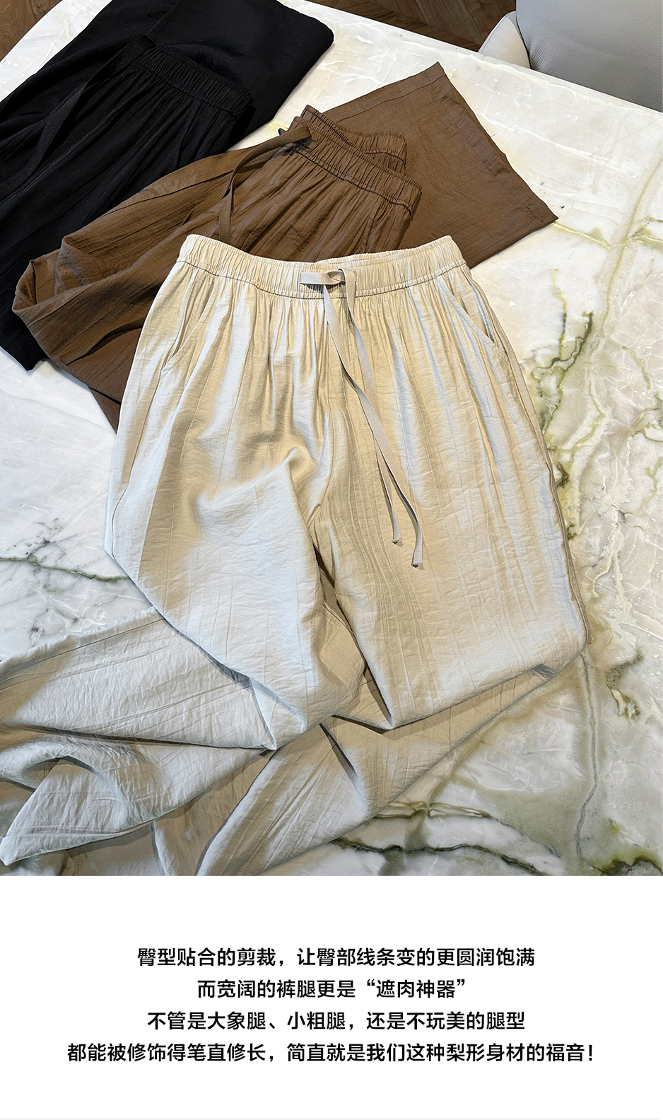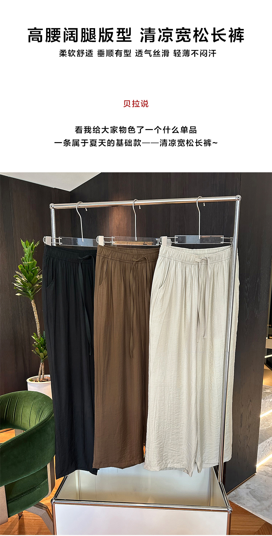 高腰阔腿版型 清凉宽松长裤 柔软舒适 垂顺有型 透气丝滑 轻薄不闷汗