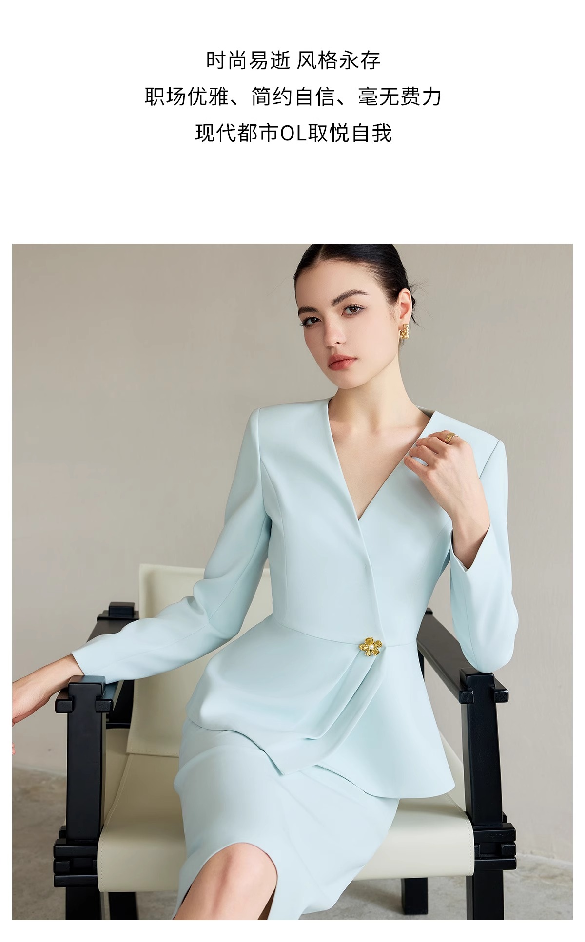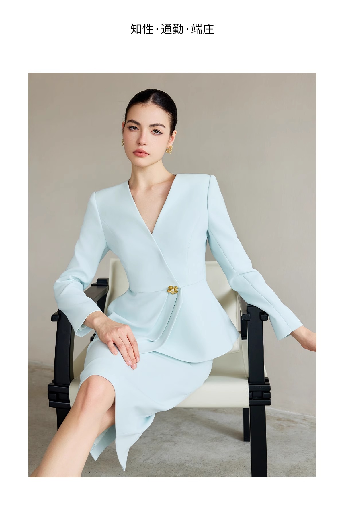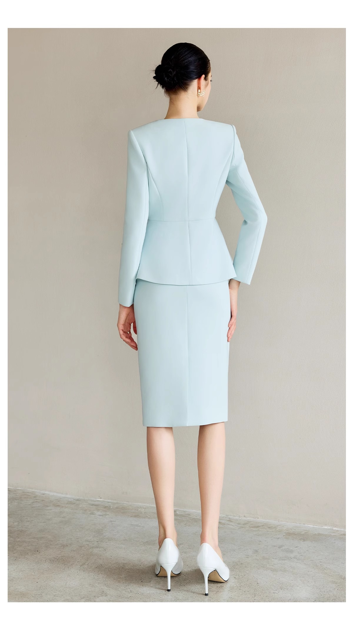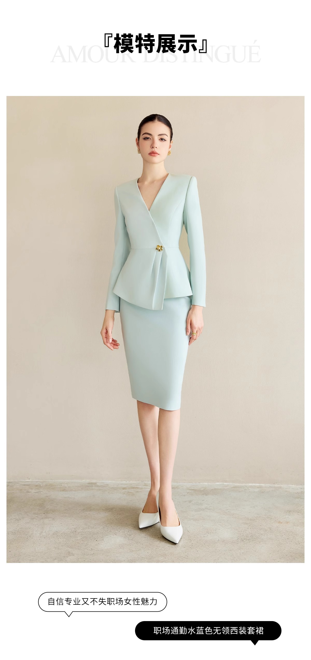 IWY/水蓝色无领蓝色正装套装裙西装高端新款气质主持商务套裙CS2226