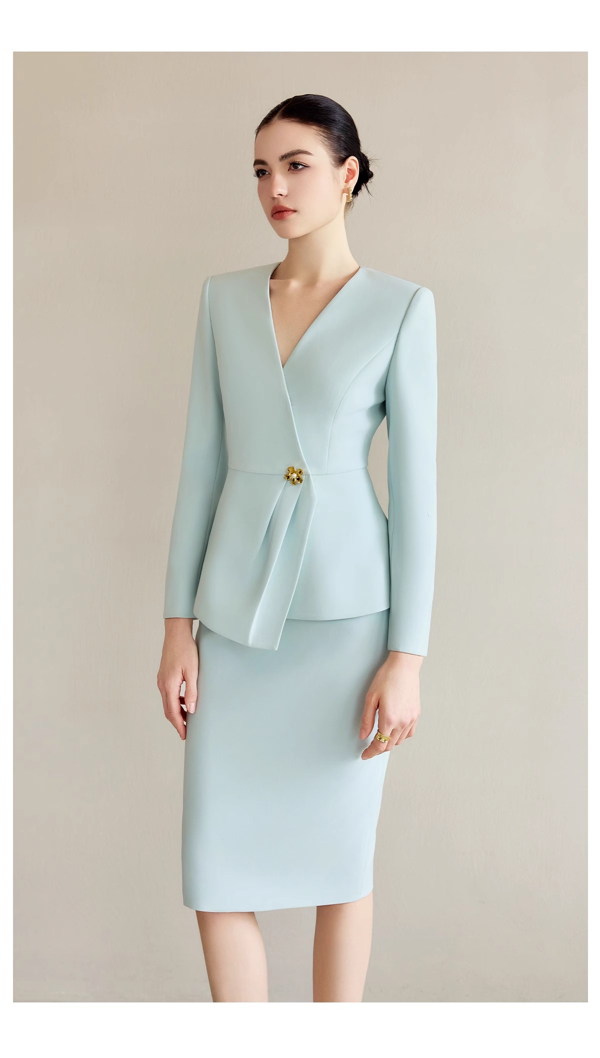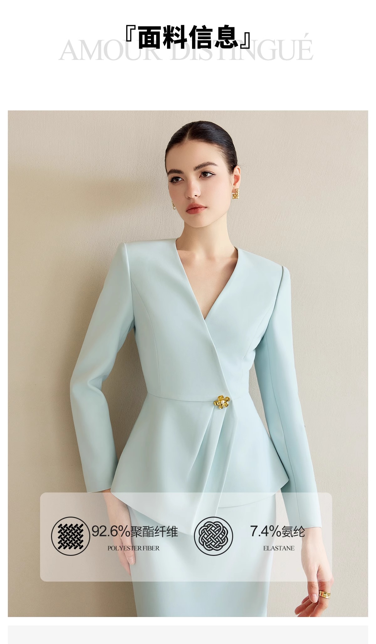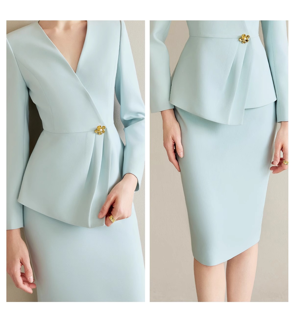 IWY/水蓝色无领蓝色正装套装裙西装高端新款气质主持商务套裙CS2226