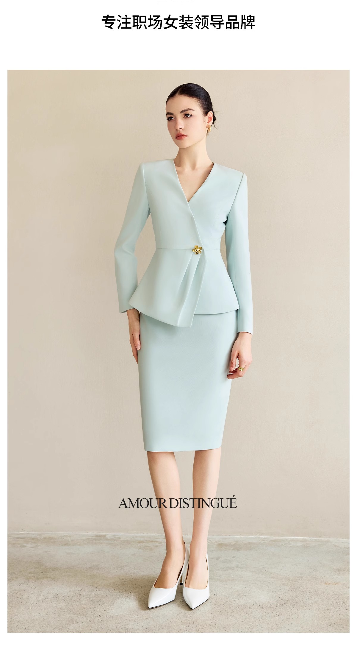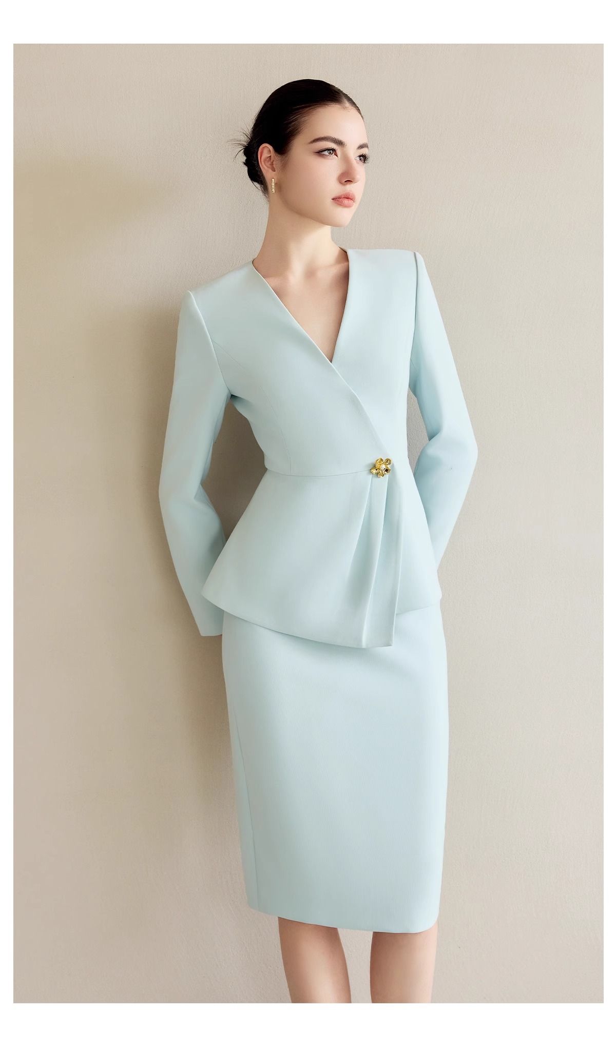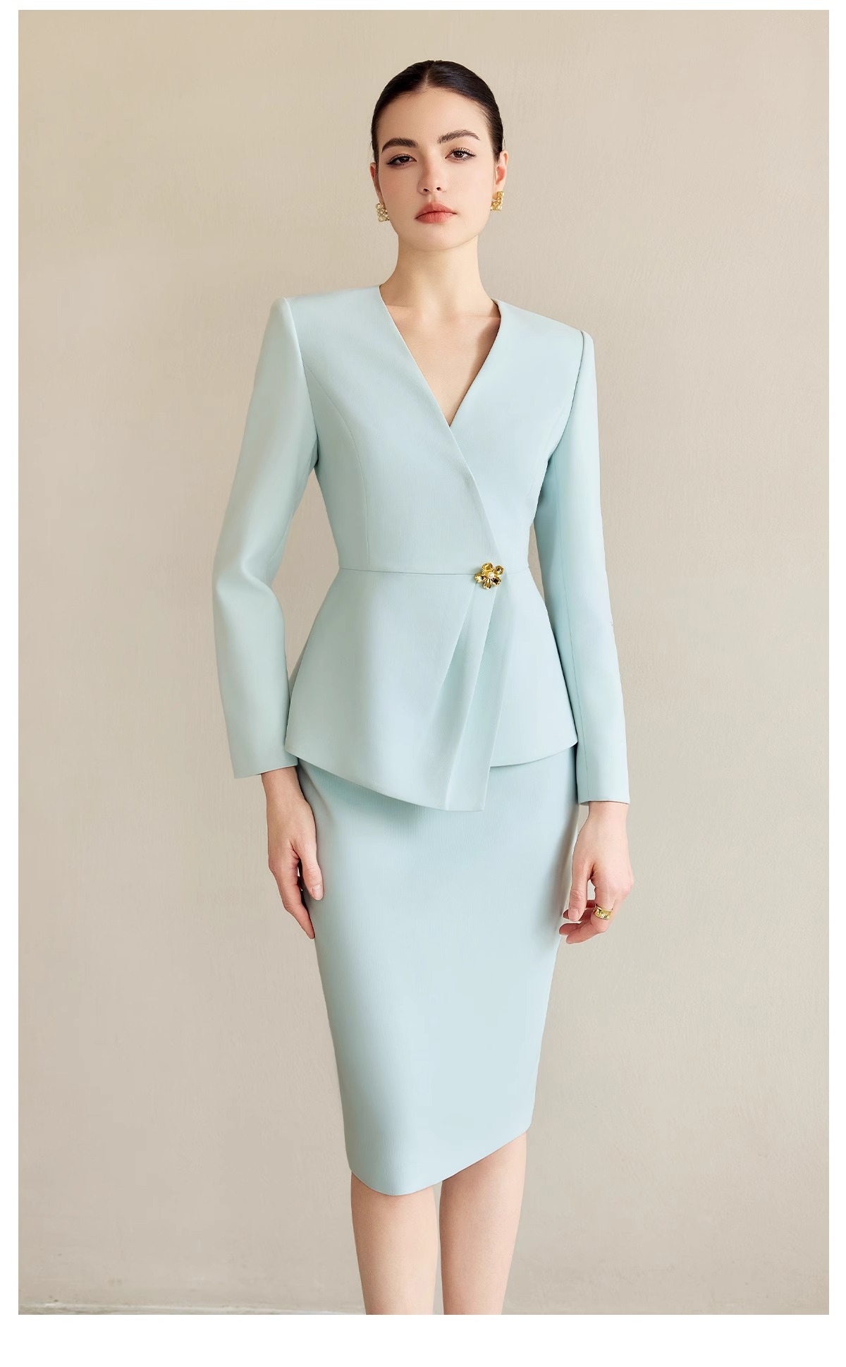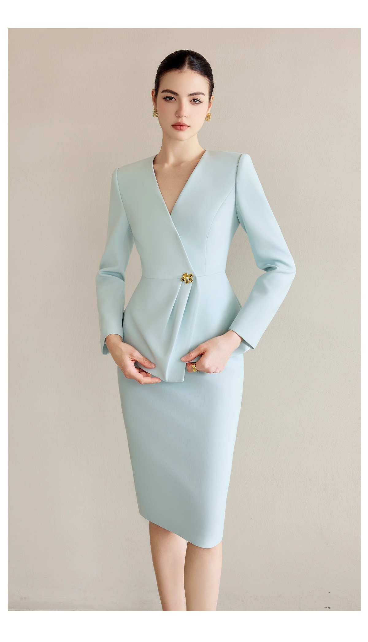 IWY/水蓝色无领蓝色正装套装裙西装高端新款气质主持商务套裙CS2226