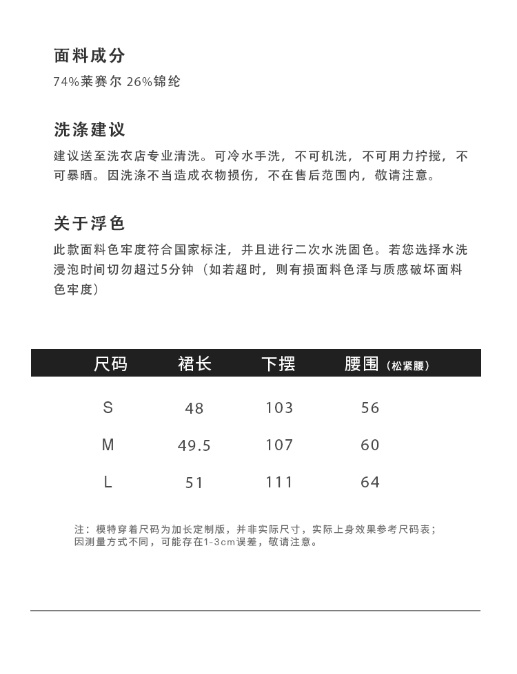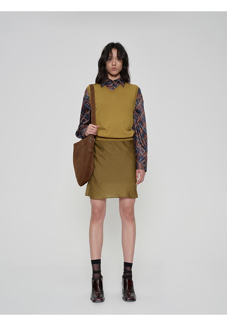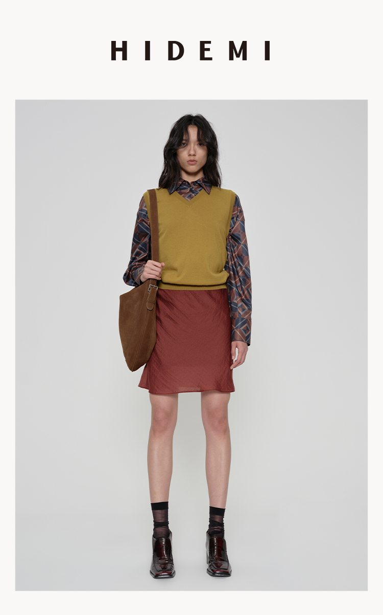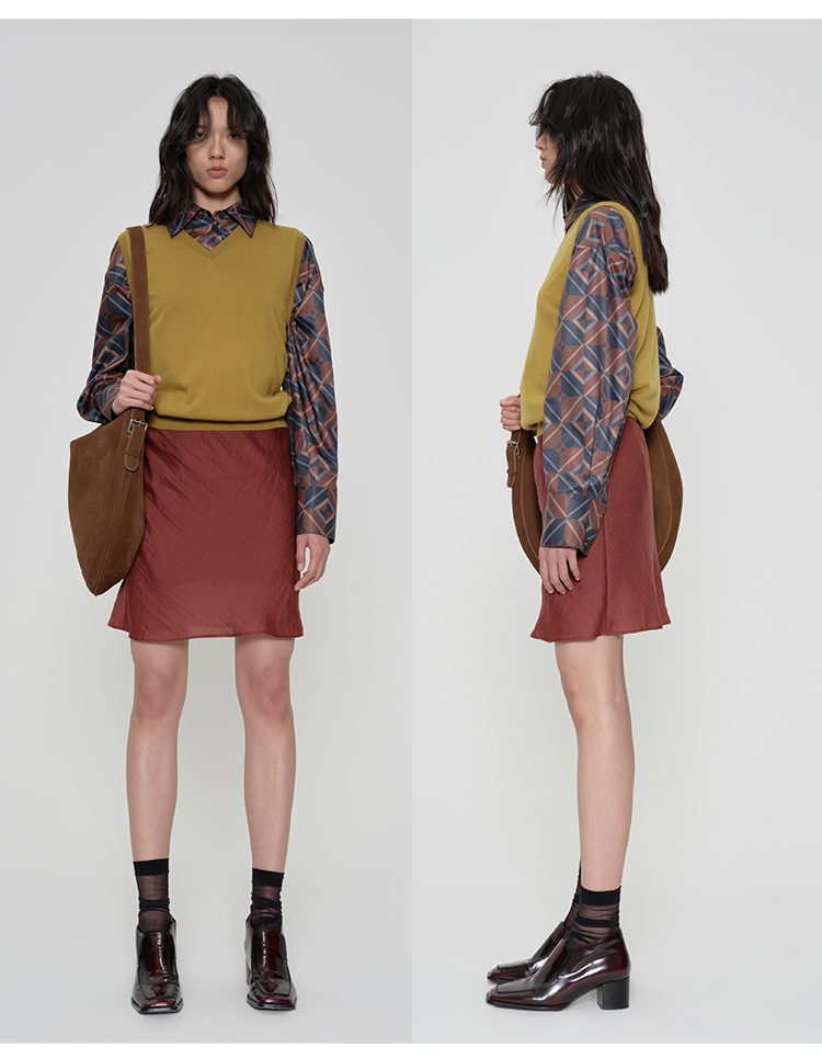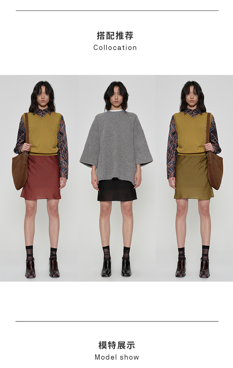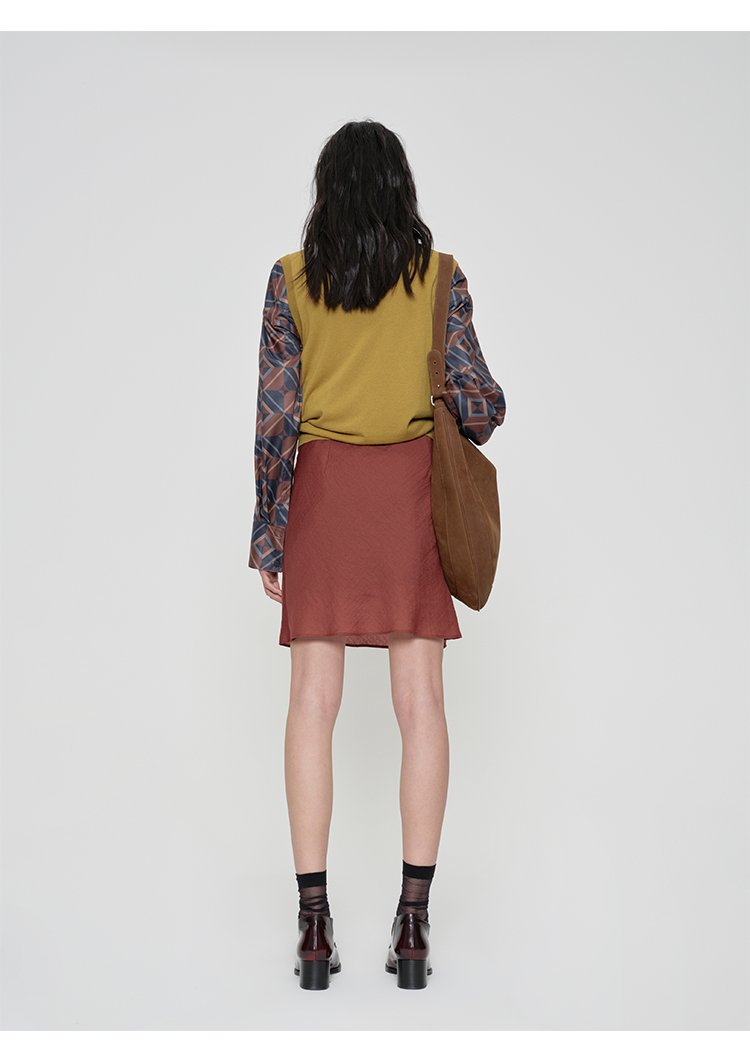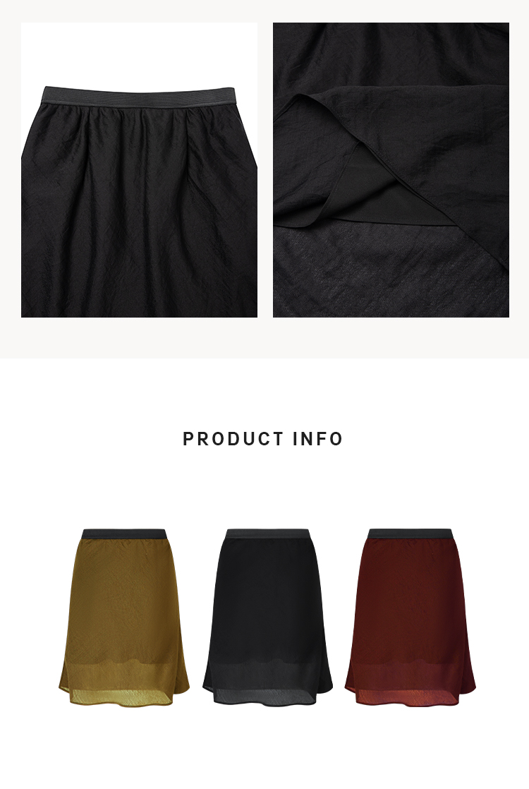 HIDEMI 极简法式松紧腰双层砂洗缎面中裙半身裙 复古黑/复古红/复古绿