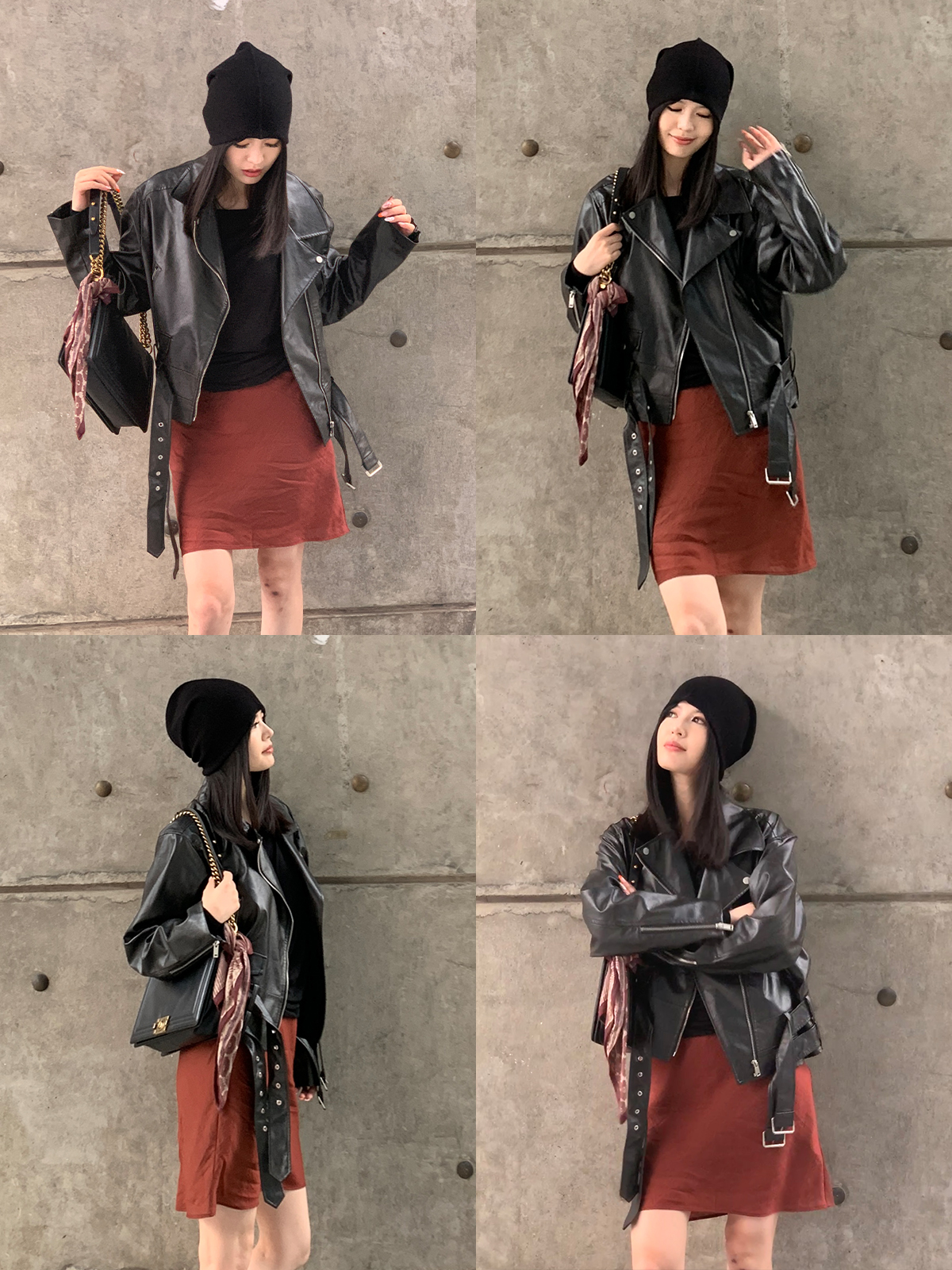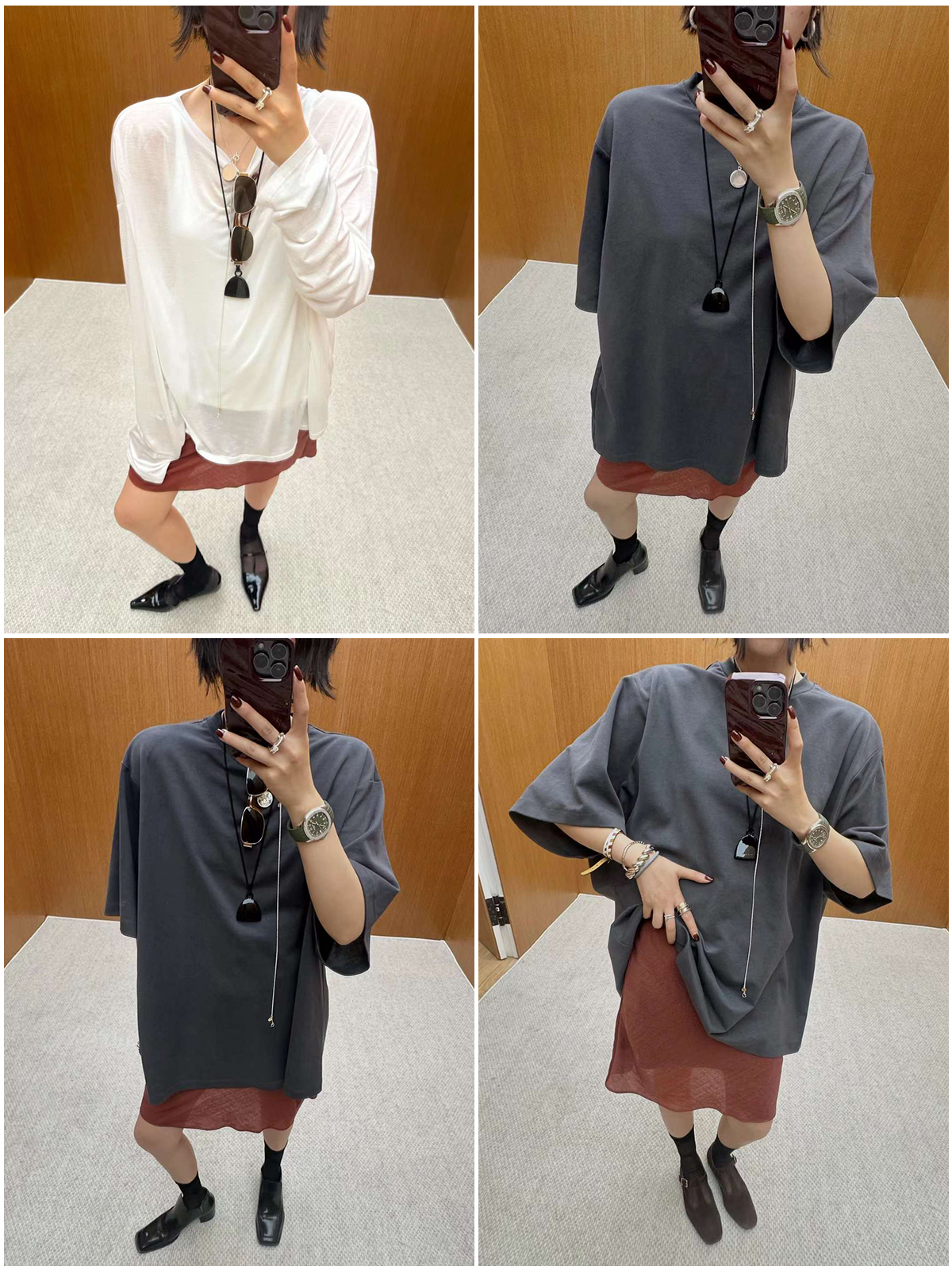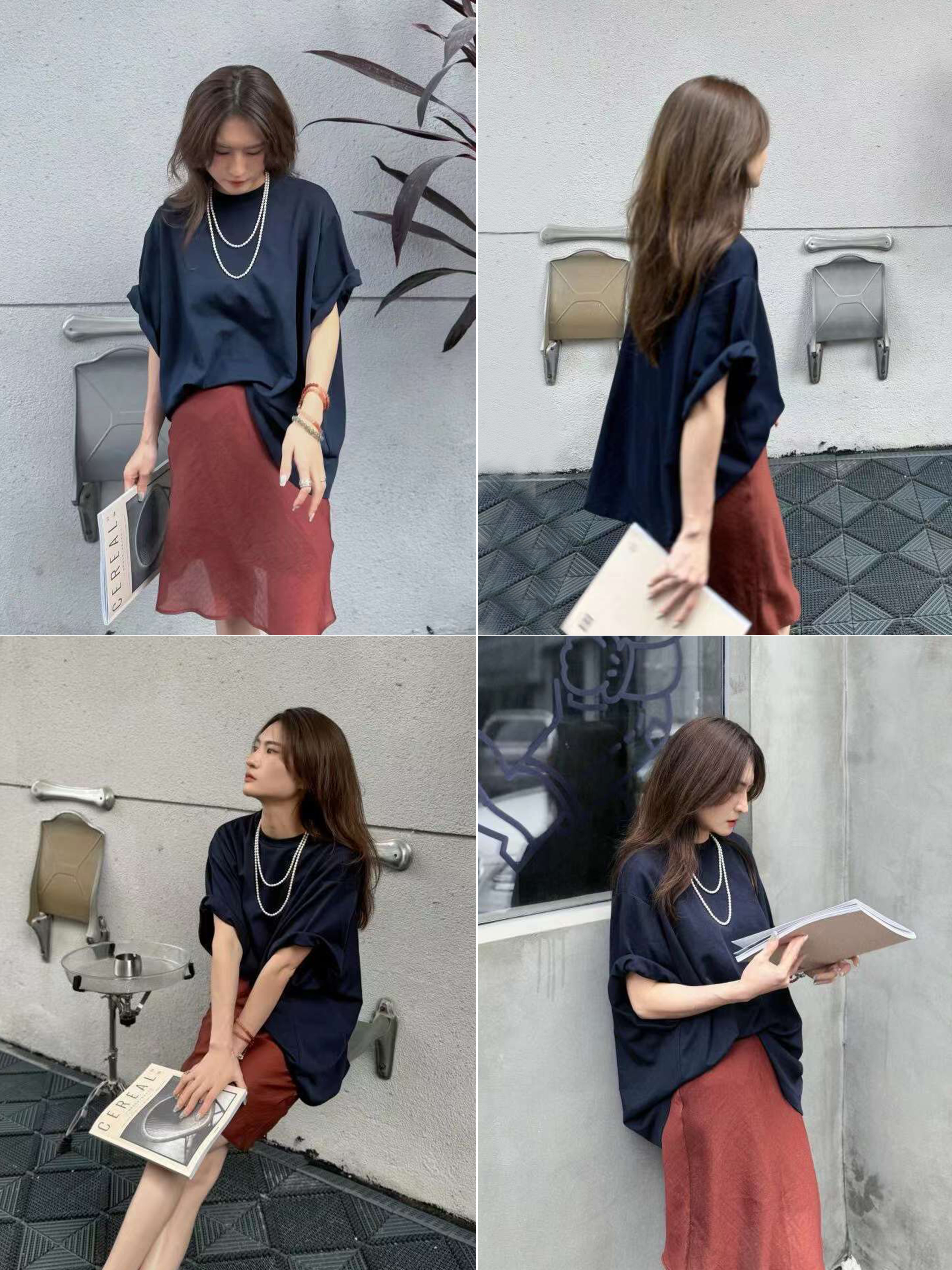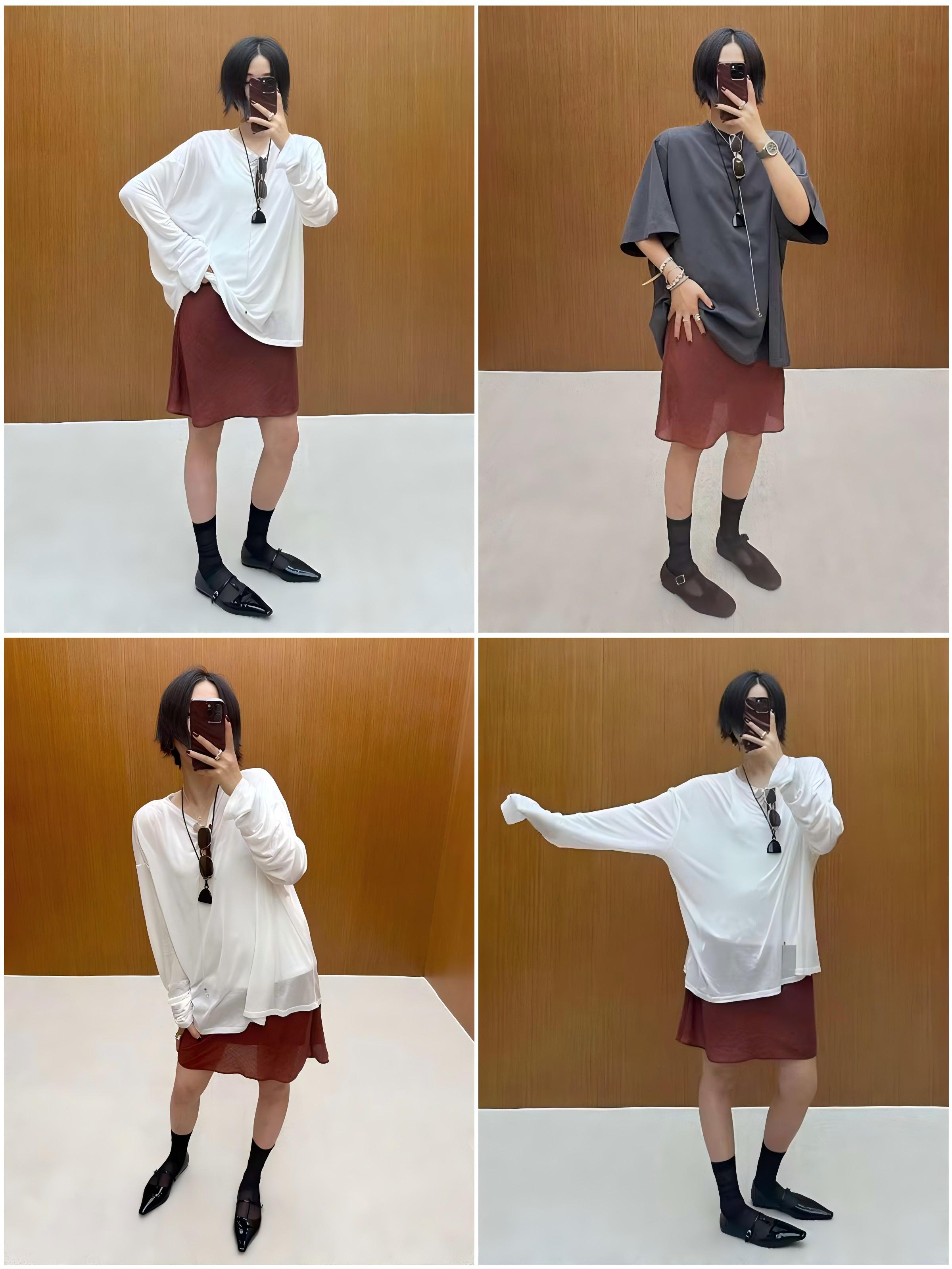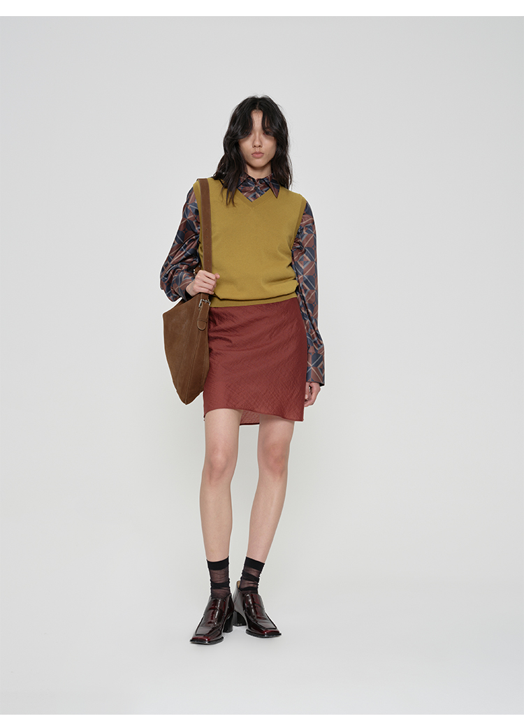 HIDEMI 极简法式松紧腰双层砂洗缎面中裙半身裙 复古黑/复古红/复古绿