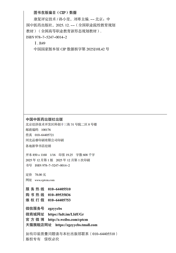 康复评定技术 全国高等职业教育新形态规划教材 孙小斐 刘尊 供康复治疗技术 中医康复技术 临床医学等专业使用 中国中医药出版社
