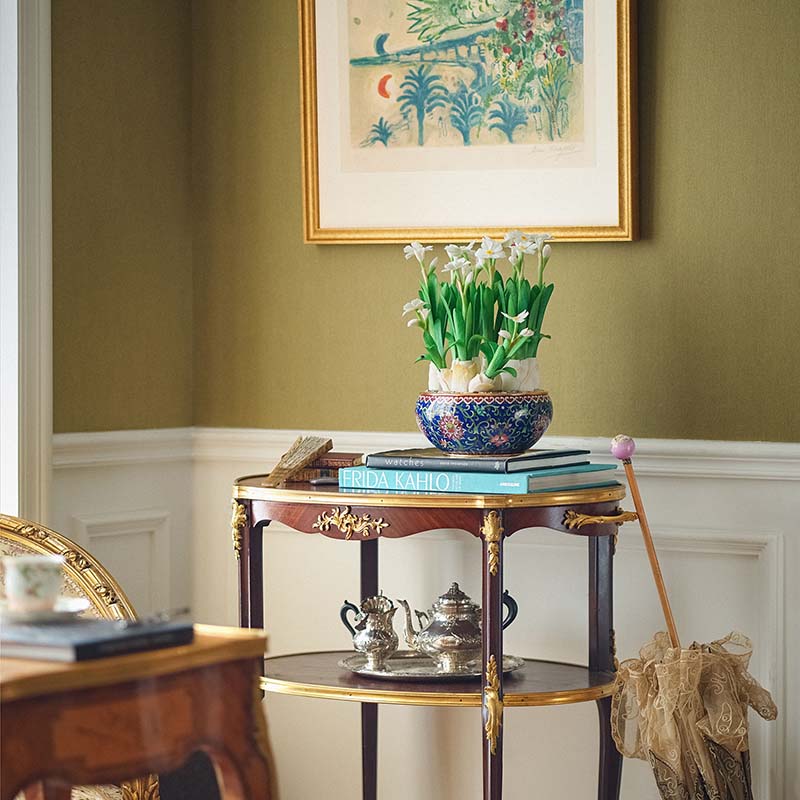 【已售】独角鹿西洋古董 20世纪中国创汇时期出品宝相花纹景泰蓝盆装饰「素洁水仙」珍宝像生盆景