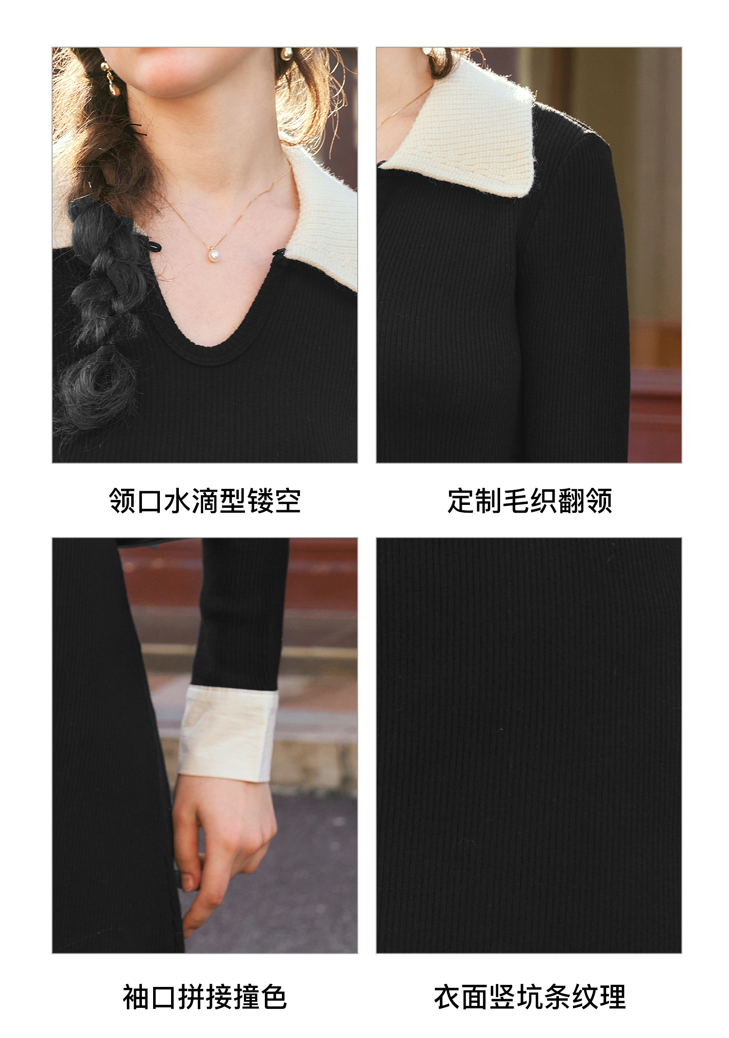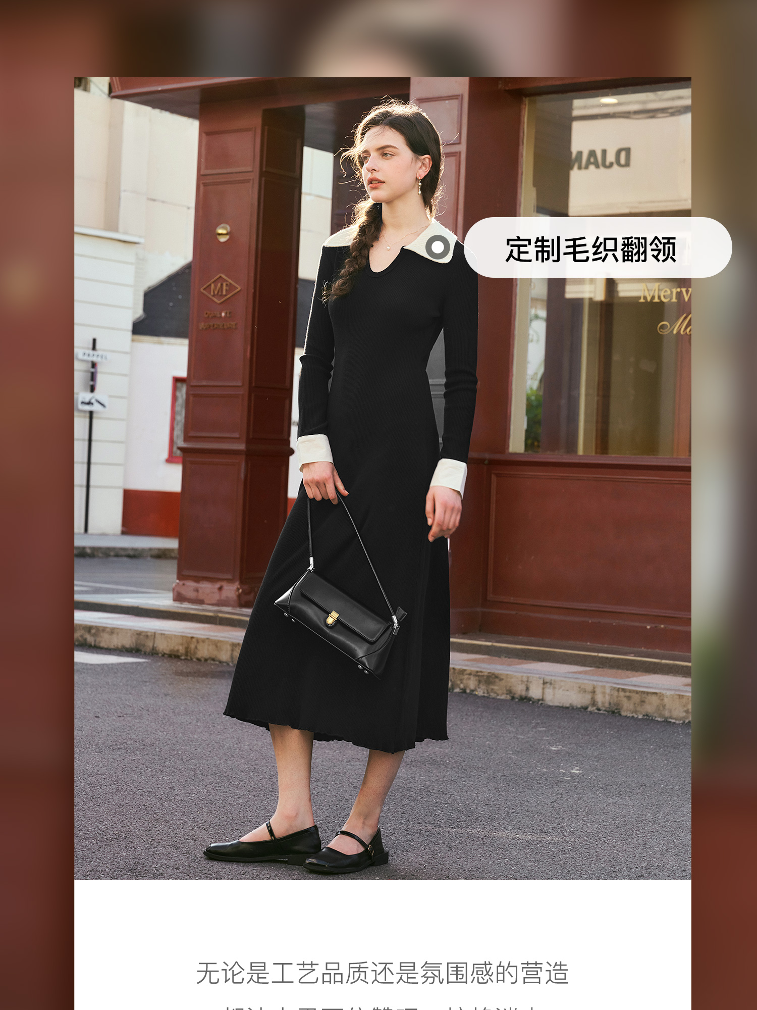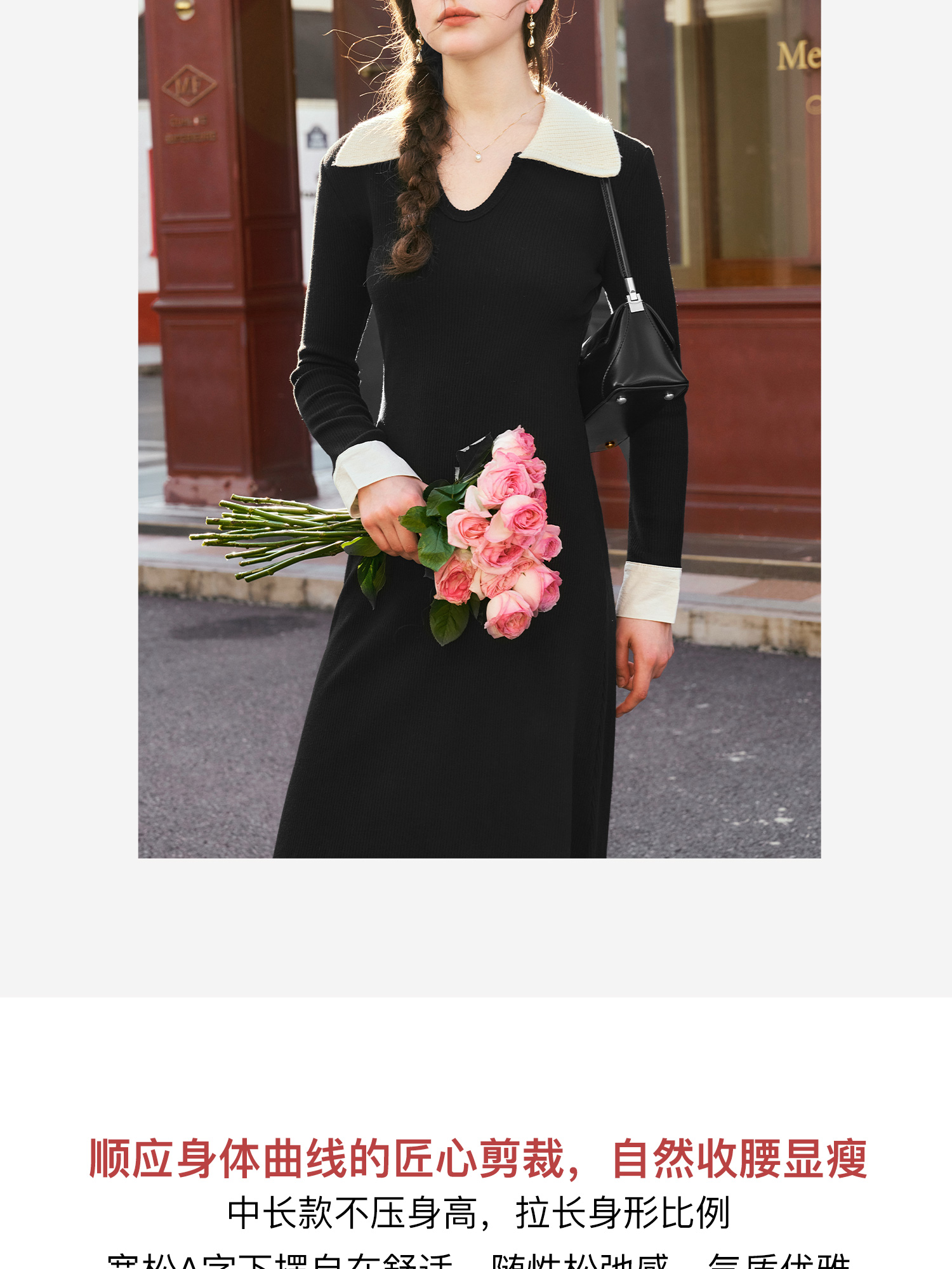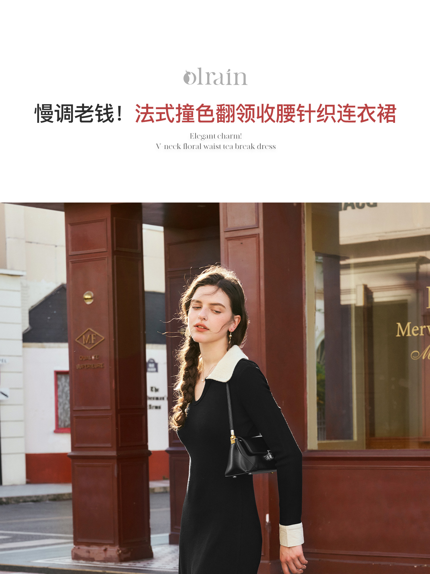 OLrain欧芮儿法式针织连衣裙女秋季2024新款撞色翻领收腰显瘦裙子