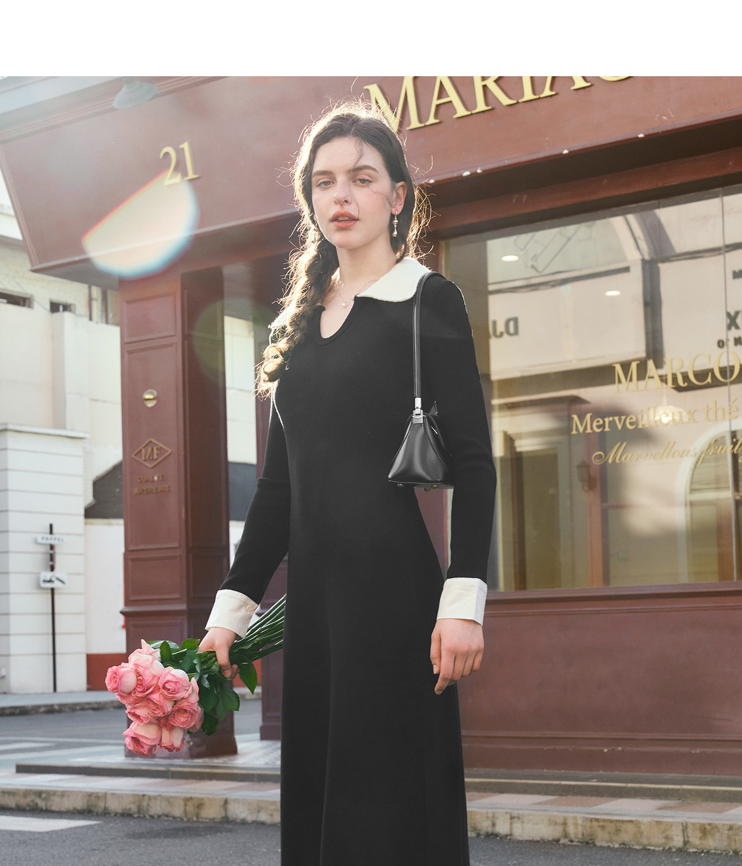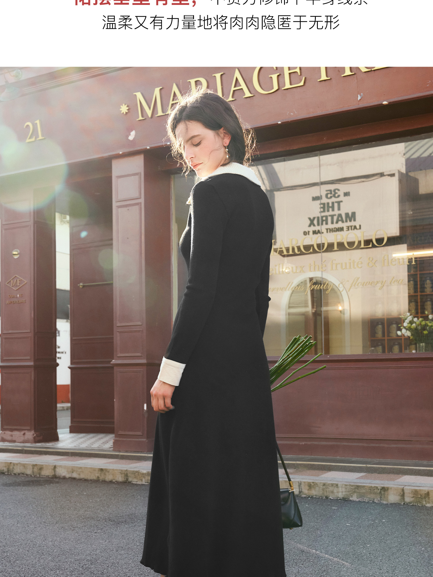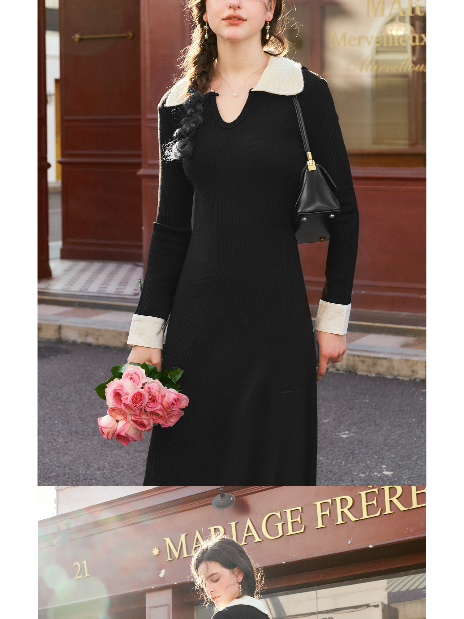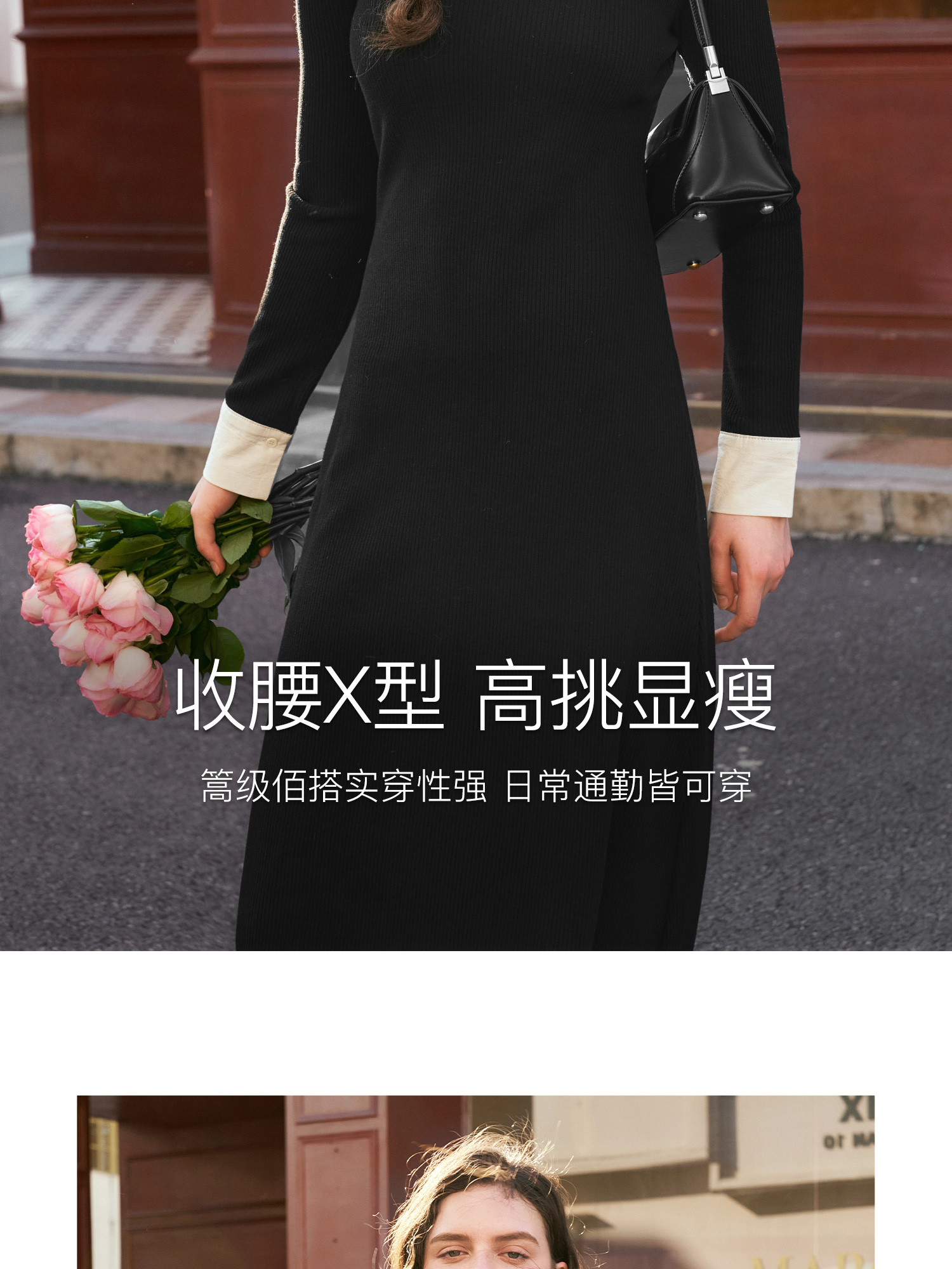 OLrain欧芮儿法式针织连衣裙女秋季2024新款撞色翻领收腰显瘦裙子