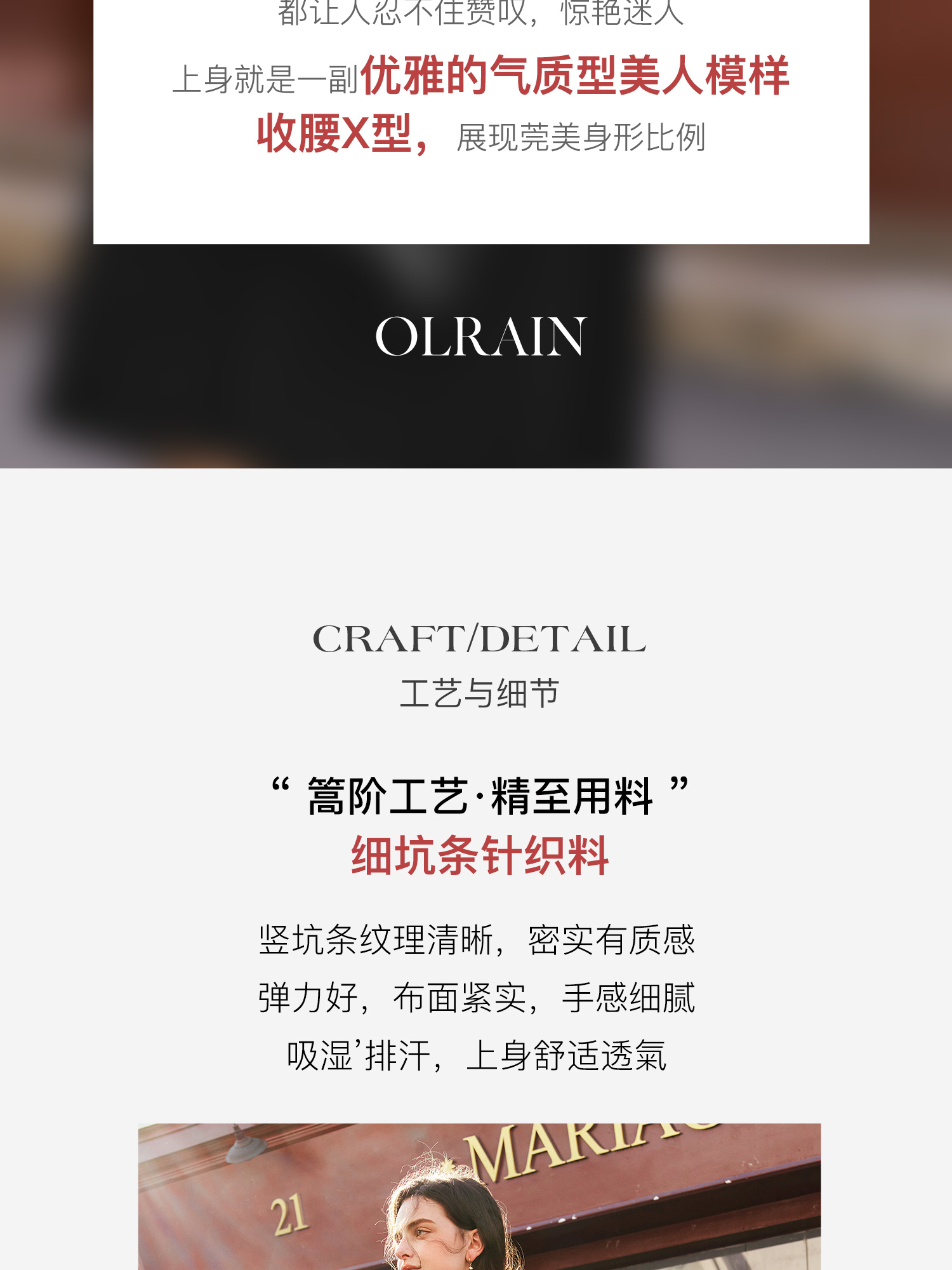 - “精致”是欧芮儿olrain品牌文化的核心,欧芮儿认为,精致的女人,不但要外在动人,更要内在迷人,内外兼修,有魅力、有气质、有内涵,自信而不自傲,优雅而不矫揉,自有万种风情而不轻浮,更不故作矜持。