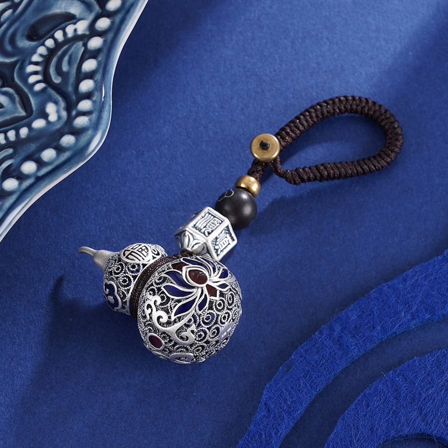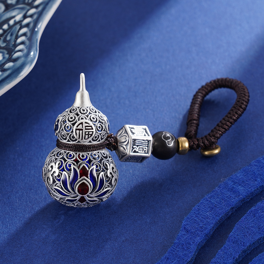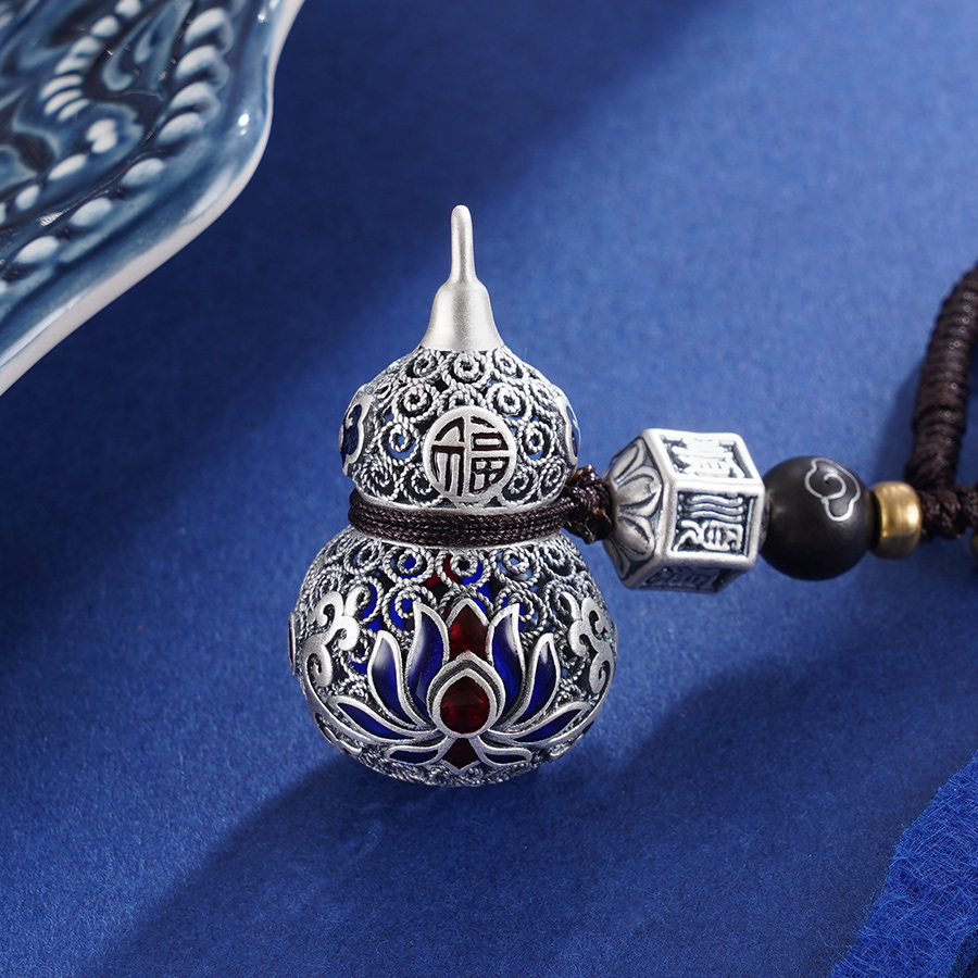【寓意】:作品以葫芦为灵感设计,采用银花丝工艺打造,镂空的编织纹理,表面点缀莲花图案,整体立体饱满,大小适中。寓意福禄相伴,一路荣华。