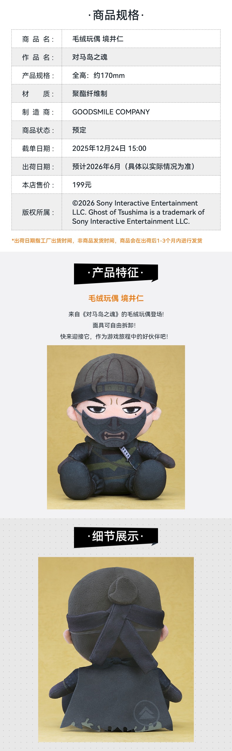 【GSC预售定金】毛绒玩偶 境井仁 对马岛之魂 手办模玩周边