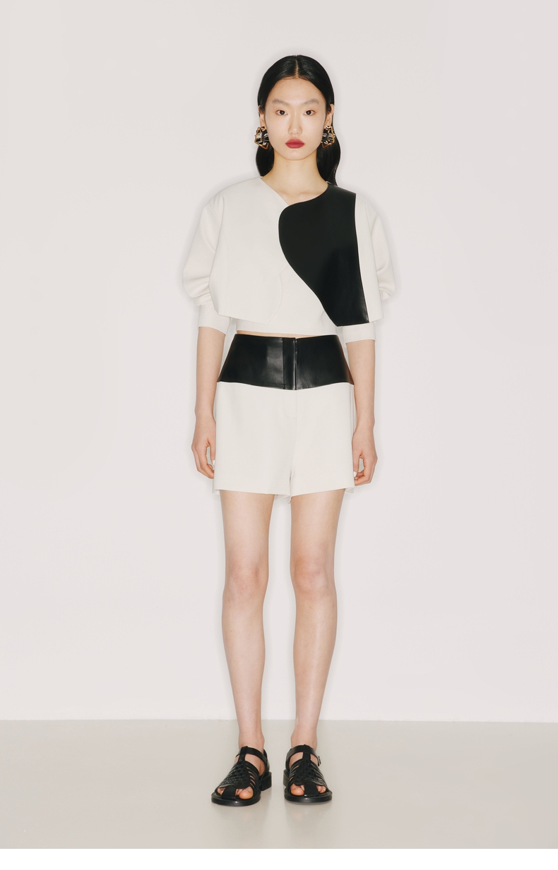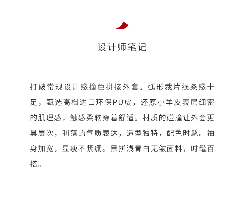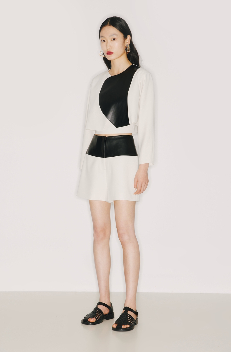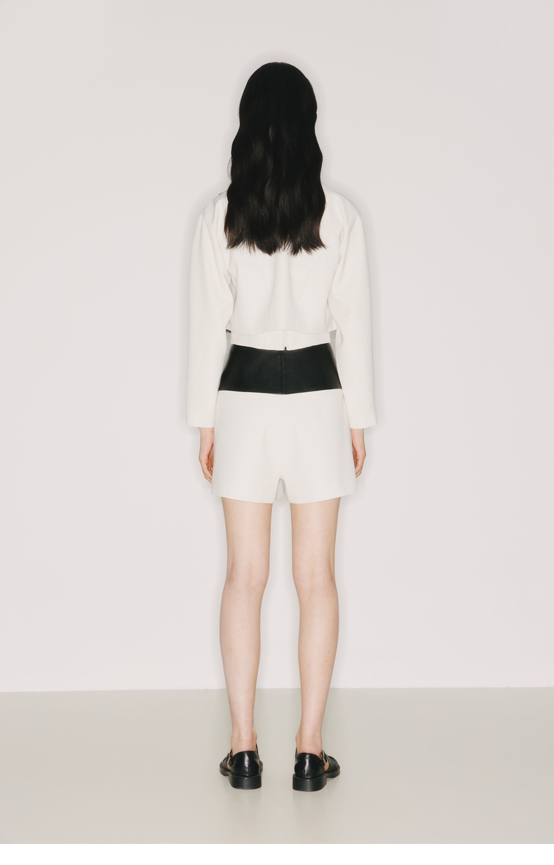 【潮汐】异形设计环保PU皮质撞色拼接浅青白短款外套/220010