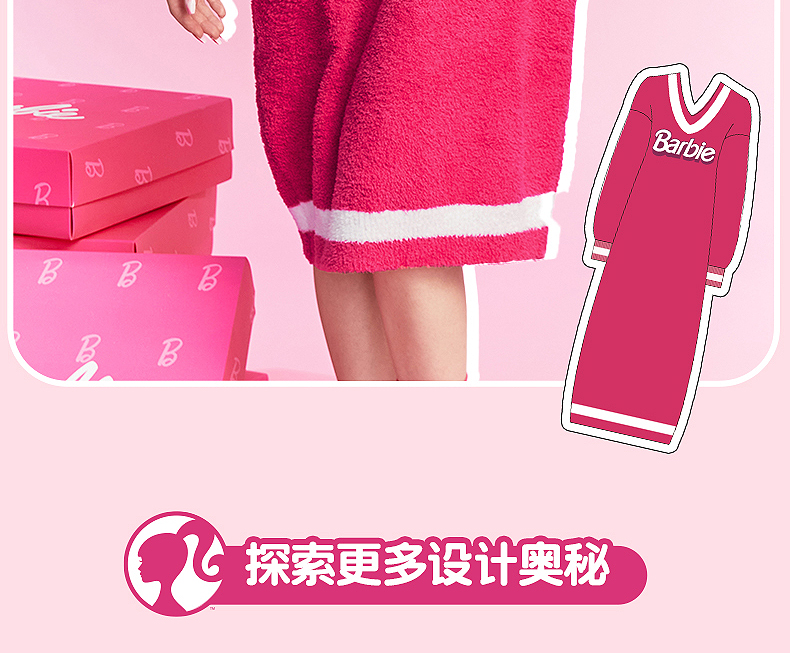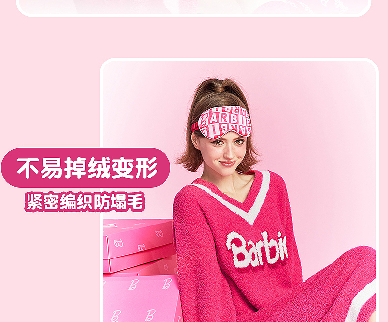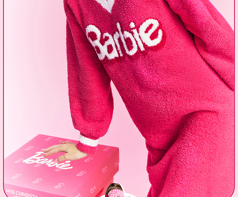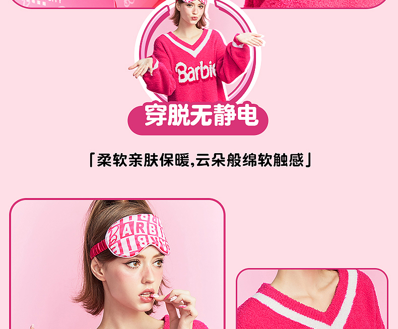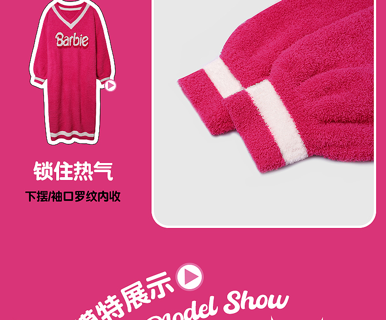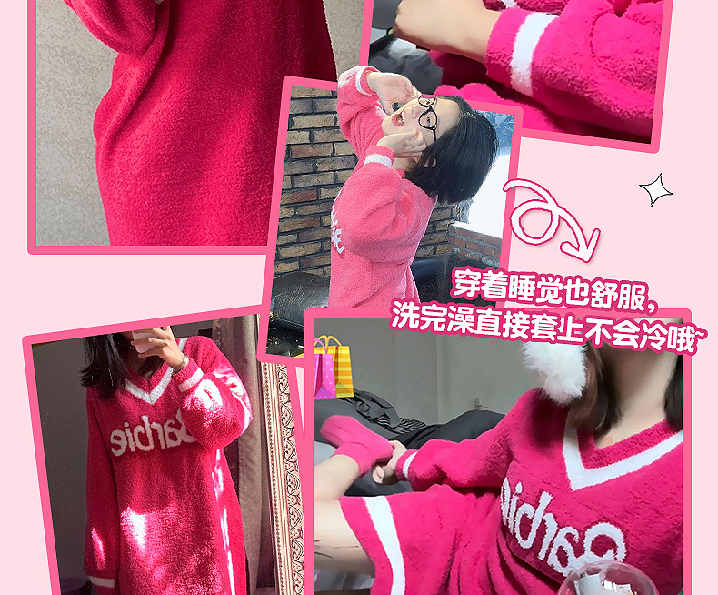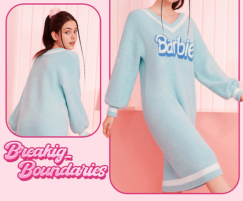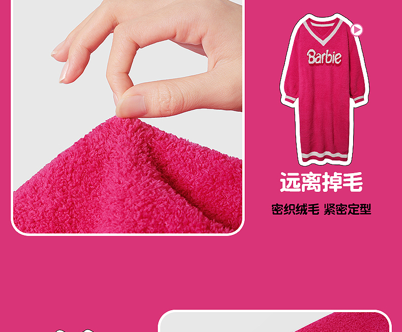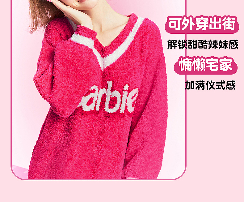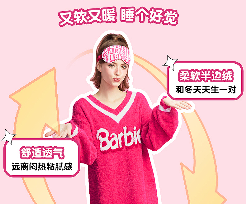 好奇蜜斯Barbie联名半边绒保暖女士家居服V领长袖简约睡裙秋冬款 Hazel 海泽儿