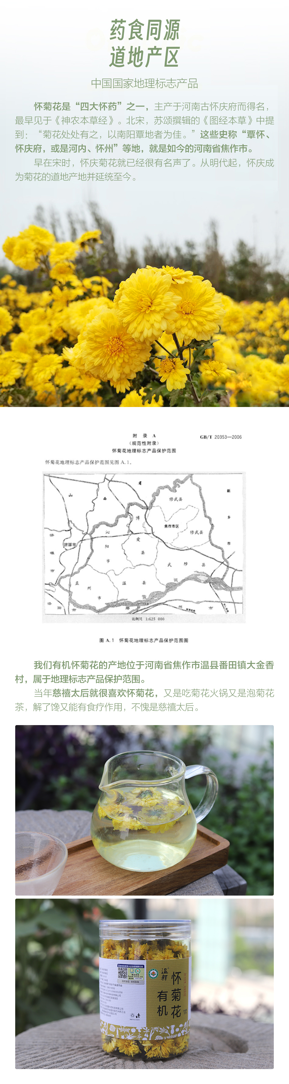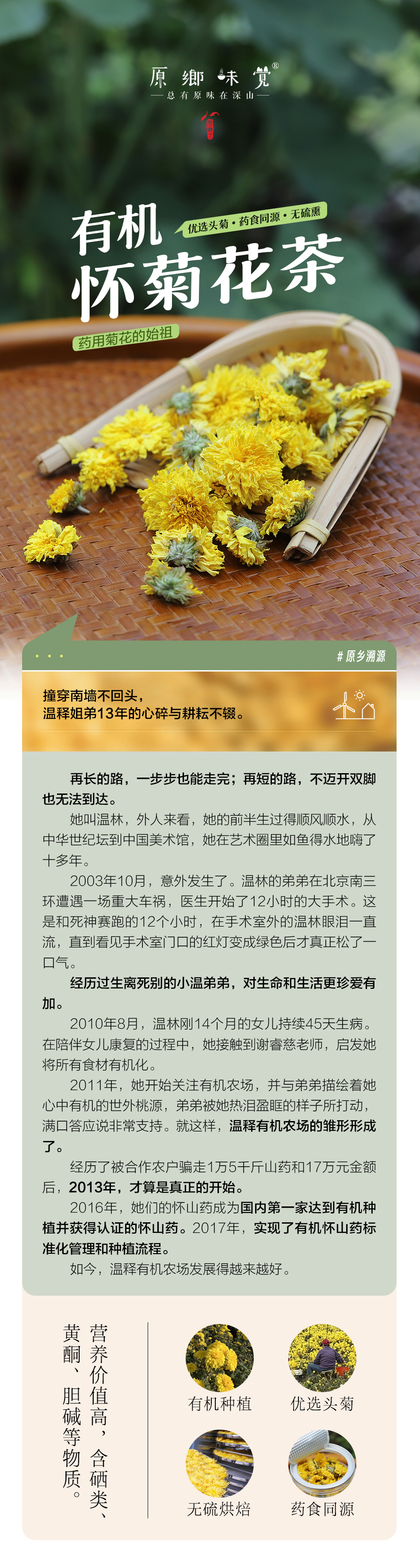 【新农人】:温林 【净含量】:30克 【配料表】:有机怀菊花 【产地】:河南省焦作市温县番田镇大金香村 【生产日期】:见包装 【保质期】:18个月 【贮存条件】:密封置于阴凉干燥通风处