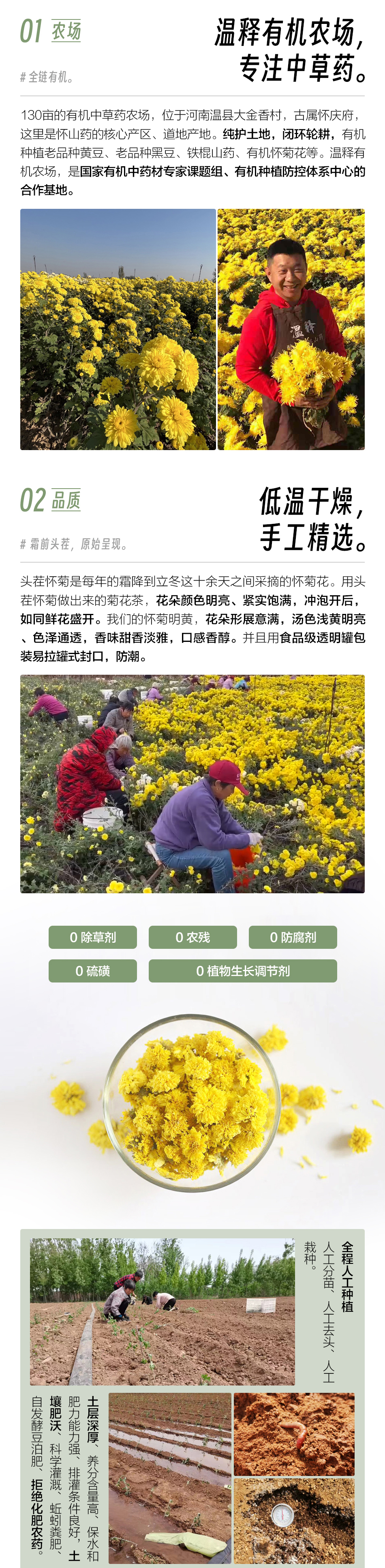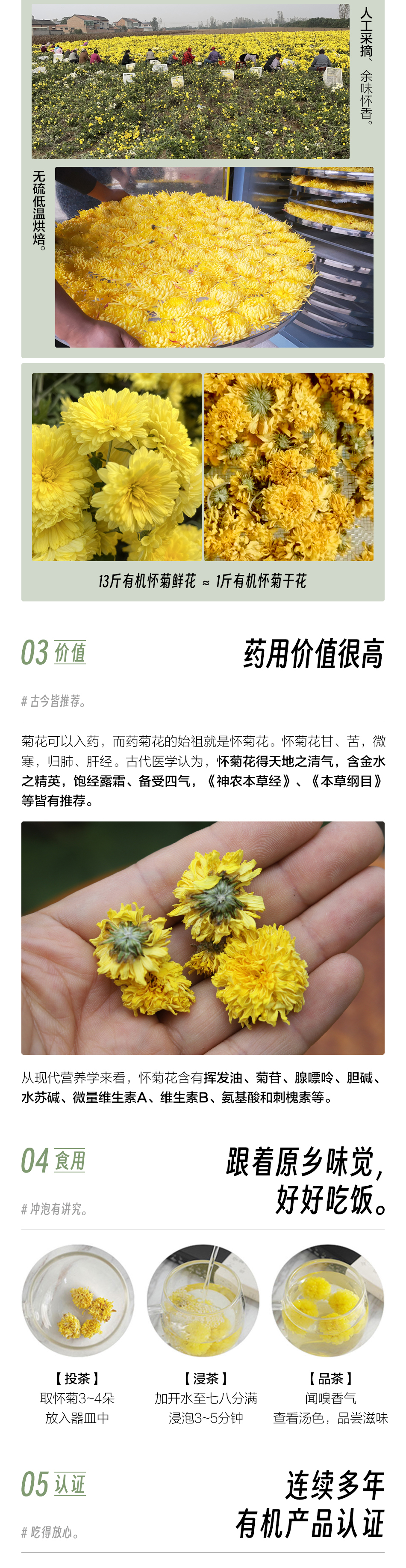 【温馨提示】: 有些菊花茶是使用硫磺熏制和烤制的,硫磺熏制的菊花掉叶少,同时颜色通黄,但是对人体有害。我们的怀菊花是使用蒸汽杀青,在烘焙机上自然烘焙的,所以我们的菊花茶会有部分掉叶,但是泡开以后只有菊花味道,对身体无害。