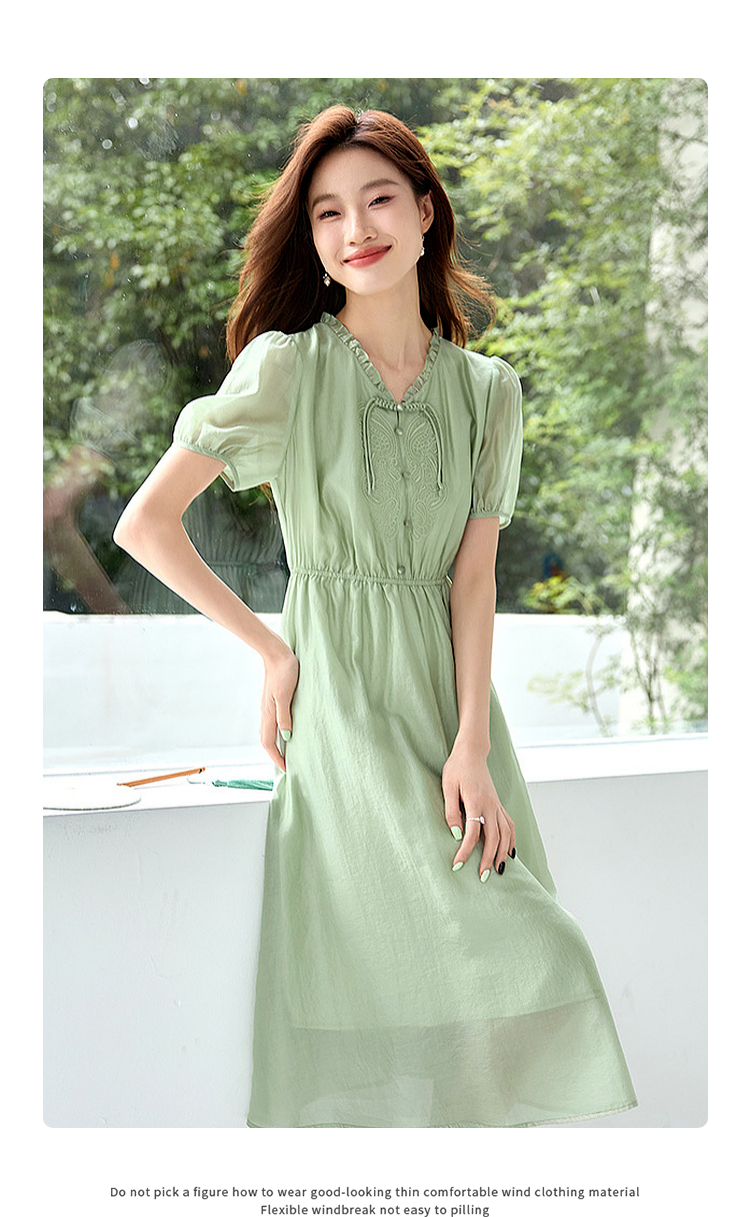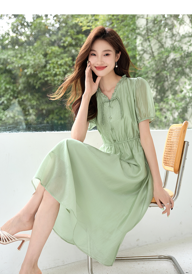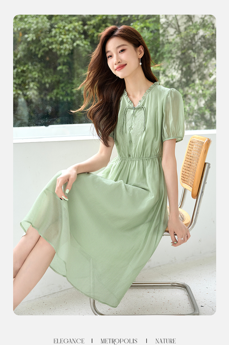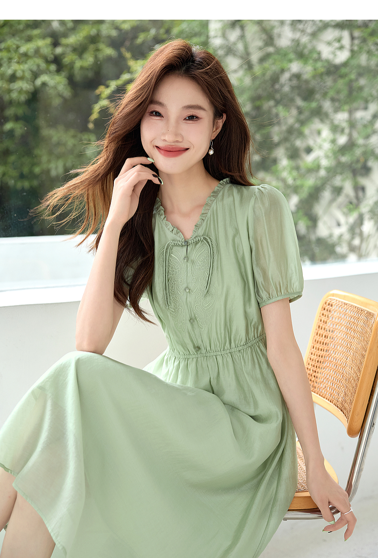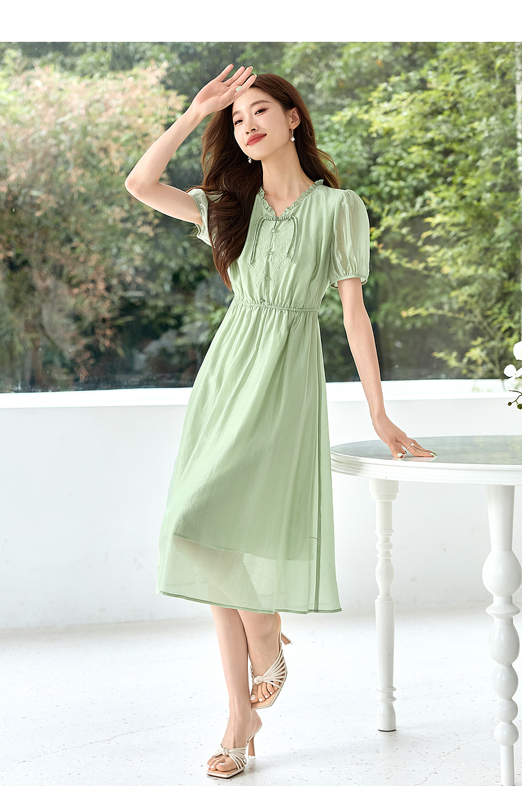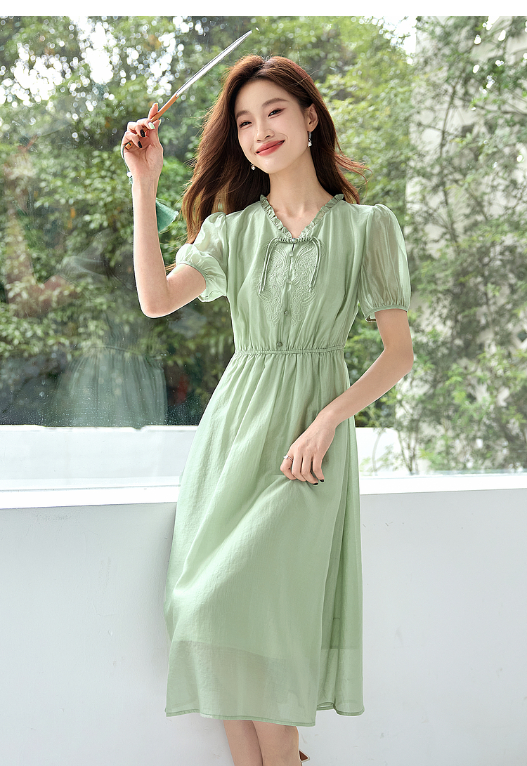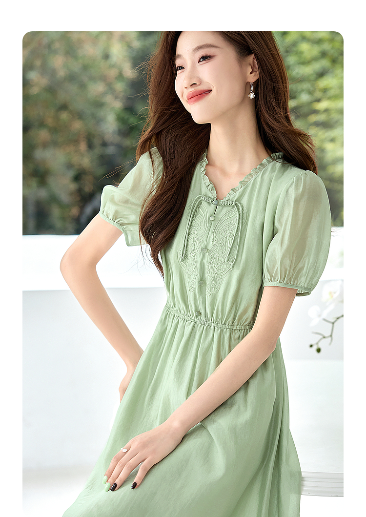 【五折购】熙世界新中式薄荷绿天丝连衣裙夏天泡泡袖刺绣V领盘扣国风裙子