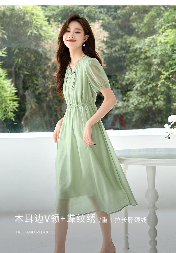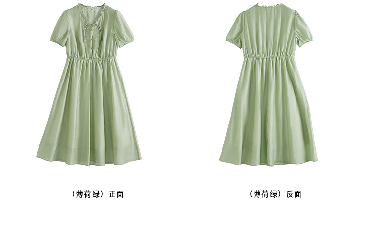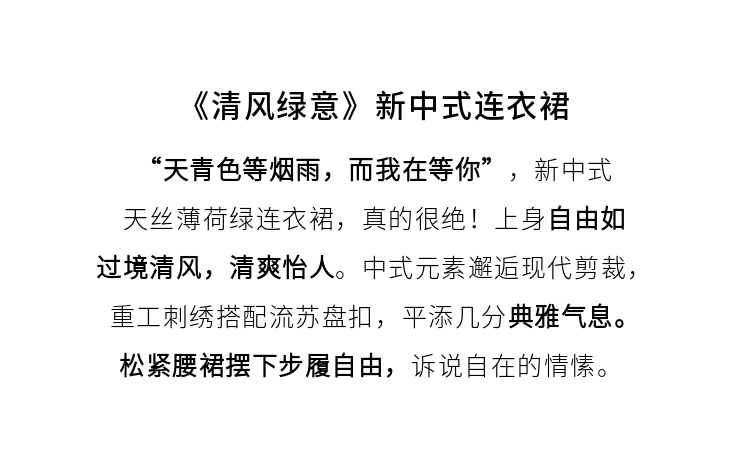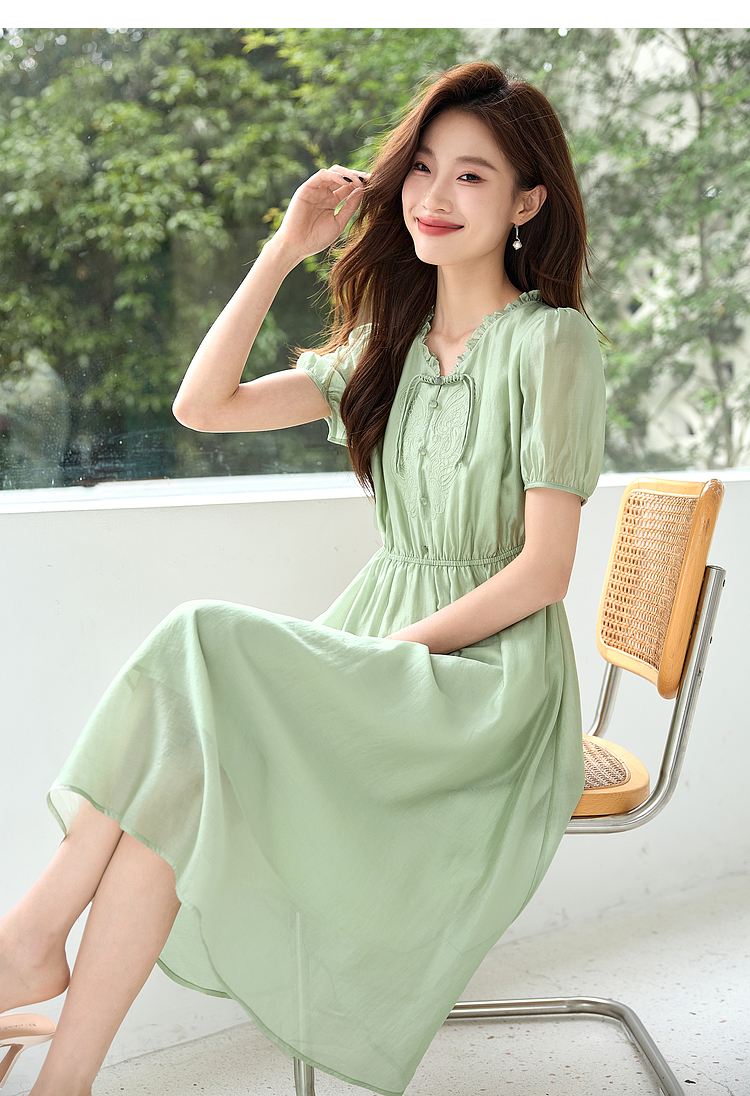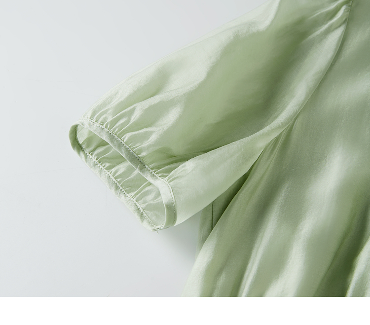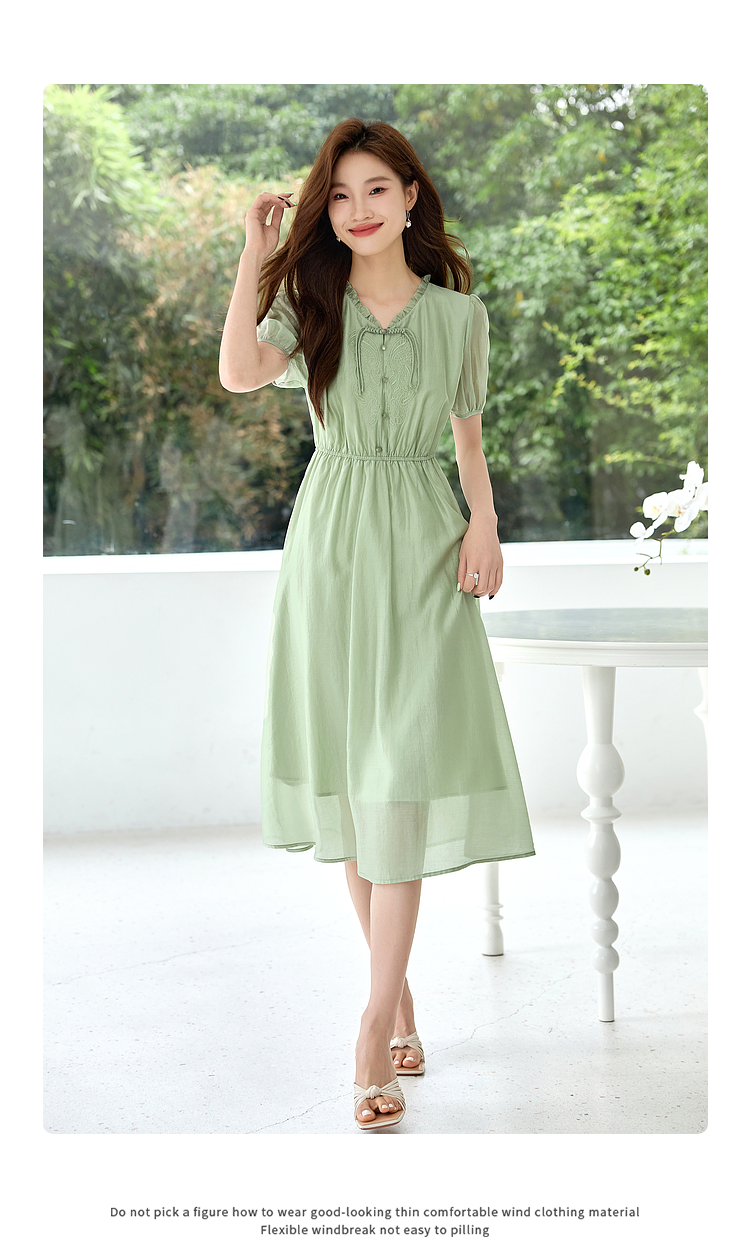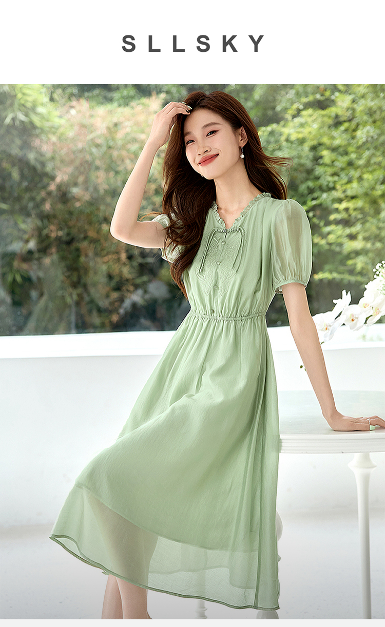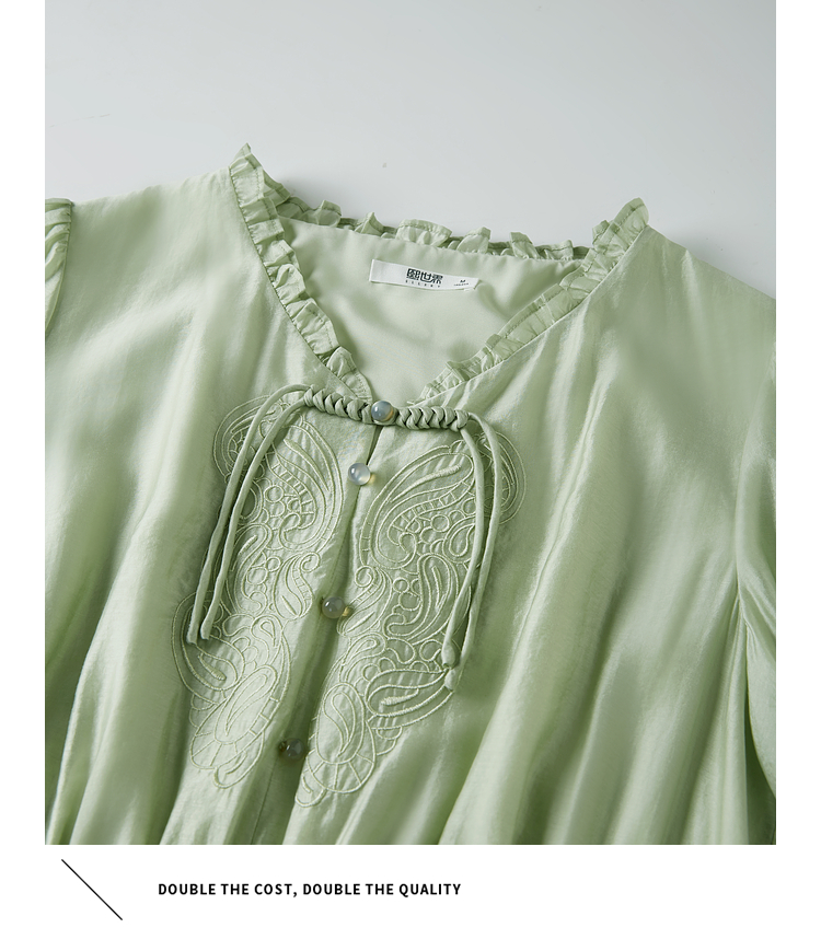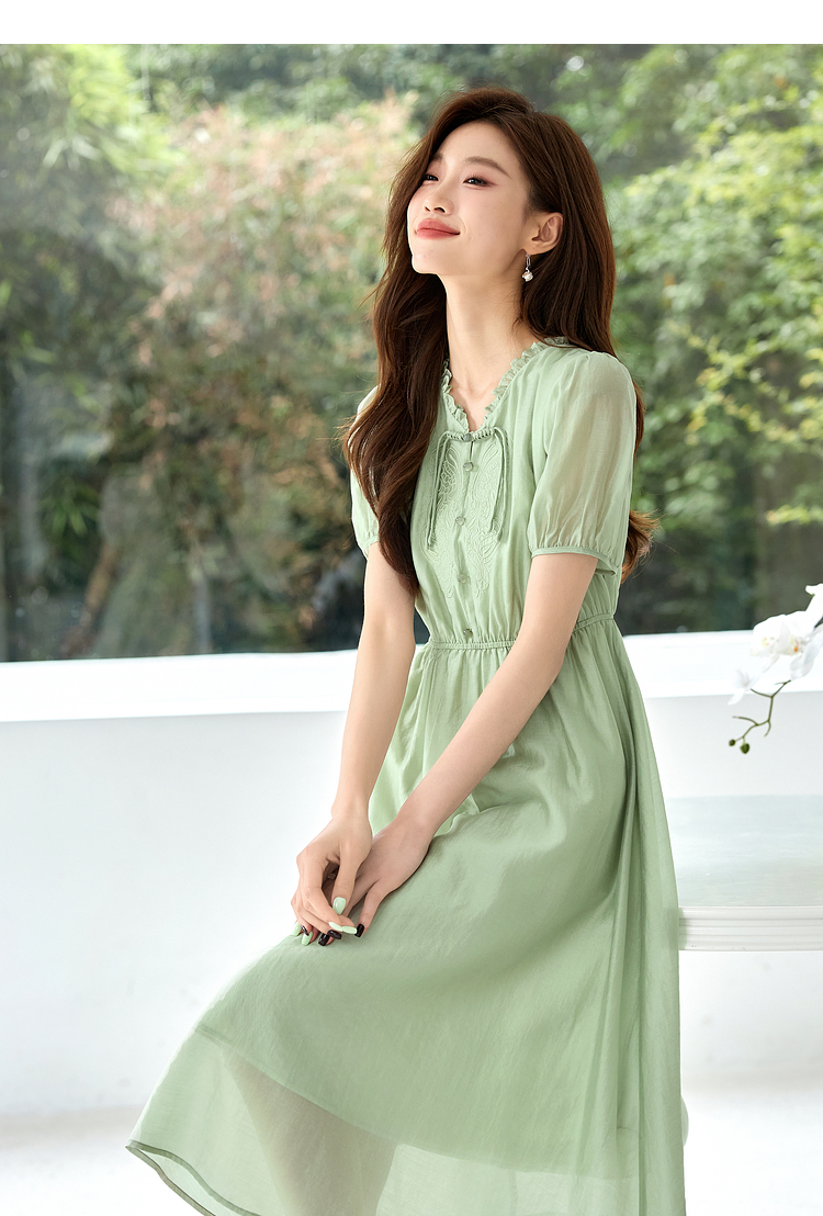 【五折购】熙世界新中式薄荷绿天丝连衣裙夏天泡泡袖刺绣V领盘扣国风裙子