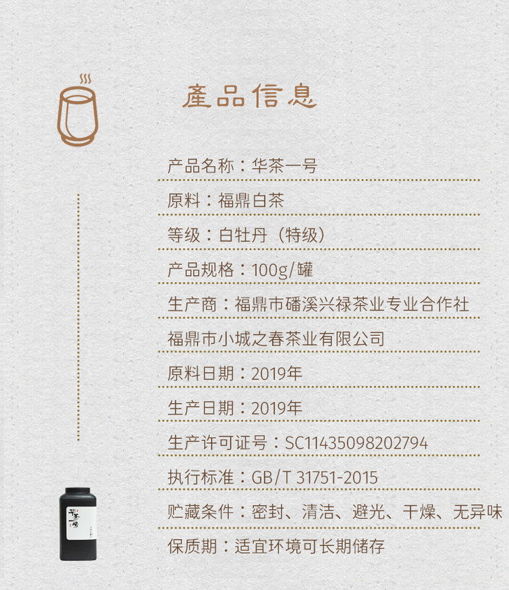白茶 | 小城之春 2019年 华茶一号 白牡丹(散茶) 100g