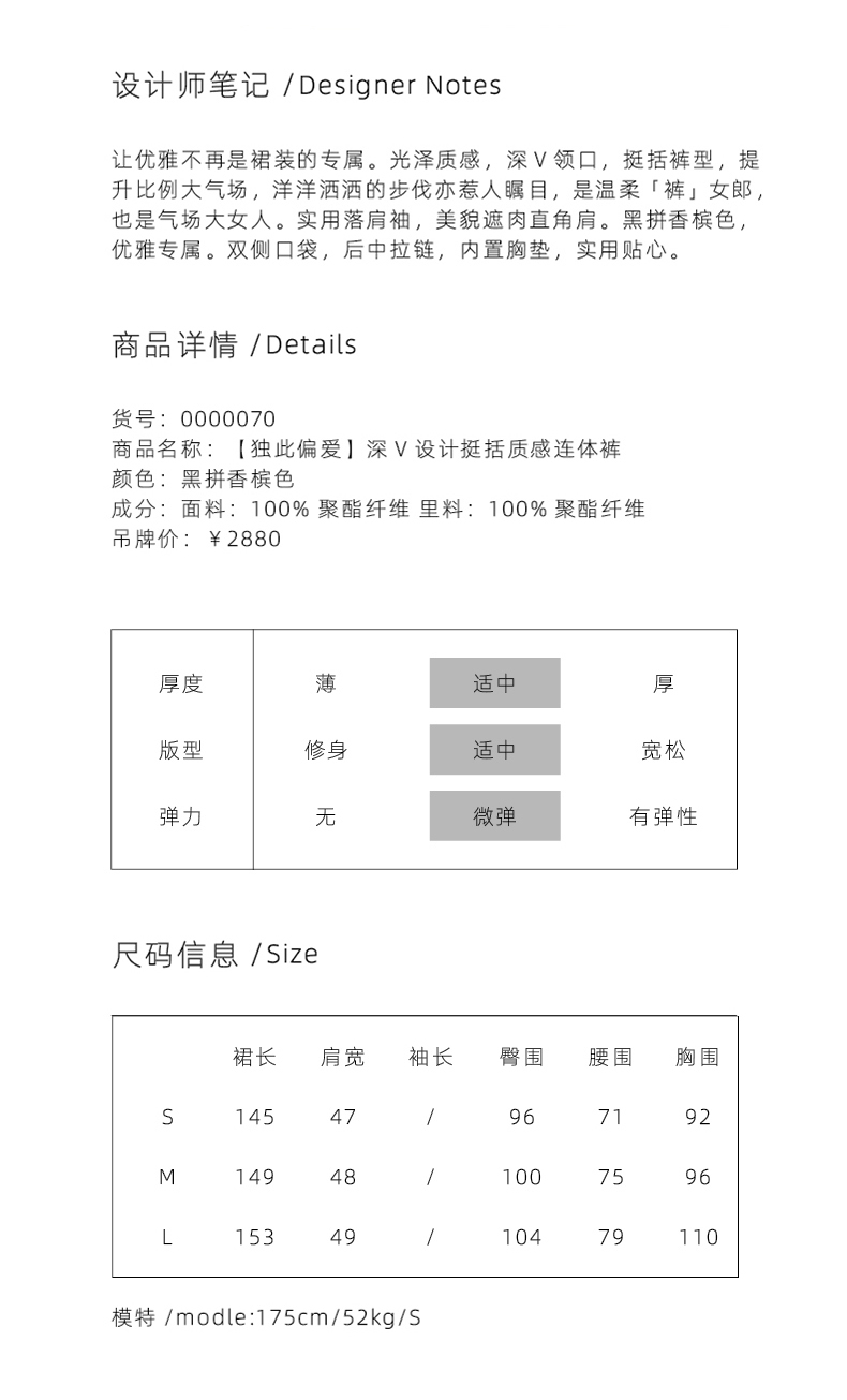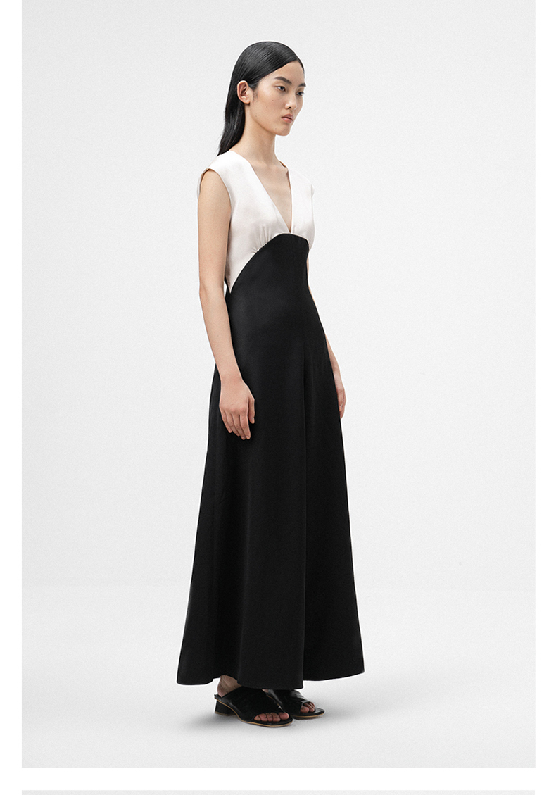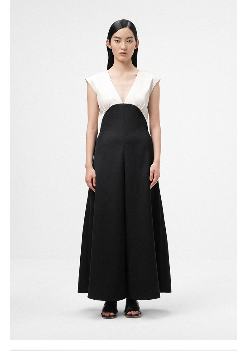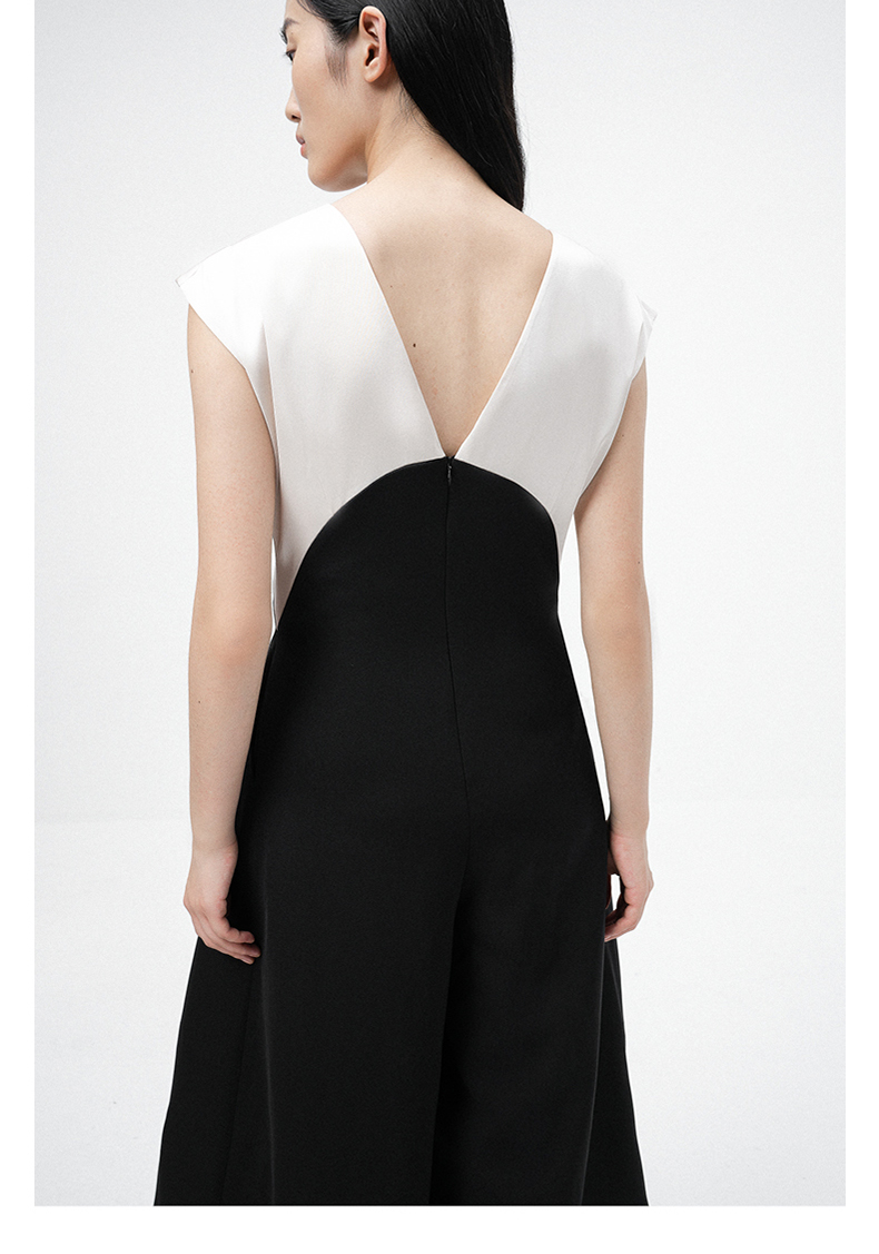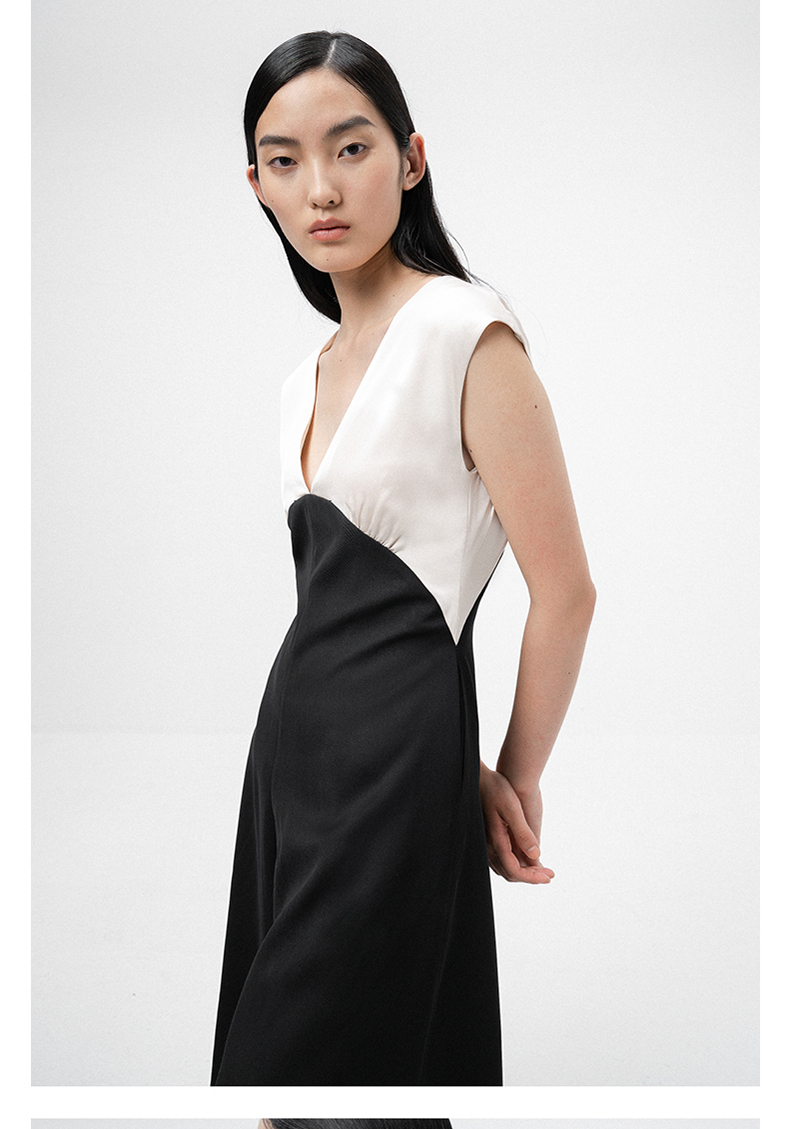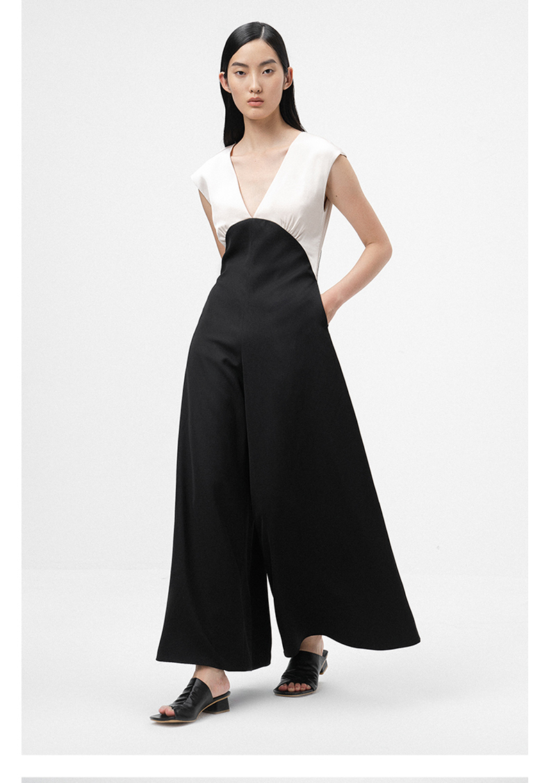 【独此偏爱】深V设计黑拼香槟色挺括质感连体裤/ 0000070
