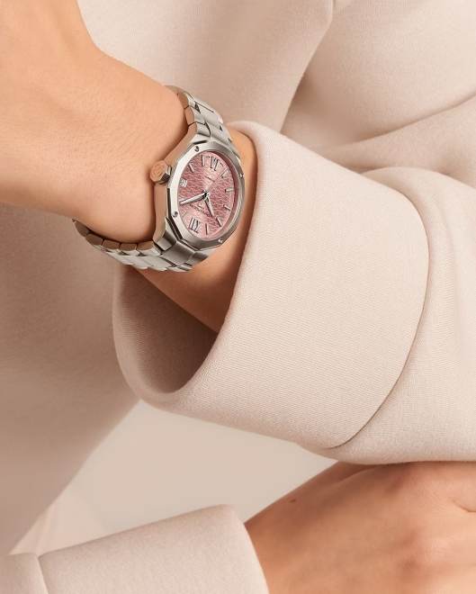 镜面材质 | 蓝宝石水晶玻璃 | 表盘 | 精钢表壳 饰有独特图案的粉太阳缎面打磨的漆质粉色表盘与透明的山海饰纹,铆钉式罗马数字与覆有夜光涂层 (C1, 蓝光),多面的镀铑指针,日期视窗位于3点钟位置 四颗螺钉十二边形表圈 八边形的自由表冠饰有PHI 品牌标识浮雕 |