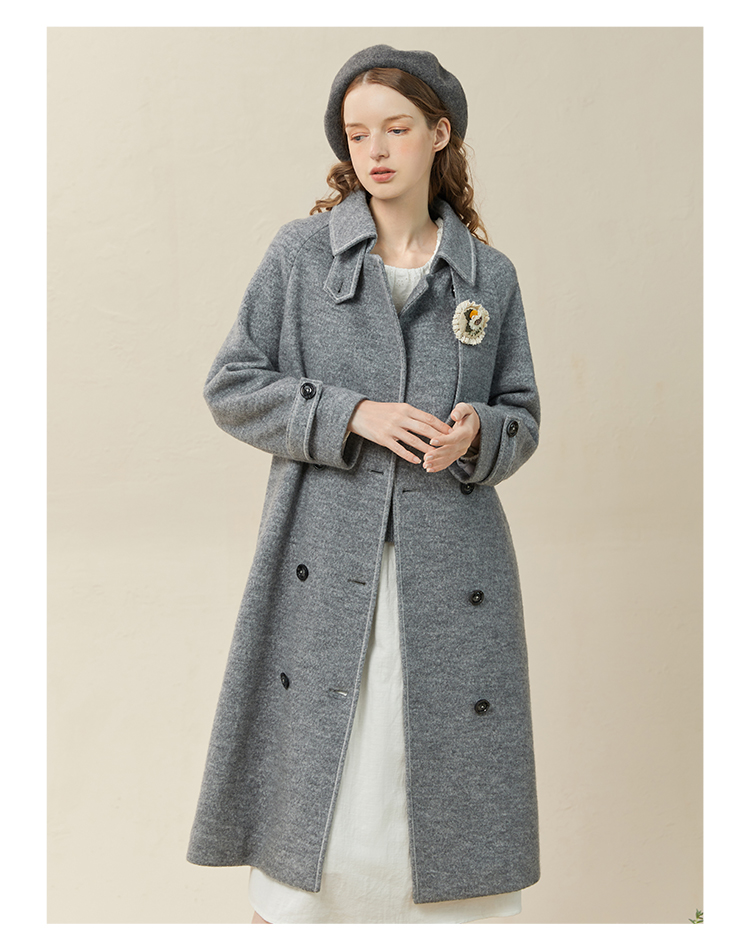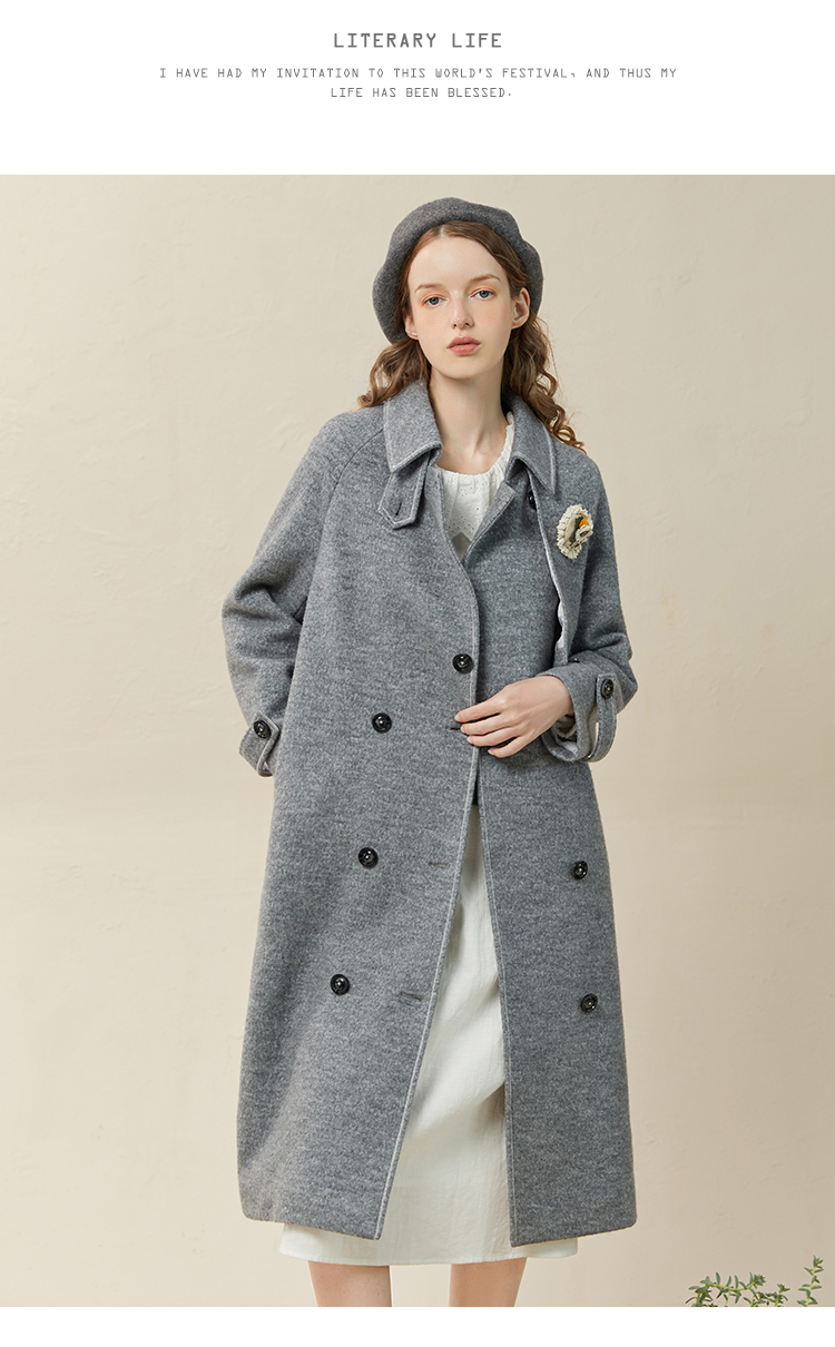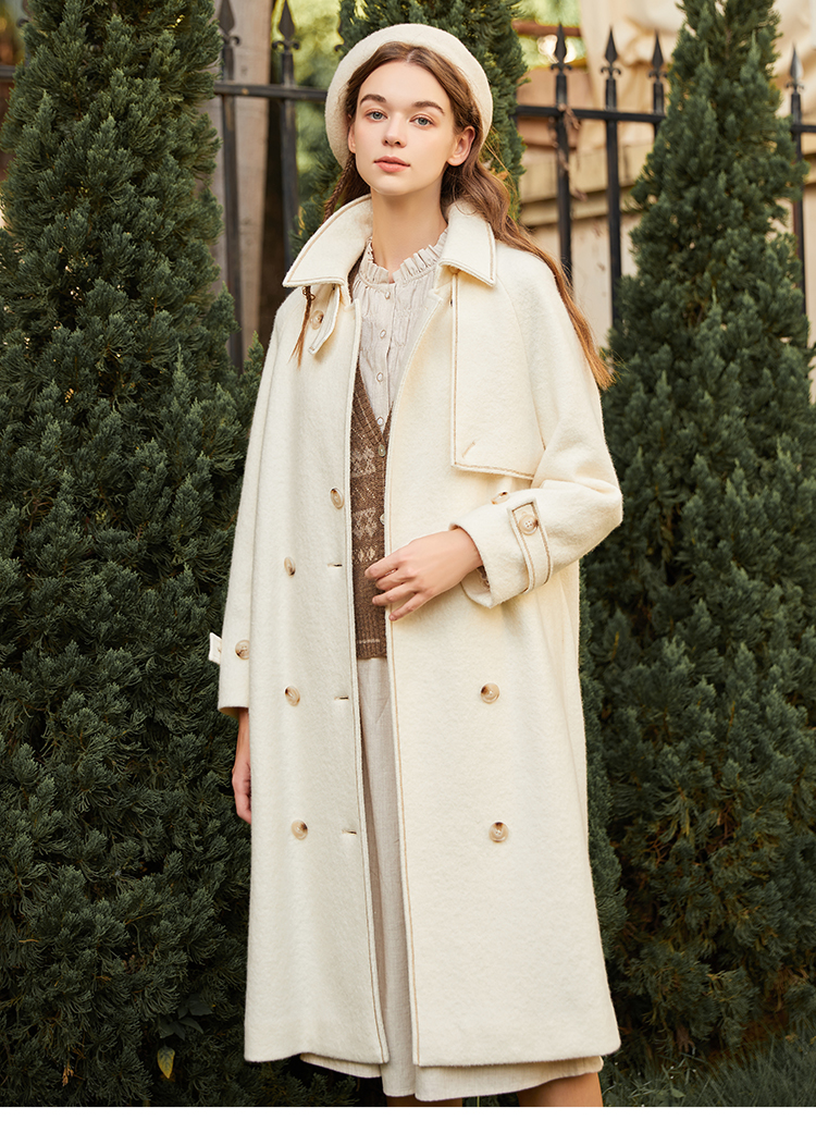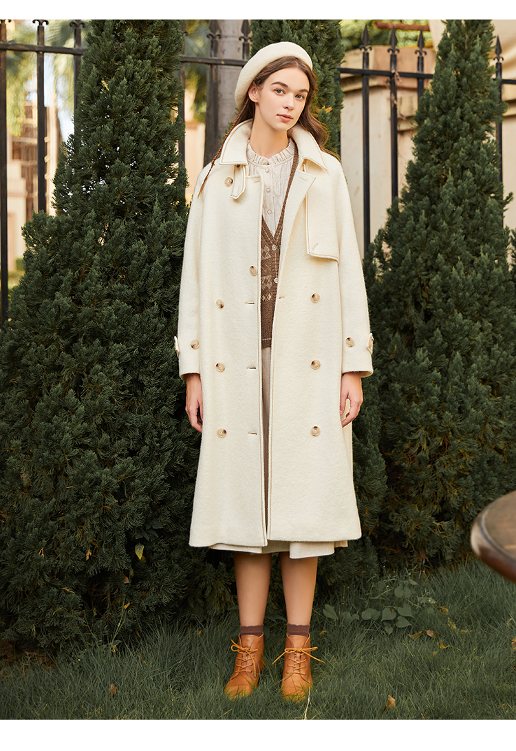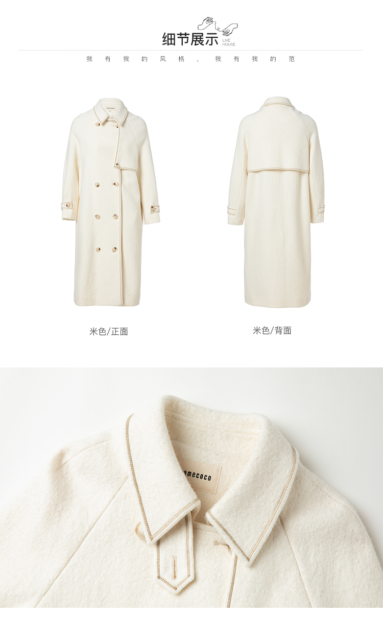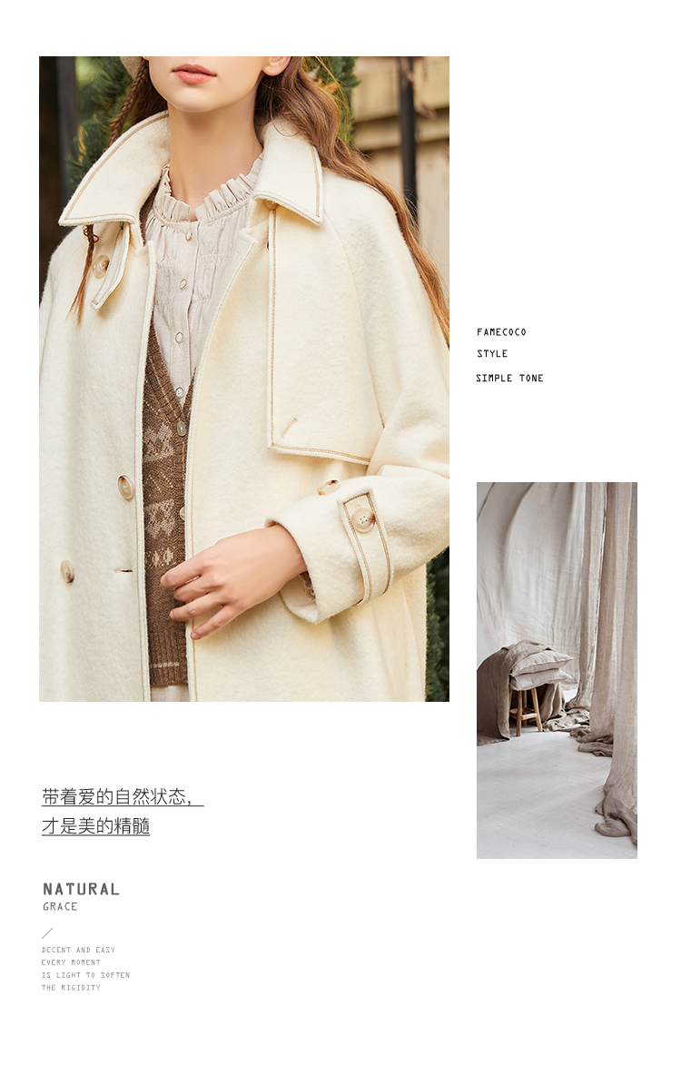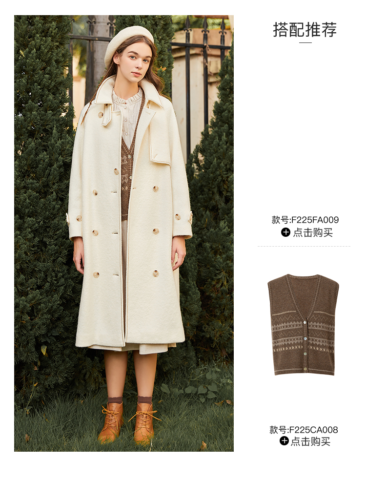 Famecoco范可儿羊毛呢子大衣女冬中长款双排扣方领肌理感外套F228AN001