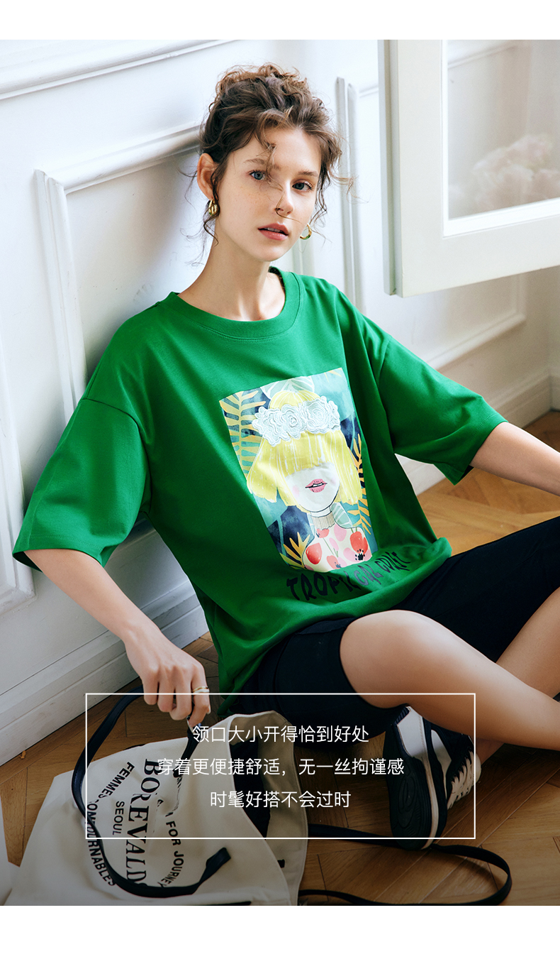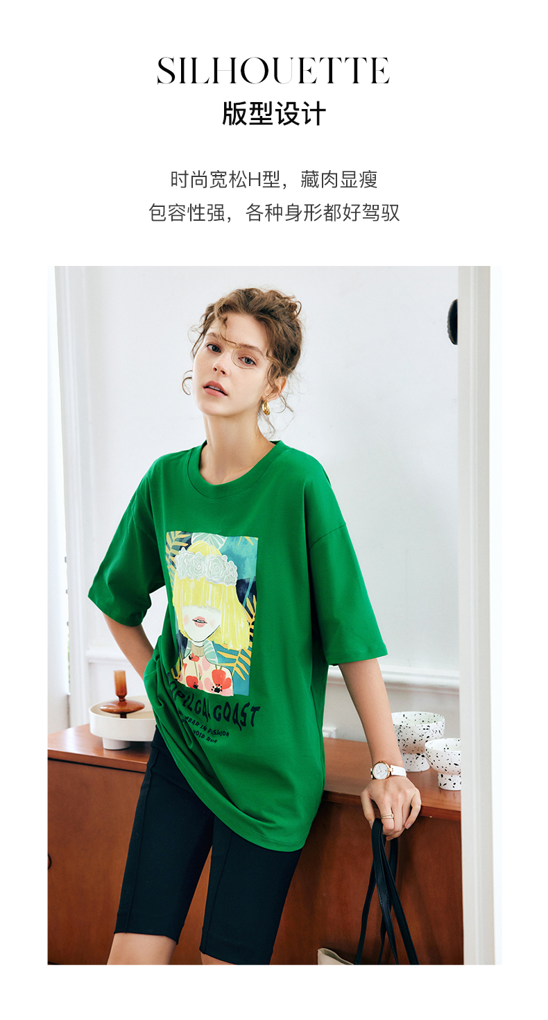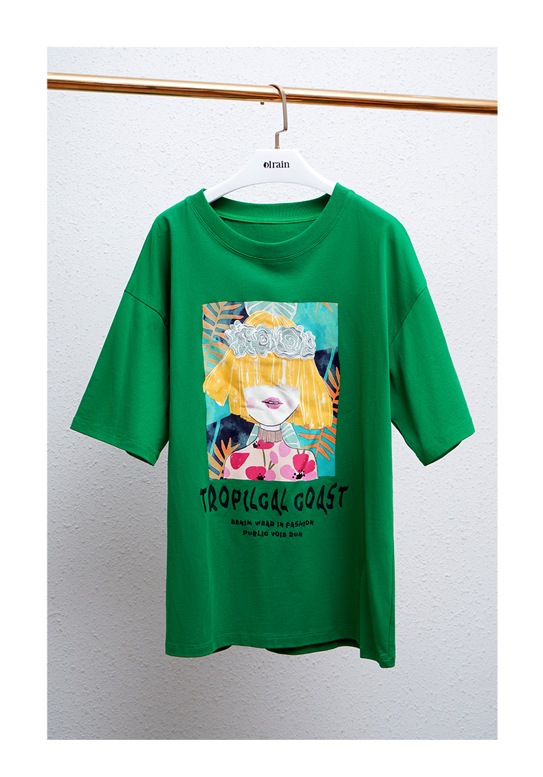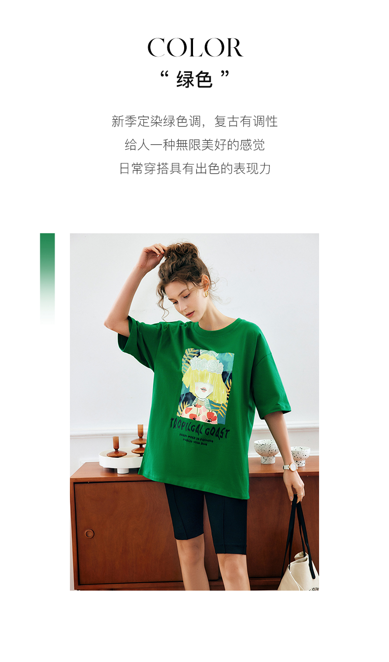 OLrain法式绿色短袖T恤女夏季2022新款宽松显瘦圆领印花短袖上衣