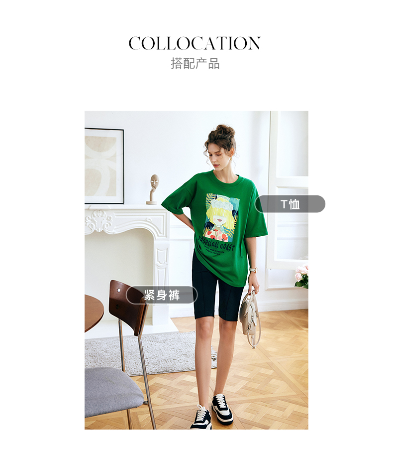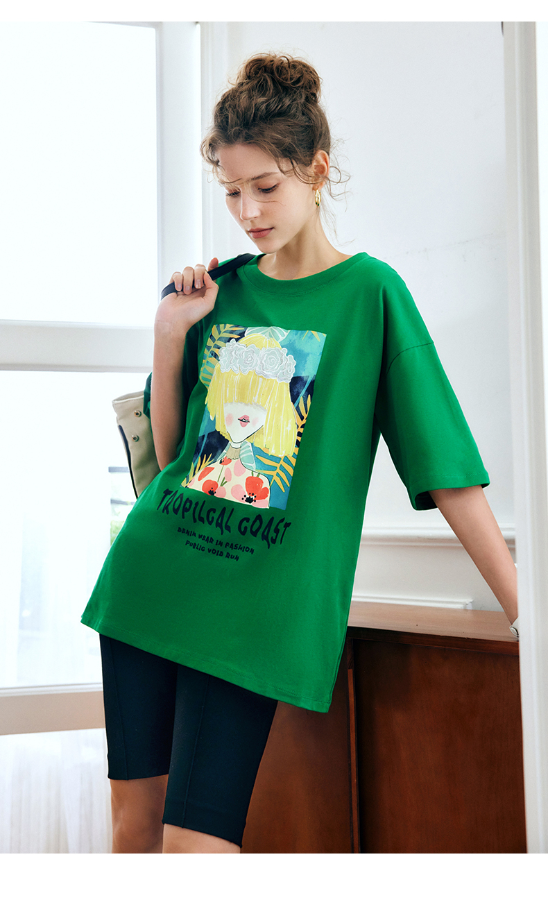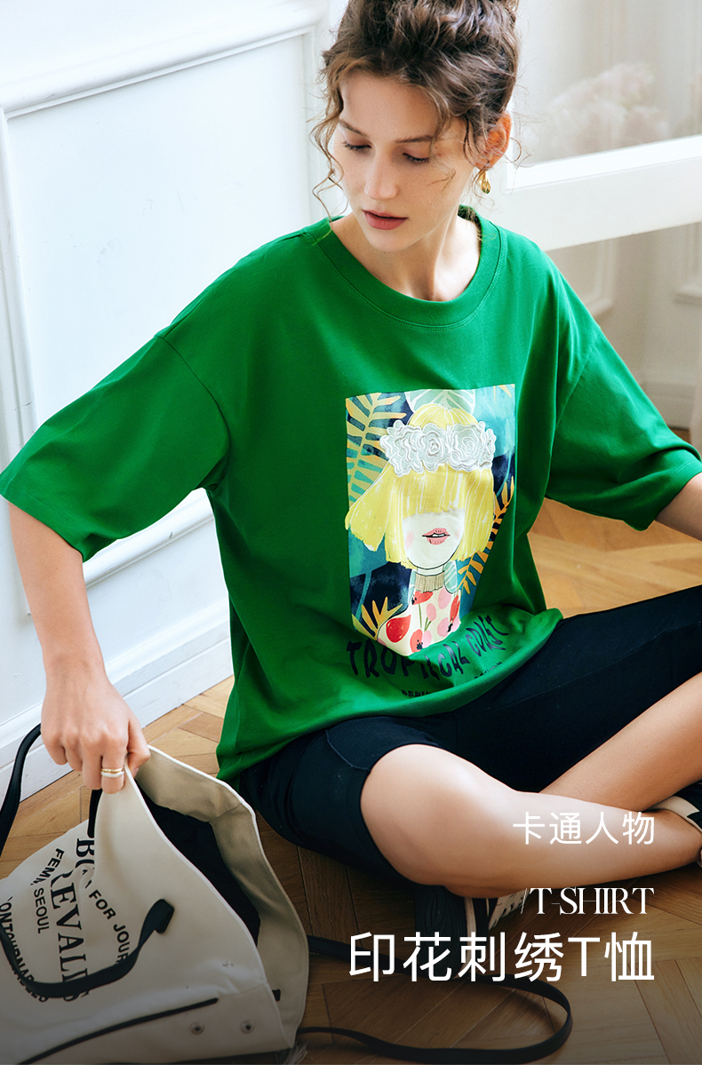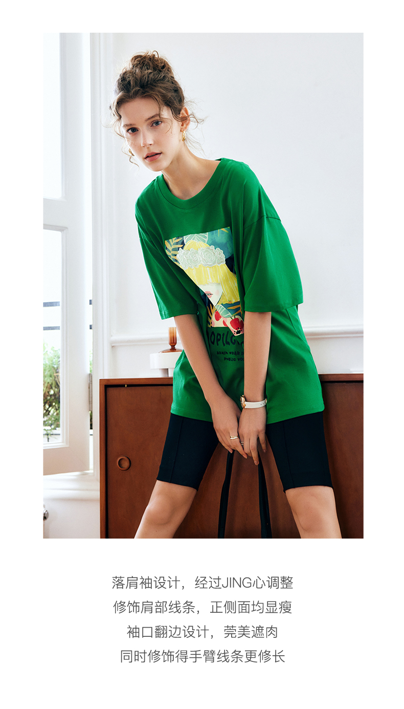 OLrain法式绿色短袖T恤女夏季2022新款宽松显瘦圆领印花短袖上衣