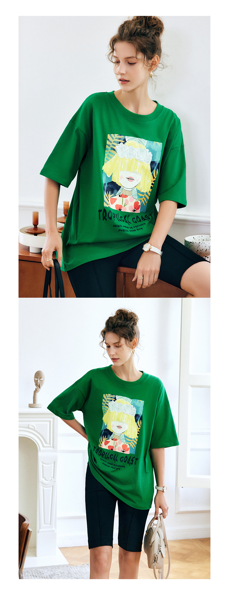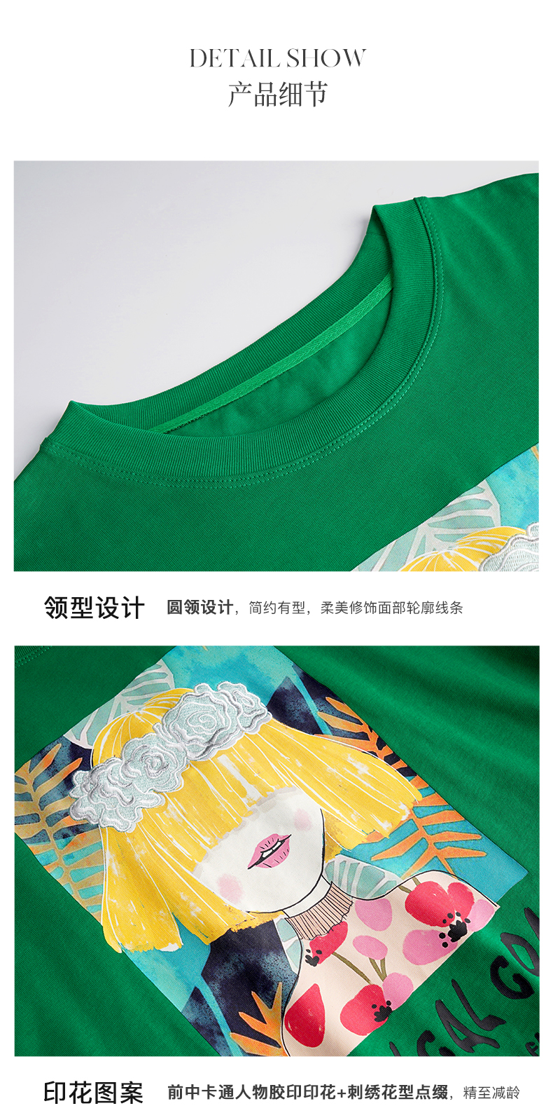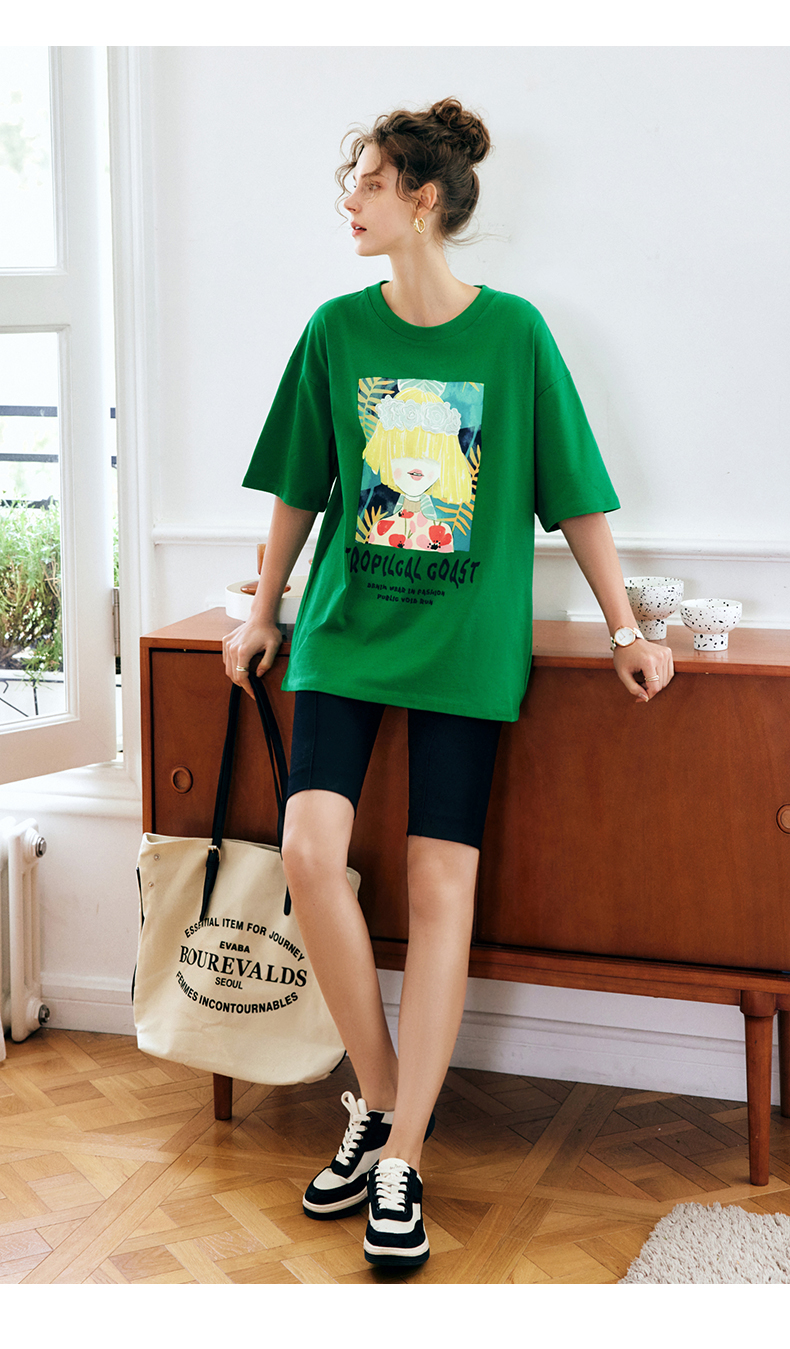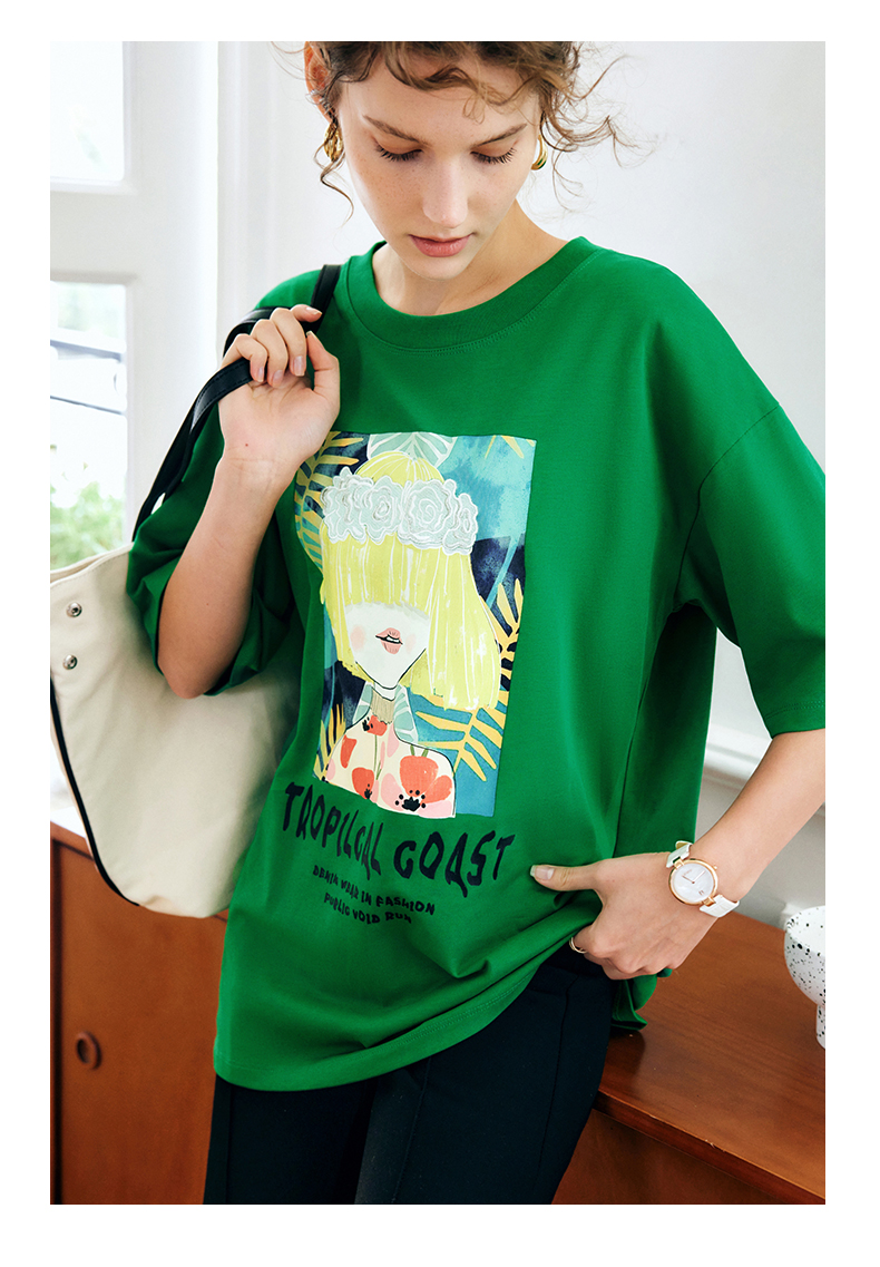 OLrain法式绿色短袖T恤女夏季2022新款宽松显瘦圆领印花短袖上衣