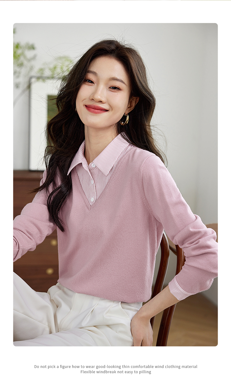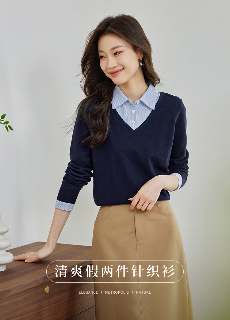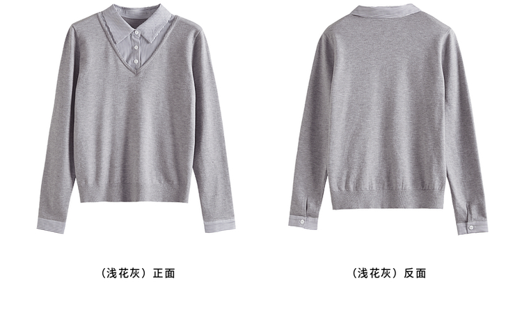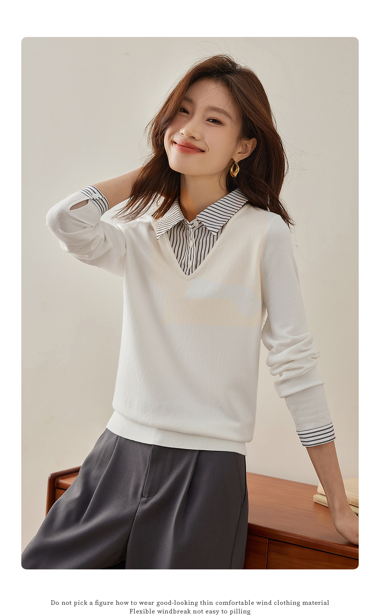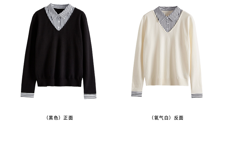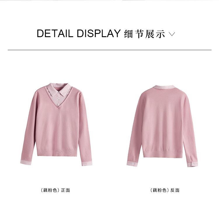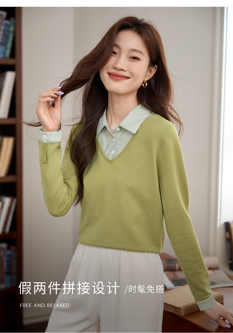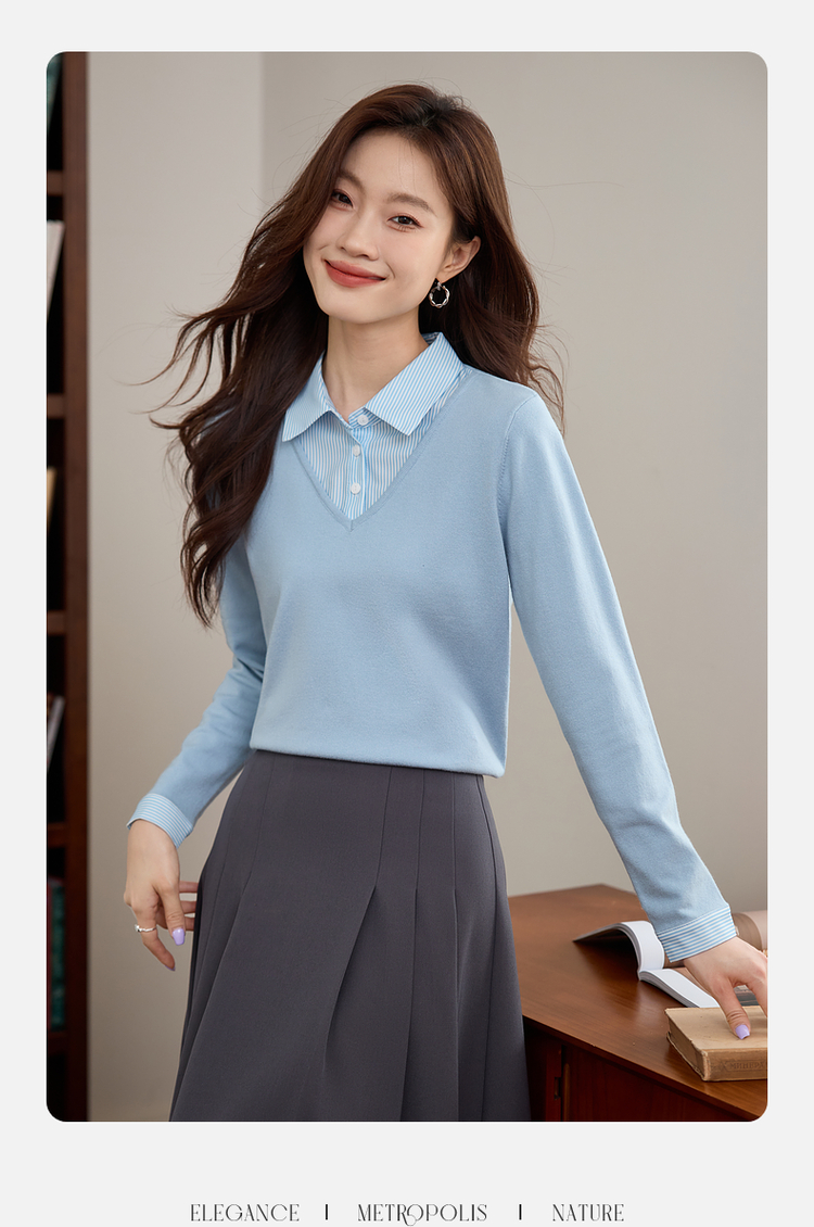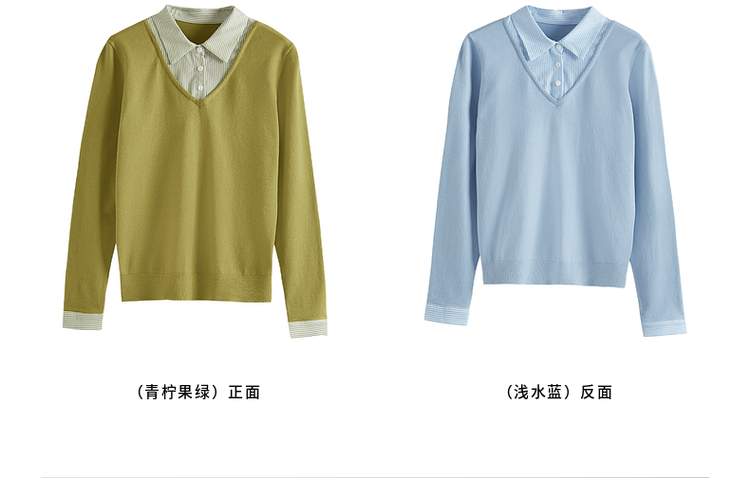 【周四狂欢价】熙世界通勤衬衫领拼接假两件针织衫秋季新款内搭长袖打底衫上衣